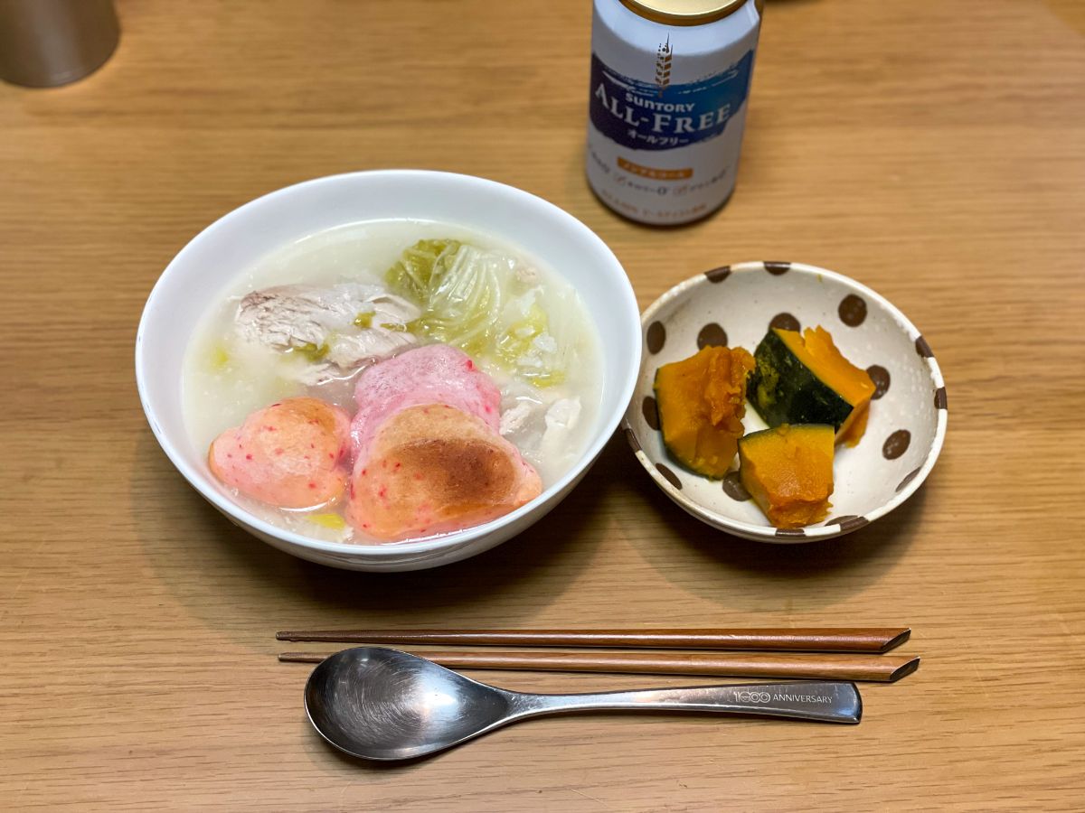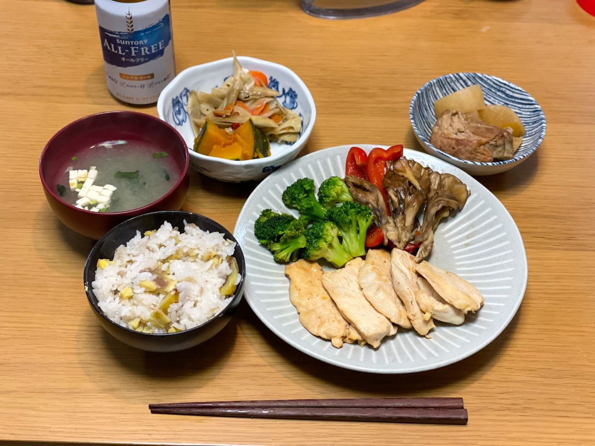 20:00 栗ご飯、鯖ノンフライ竜田揚げ、スペアリブ大根、味噌汁(小松菜、しめじ)