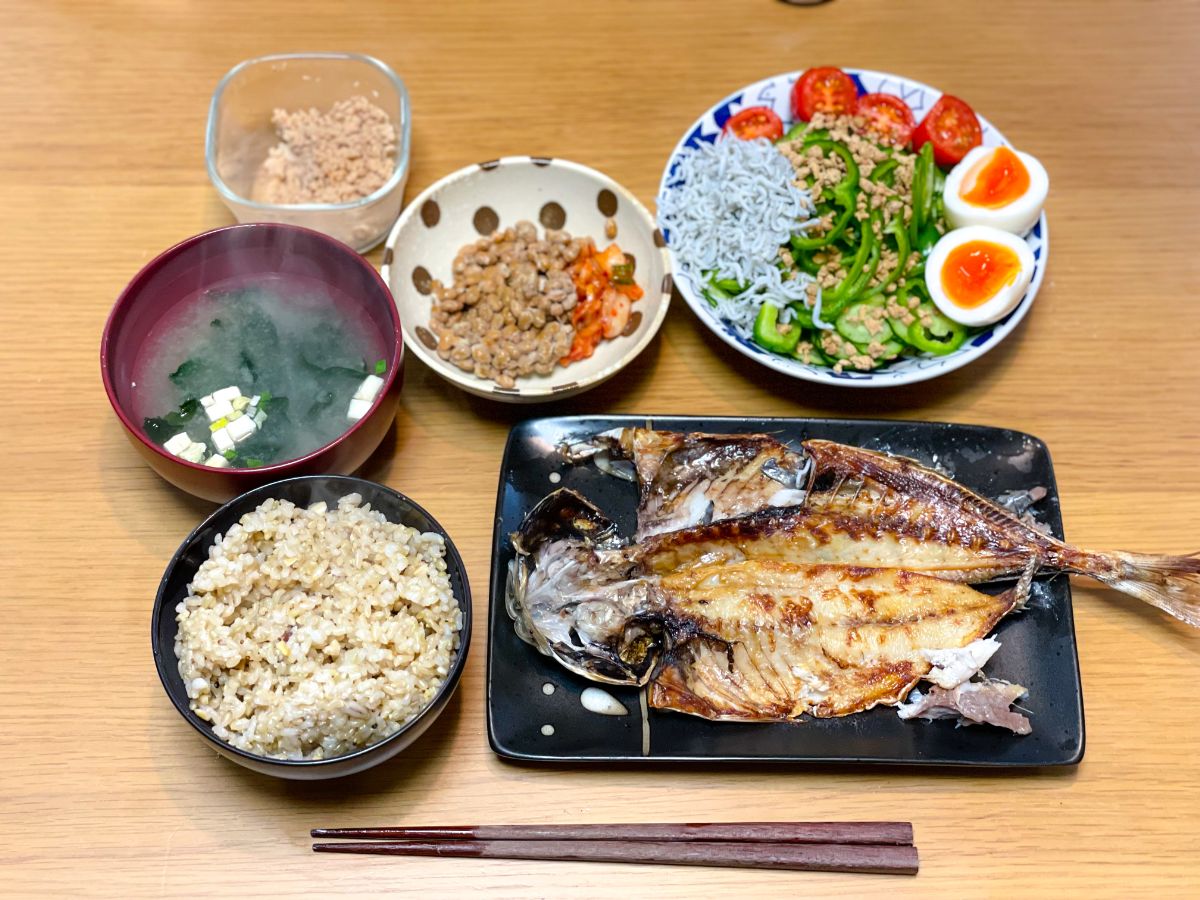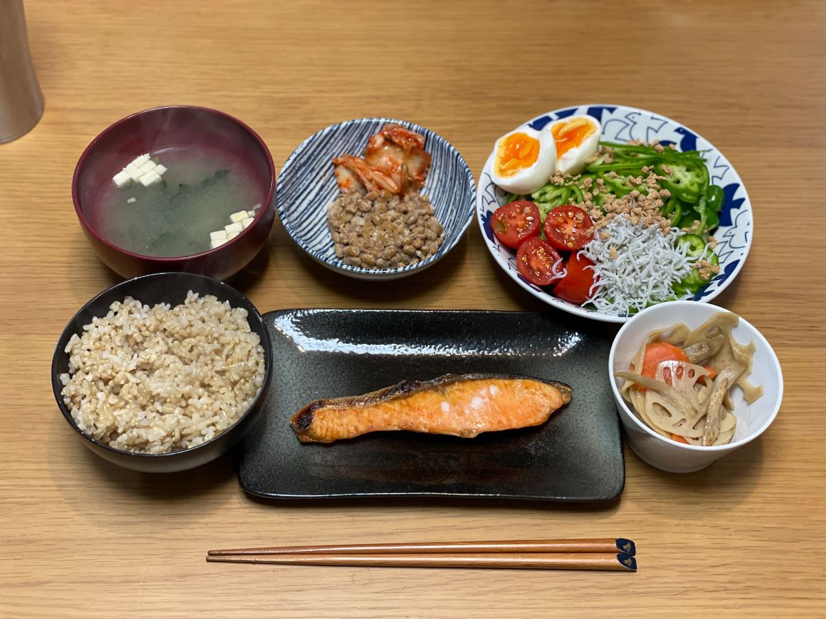 7:30 塩鮭、サラダ、納豆キムチ、鶏そぼろ、玄米ご飯、味噌汁
