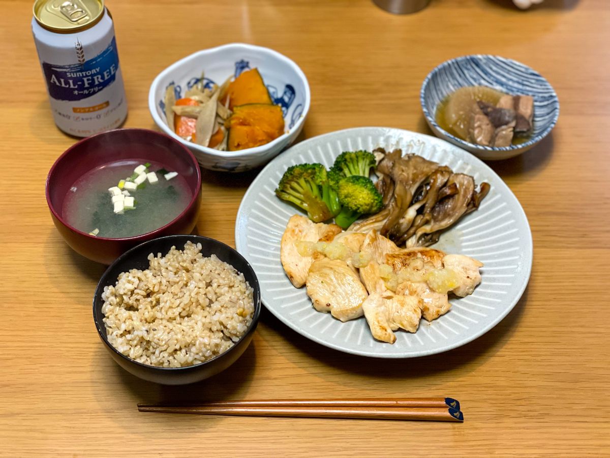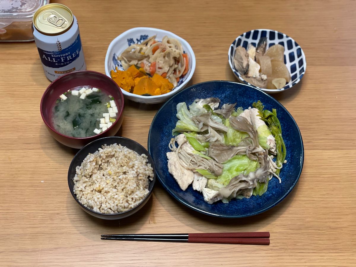 12:30 鶏むねノンフライ唐揚げ、きんぴら、かぼちゃ煮物、ぶり大根、味噌汁、玄米ご飯