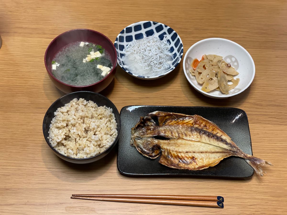 9:45 いつものスムージー、サバ塩焼き、しらす大根おろし、味噌汁、玄米ご飯