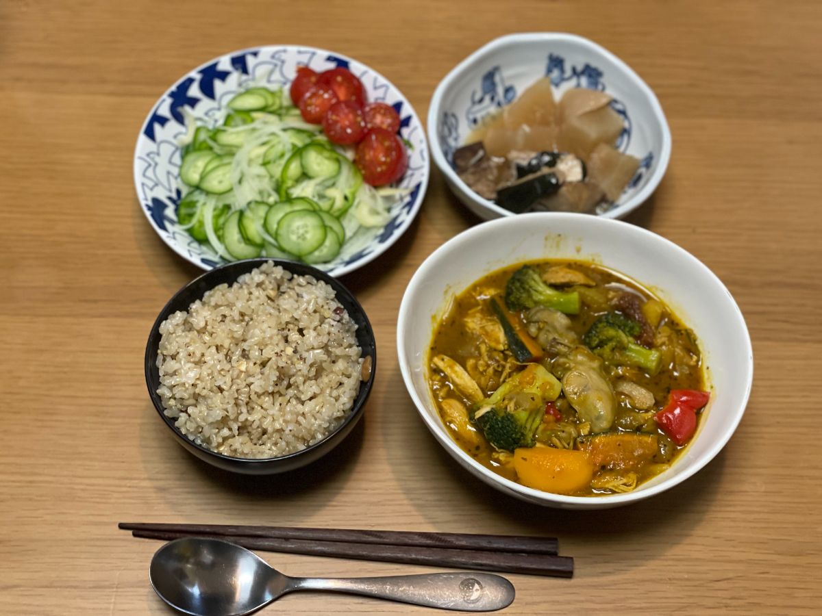 12:00 鶏むねスパイシー焼き、ピクルス、ぶり大根、かぼちゃ煮物、きのこ味噌汁、玄米ご飯
