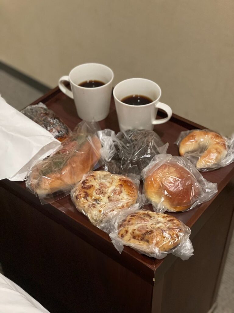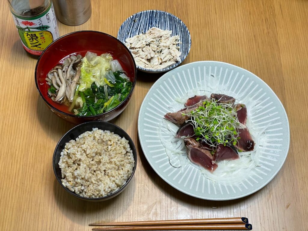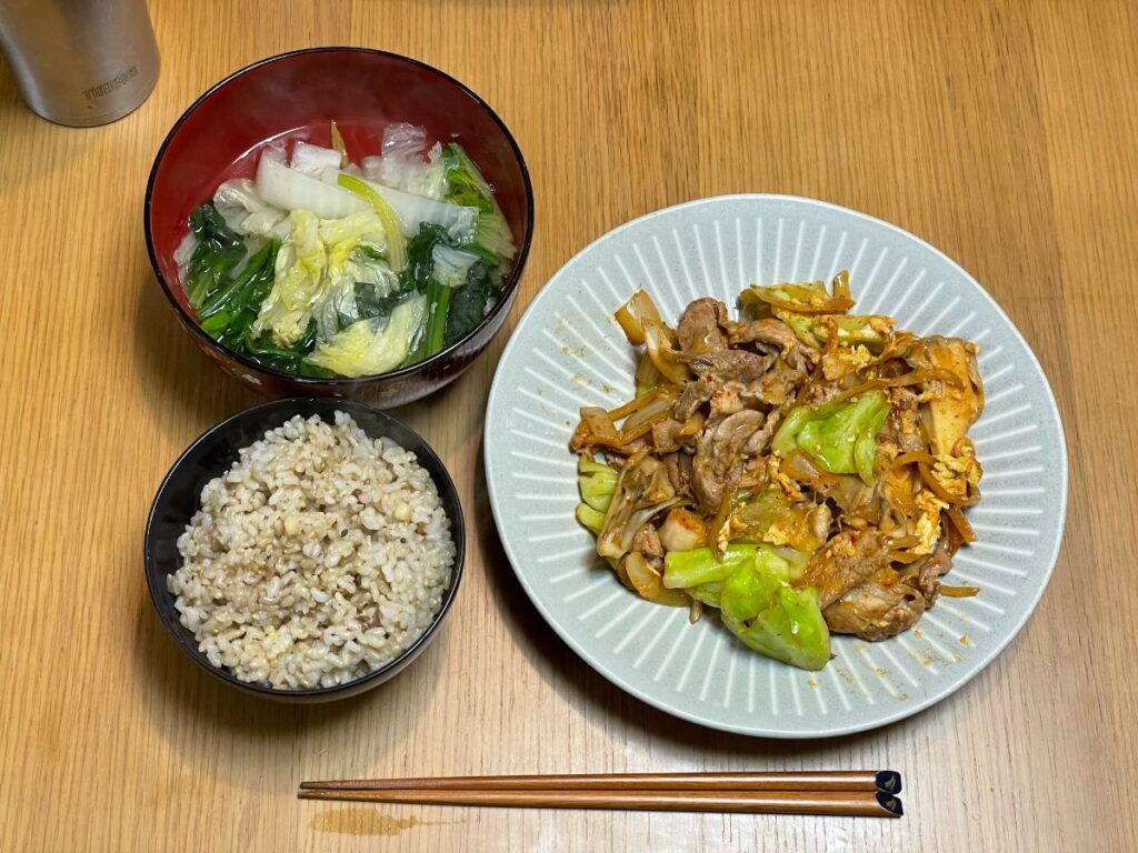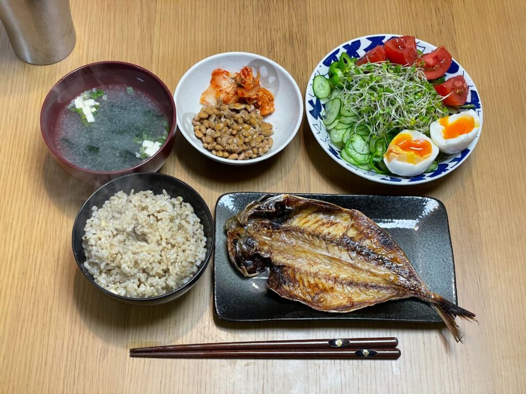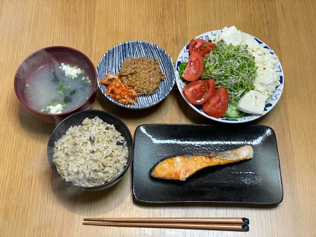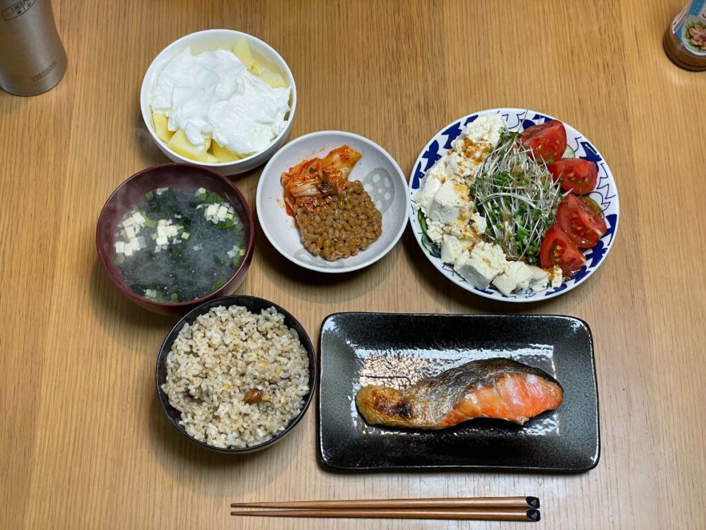 7:00 塩鮭、サラダ、ゆで卵、納豆キムチ、味噌汁、玄米ご飯、BBりんごヨーグルト