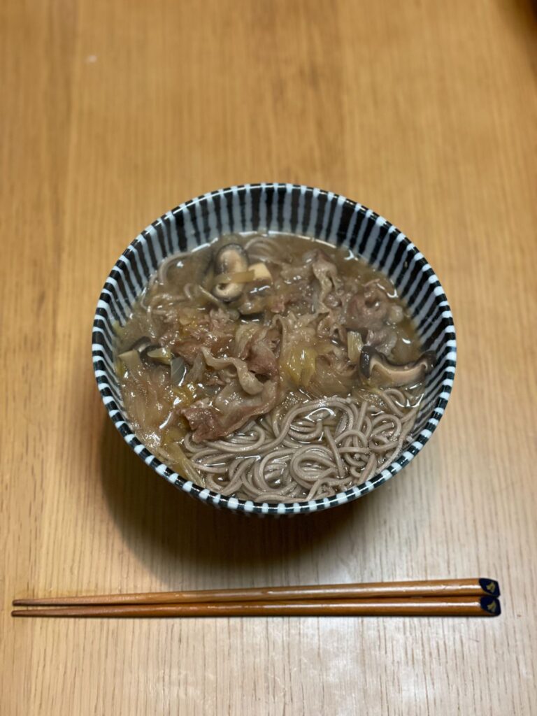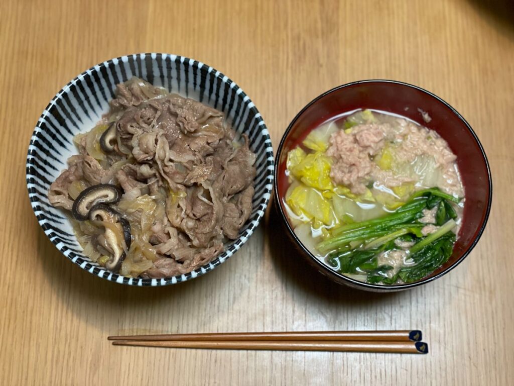 18:00 牛丼、白菜と小松菜とツナ缶のスープ