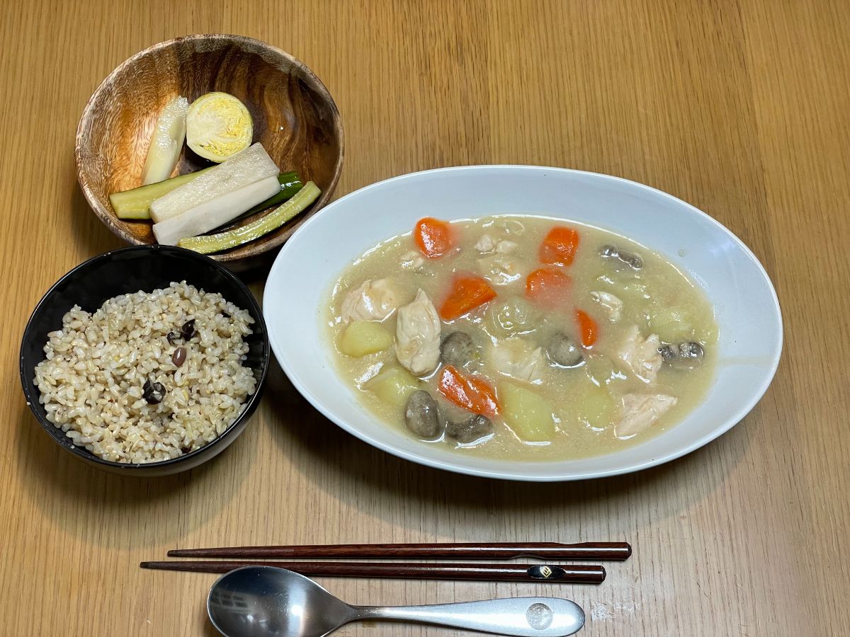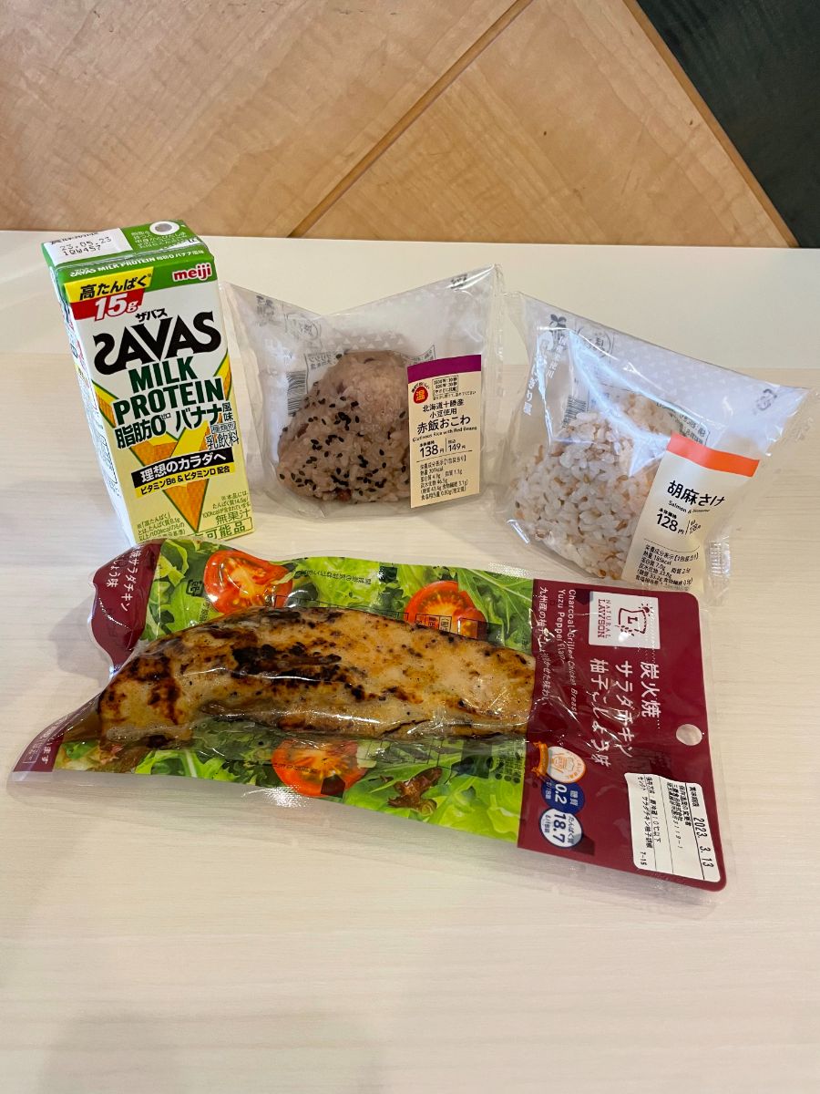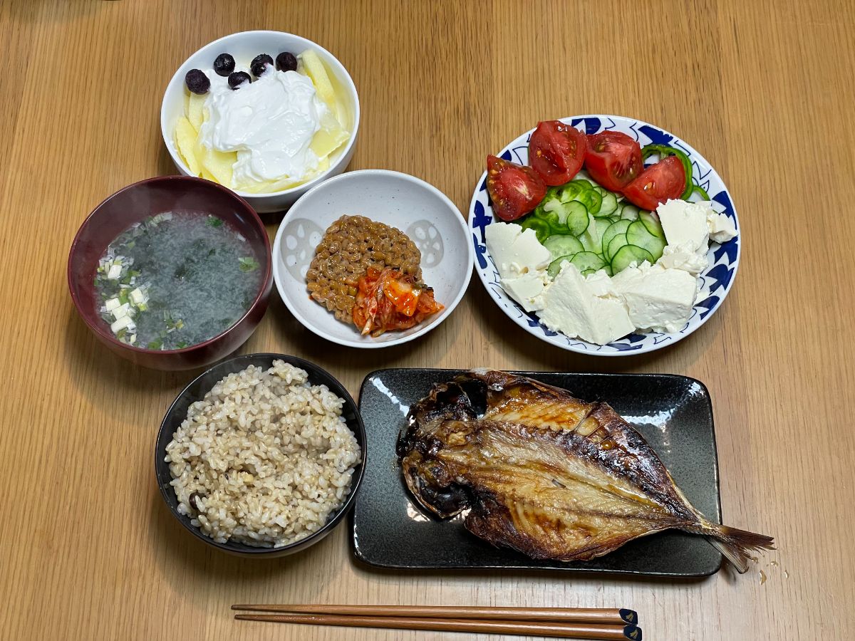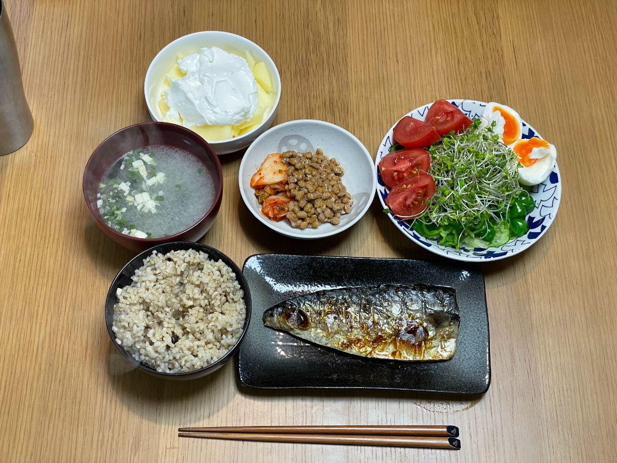 7:00 塩鮭、サラダ、ゆで卵、納豆キムチ、味噌汁、玄米ご飯、BBりんごヨーグルト