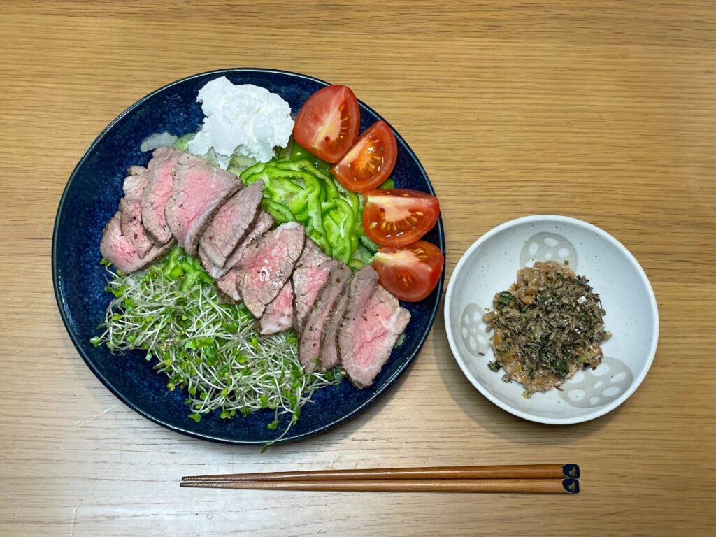 8:00 プロテインスムージー、ローストビーフサラダ、納豆
