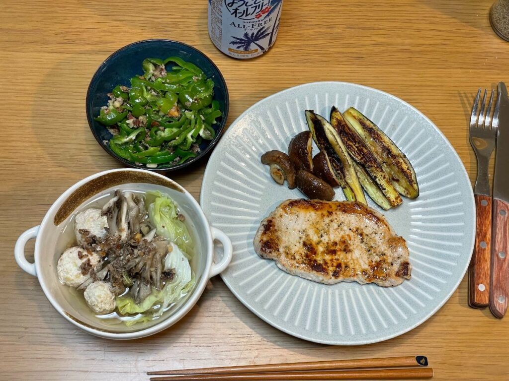 12:00 豚肉のスパイシー焼き、ピーマン鰯フレークあえ、キャベツと鶏団子のスープ