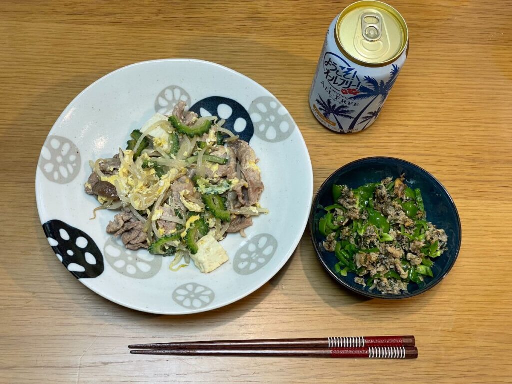 19:00 ゴーヤチャンプル、ピーマン鰯フレークあえ