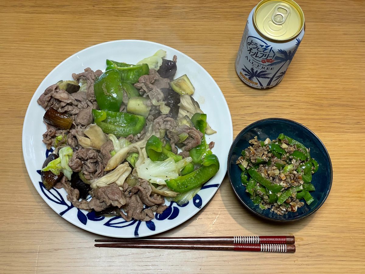 19:00 ゴーヤチャンプル、ピーマン鰯フレークあえ