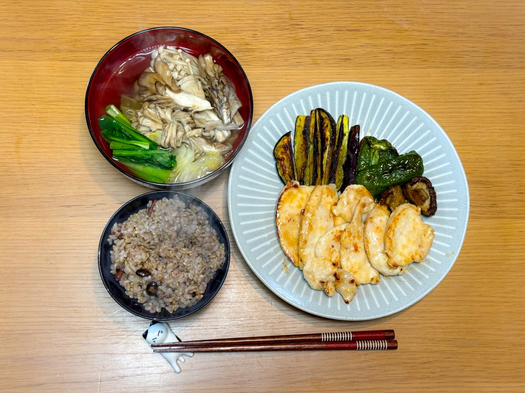 12:00 鶏むね粕漬け、食物繊維汁、玄米ご飯