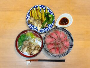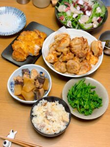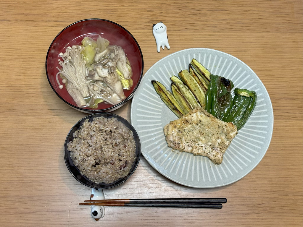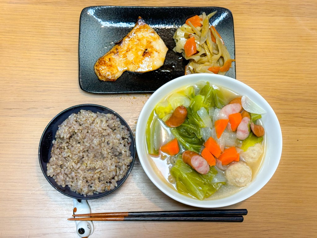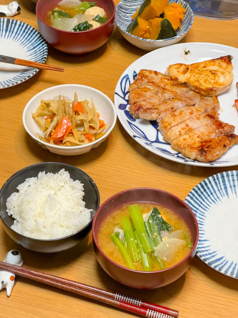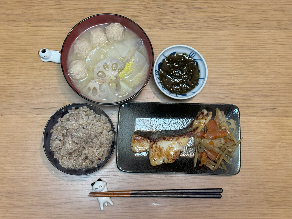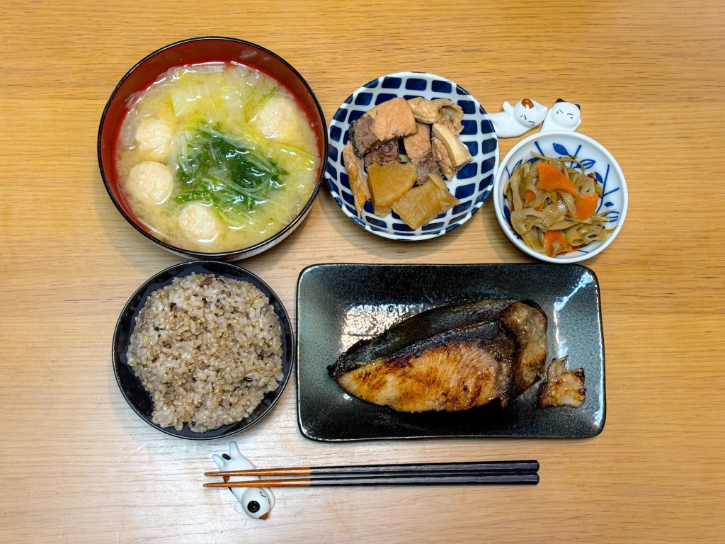 20:45 鰤粕漬け、ぶり大根、きんぴら、味噌汁、玄米ご飯