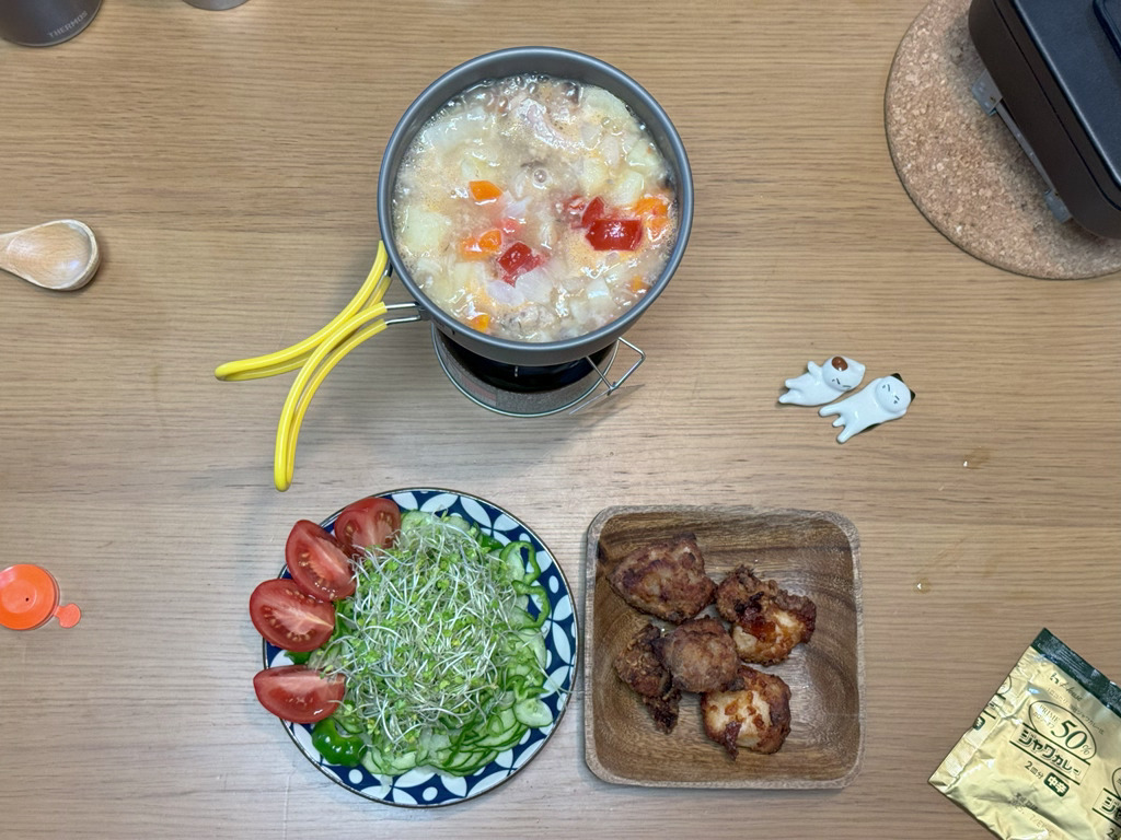12:00 サバカレー、サラダ、唐揚げ