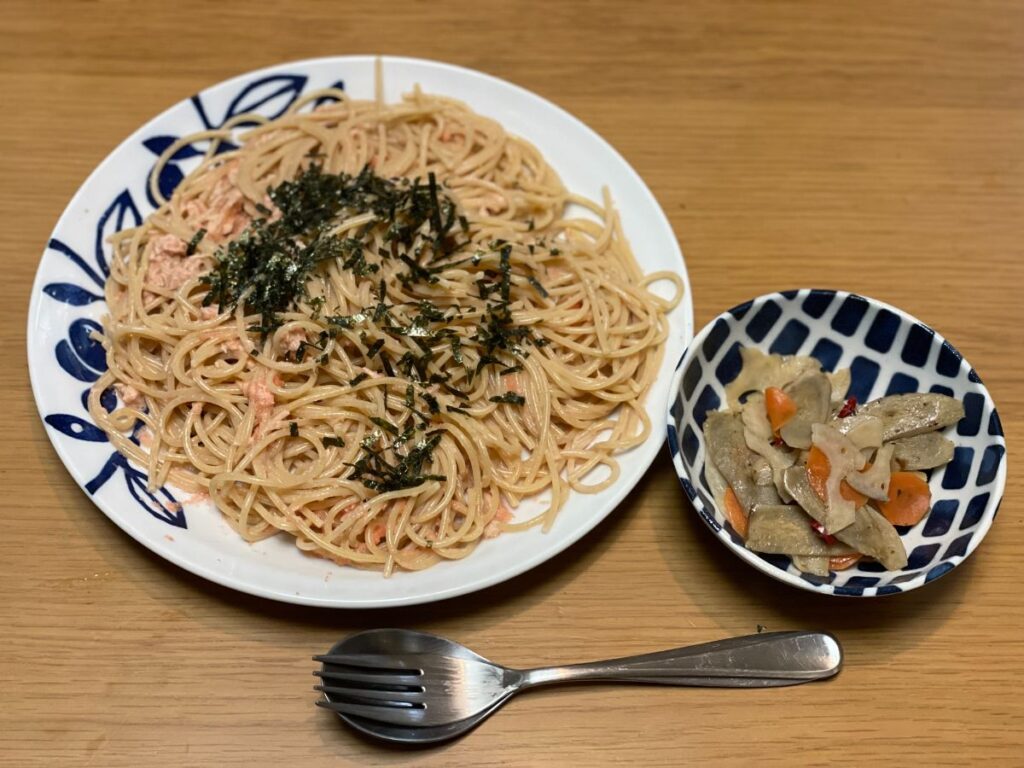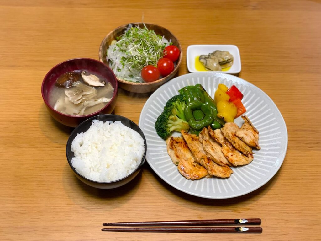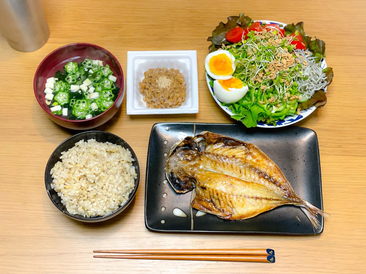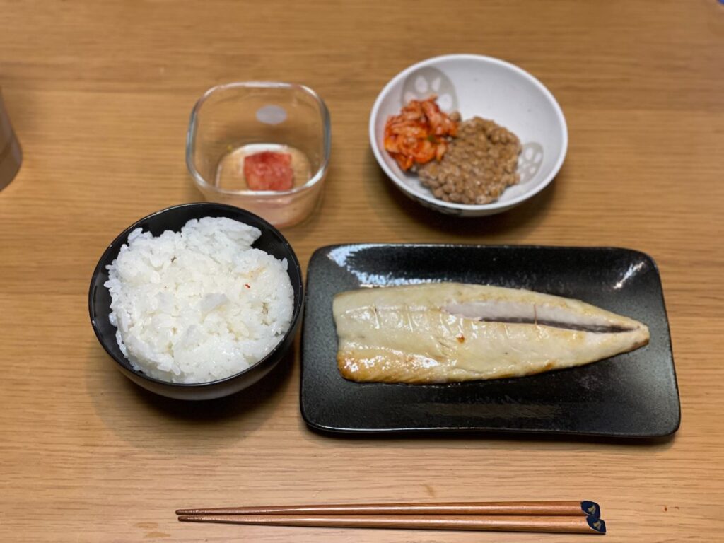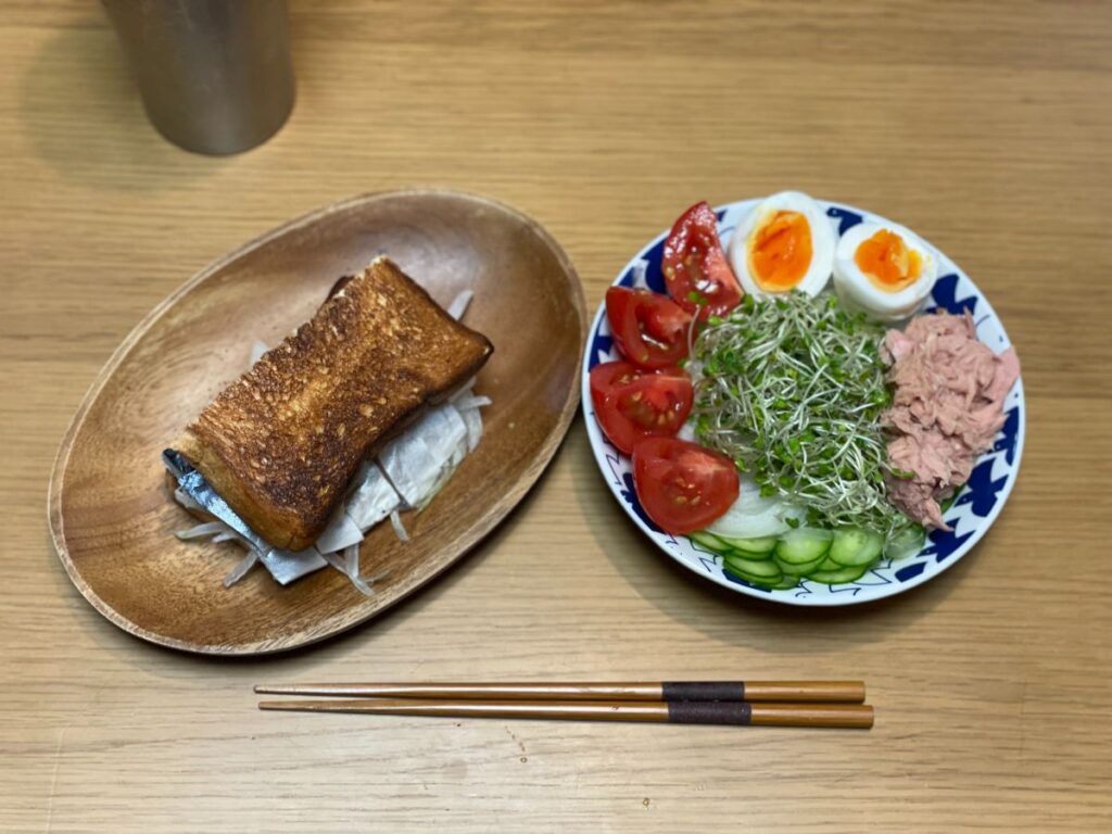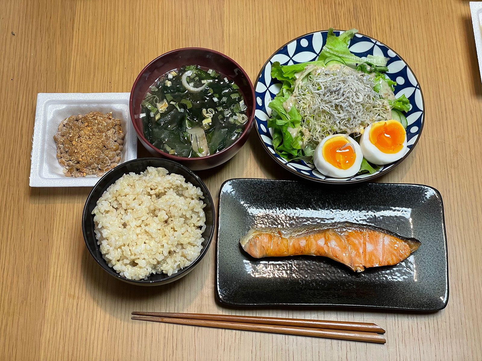 7:45 焼き鮭、ハムサラダ、温泉卵、野沢菜、ごはん、のり