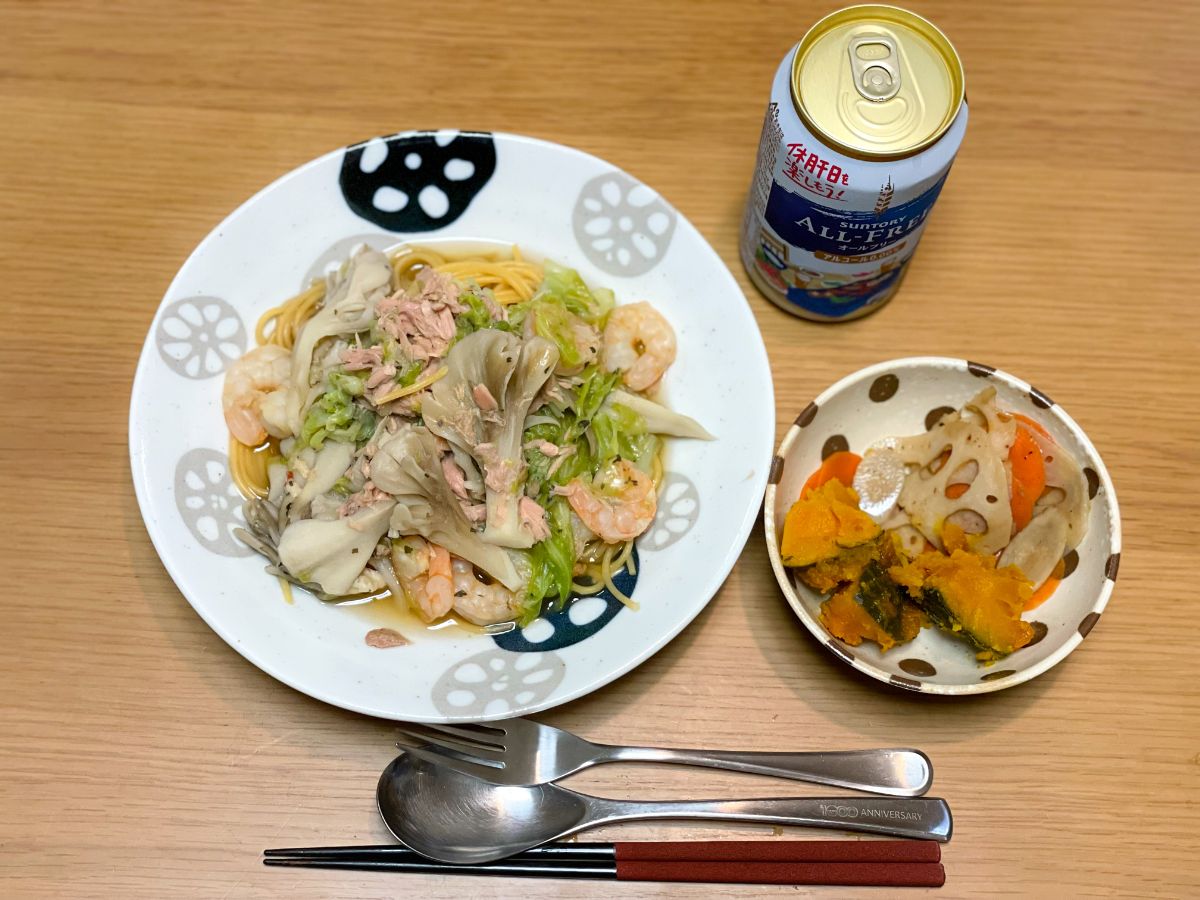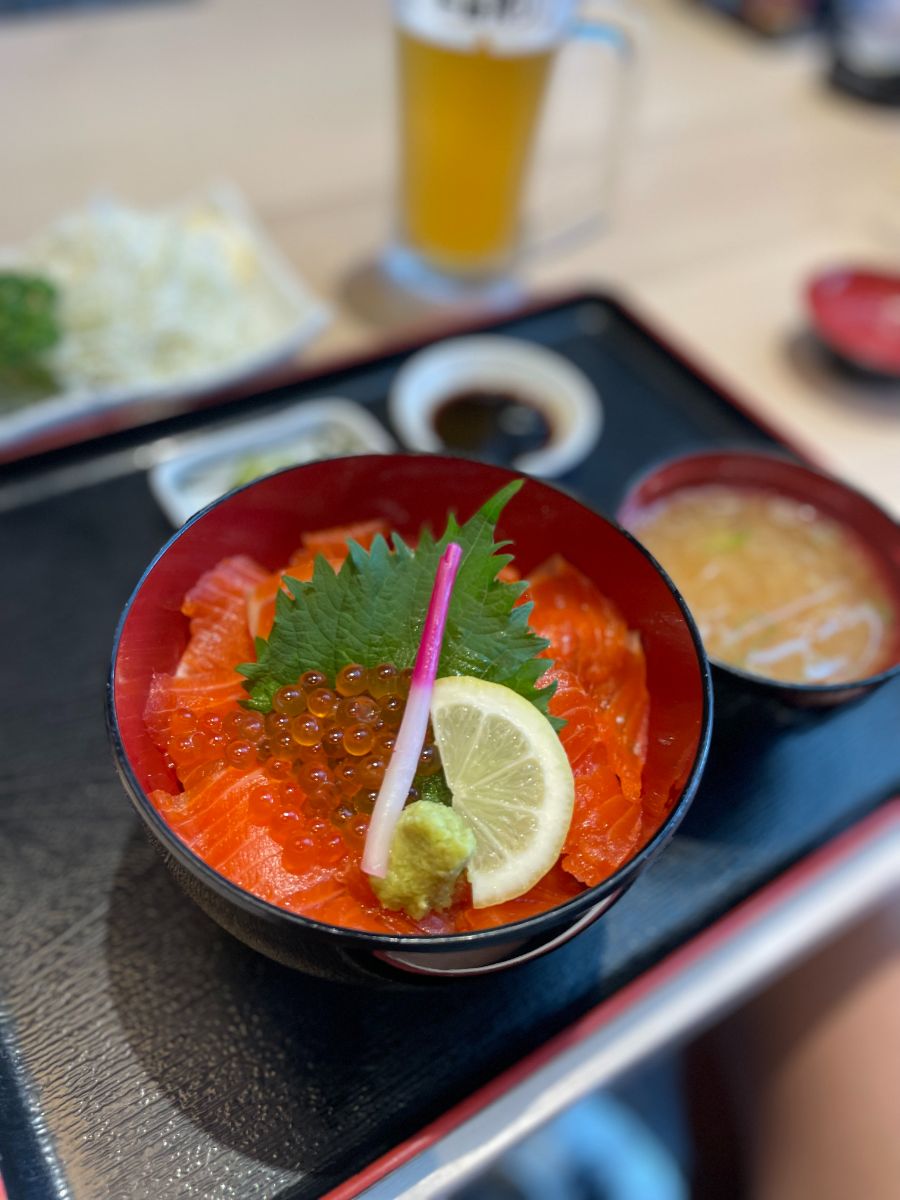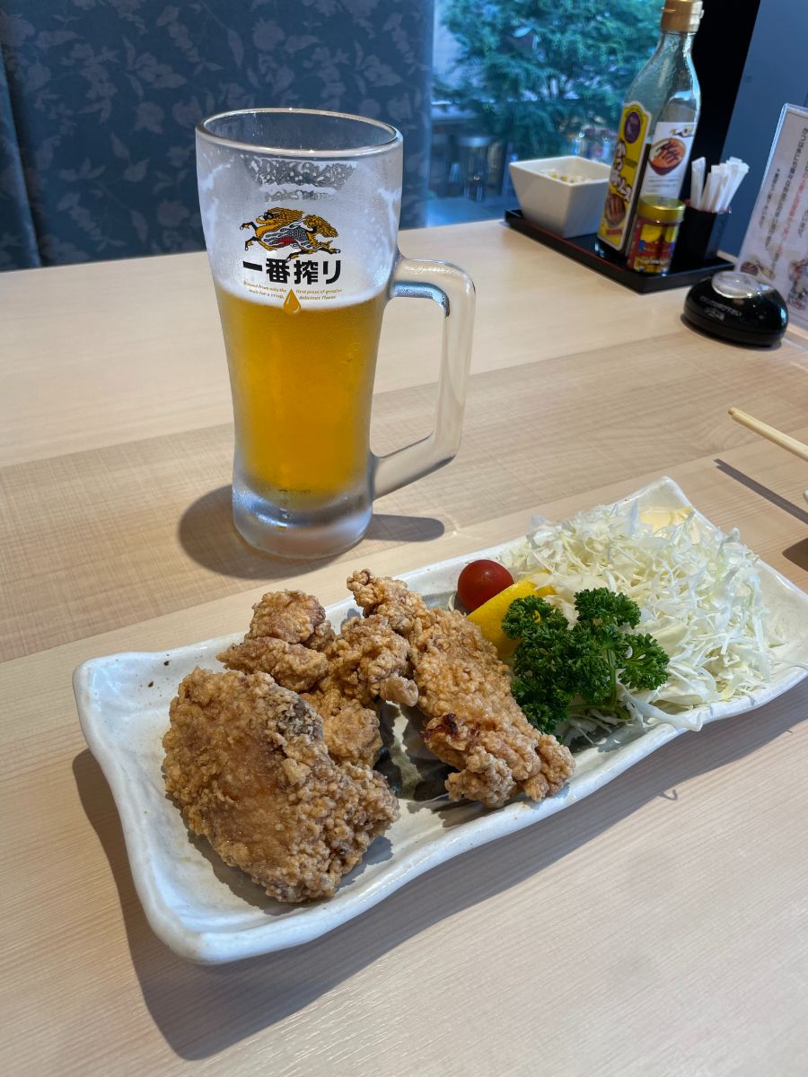17:00 生ビール、鶏の山賊焼、信州サーモン丼