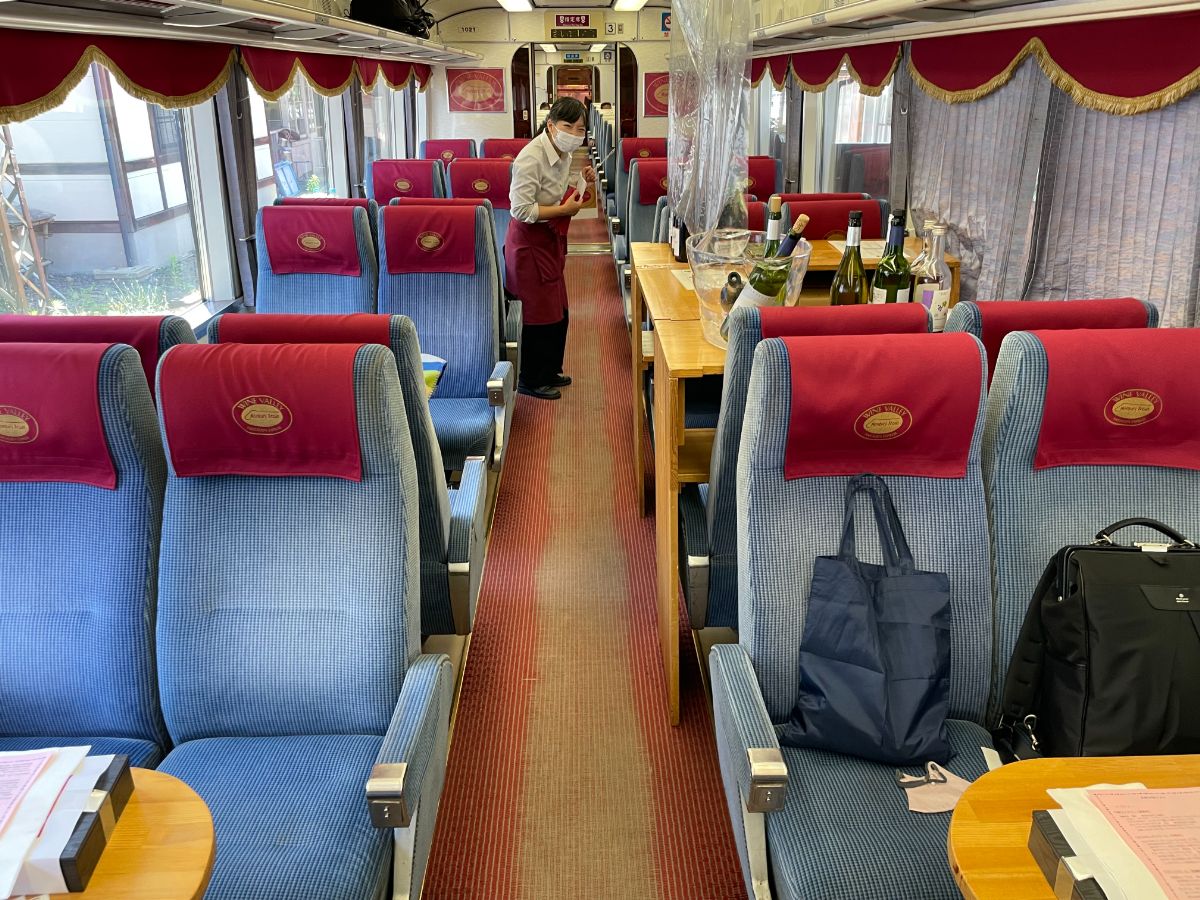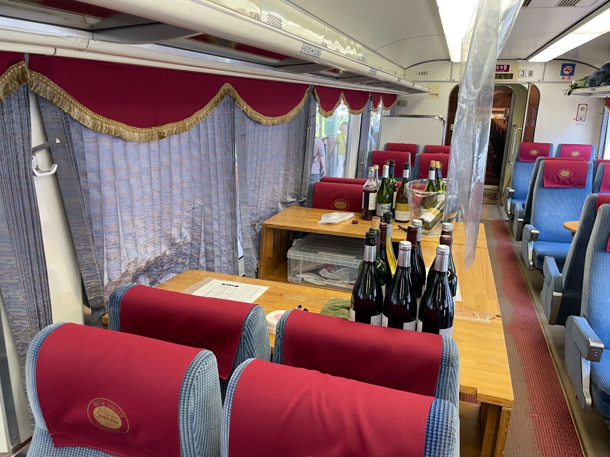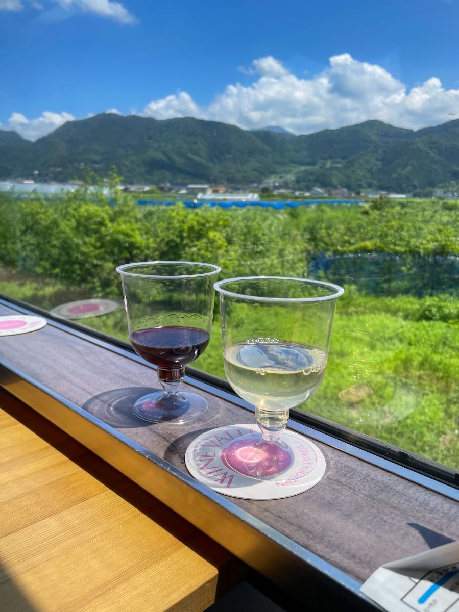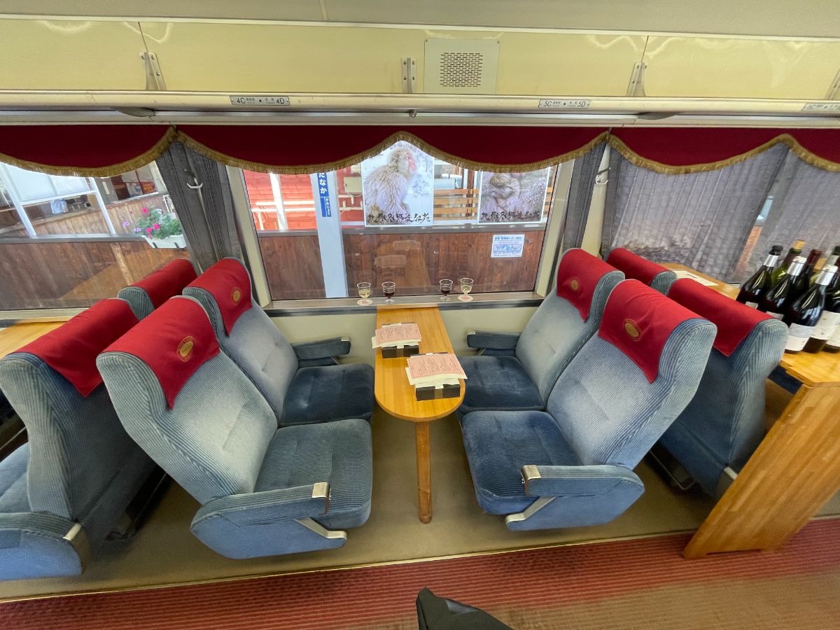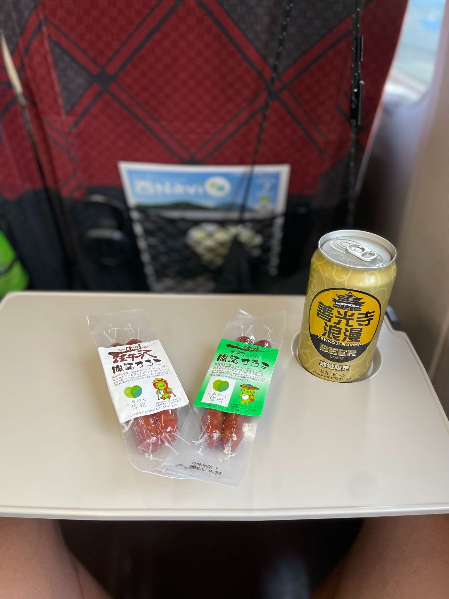 お昼は長野電鉄の「北信濃ワインバレー列車」を予約していたので、長野駅までワイン飲み放題!軽食をつまみながら地元産ワインを飲みました。車内販売の「おやき(じゃがバタ)」が最高で、長野駅に着く頃には完全に出来上がってました。