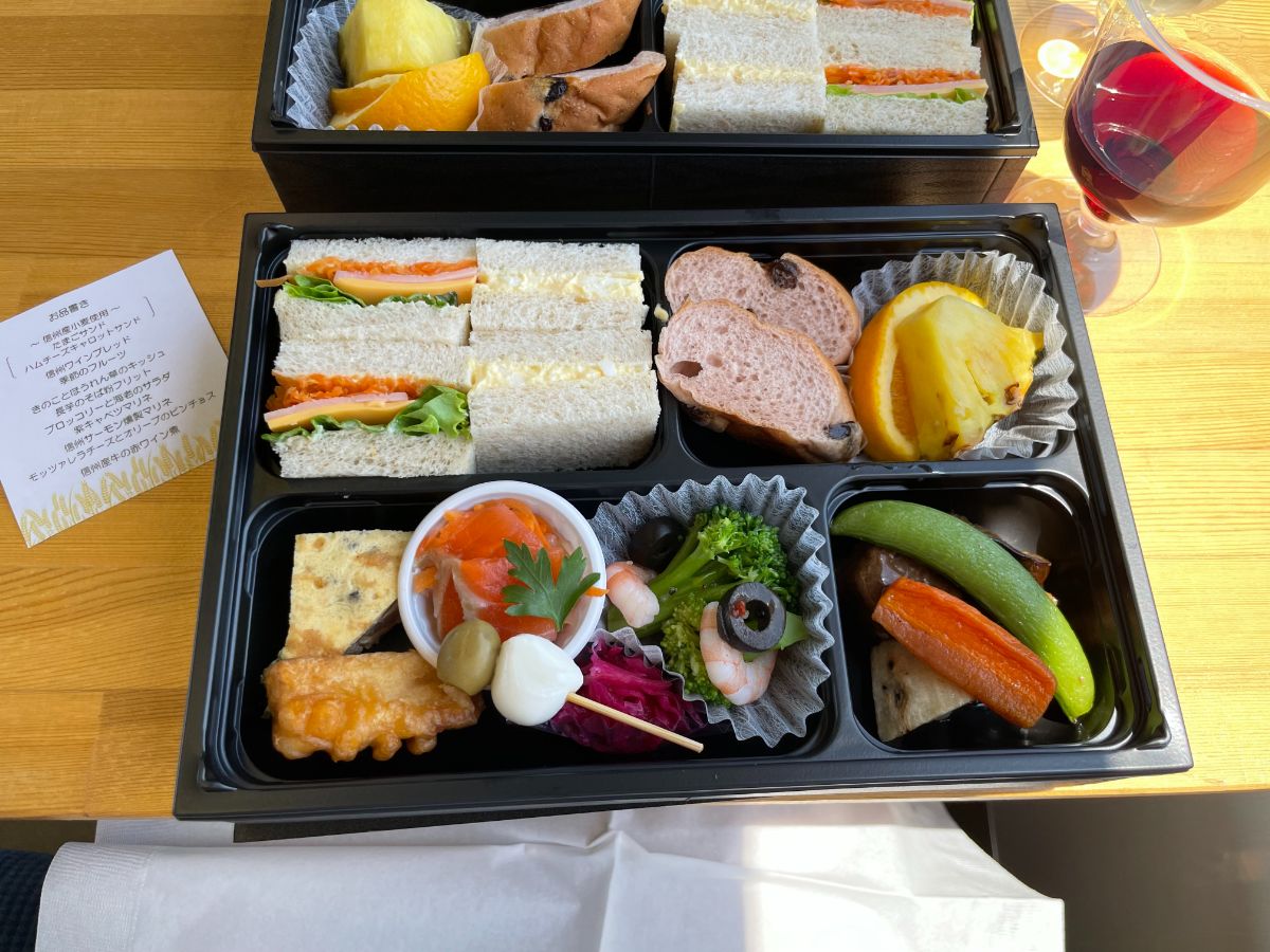 11:30 たまごサンド、ハムチーズキャロットサンド、信州ワインブレッド、きのことほうれん草のキッシュ、長芋の蕎麦粉フリット、ブロッコリーとエビのサラダ、紫キャベツマリネ、信州サーモン燻製マリネ、モッツァレラチーズとオリーブのピンチョス、信州産牛の赤ワイン煮、おやき(じゃがバター、あんこ)、チーズ、グラスワイン6杯