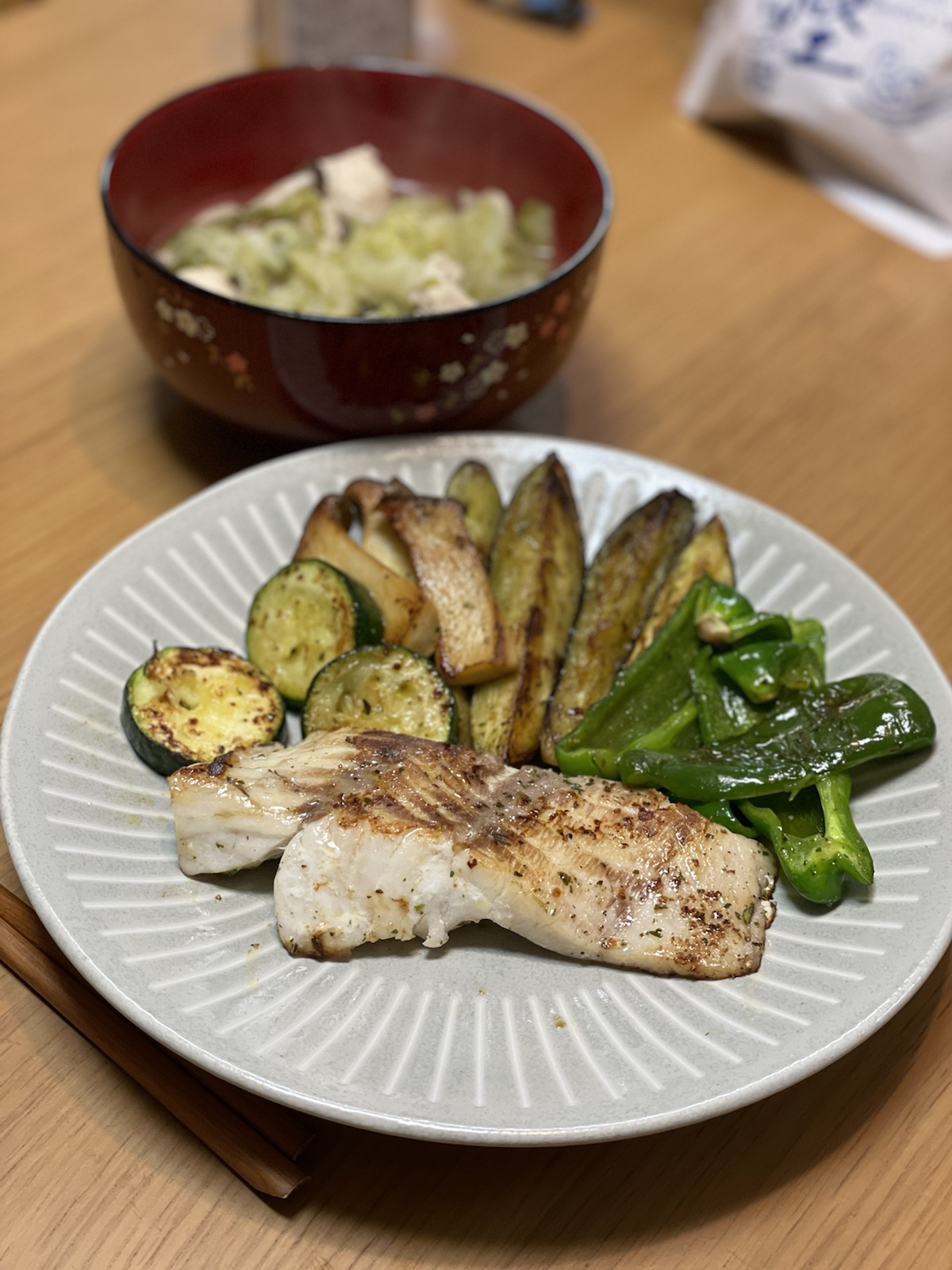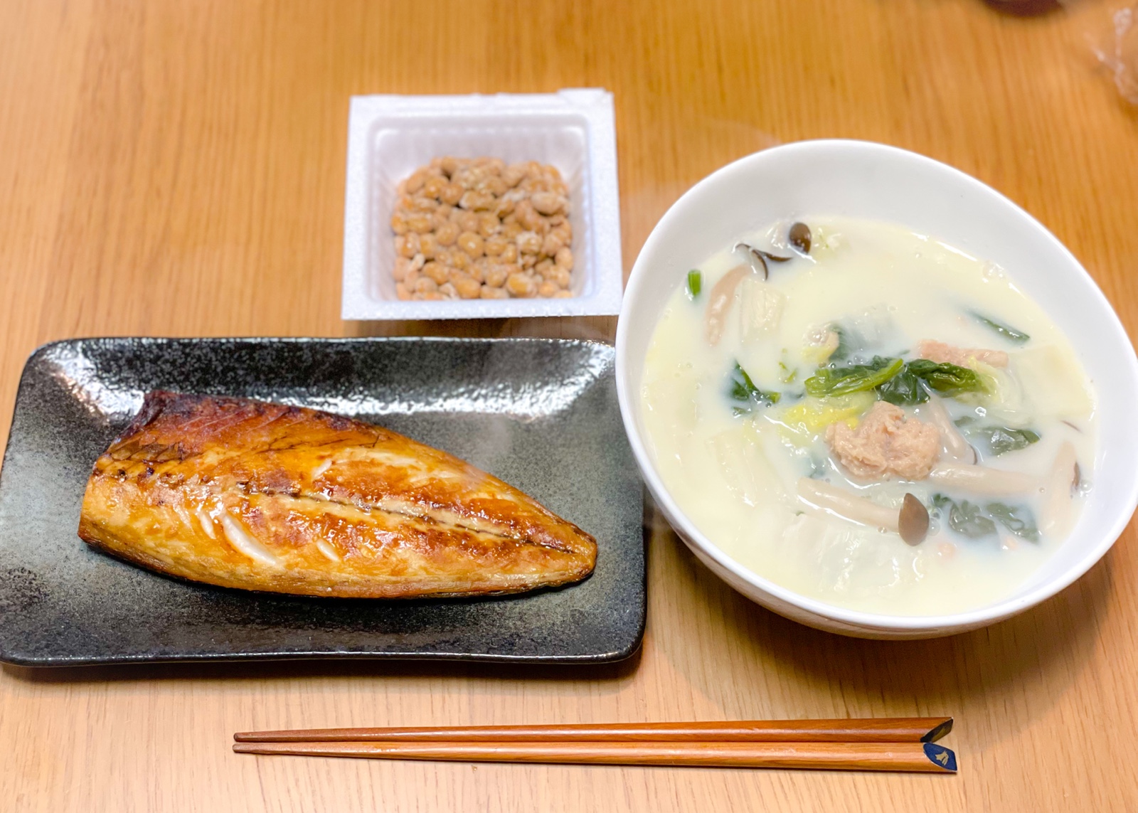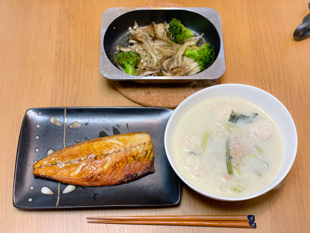 20:00 鯖塩焼き、豆乳スープ(昼のものに鶏団子追加)、キノコとブロッコリーのグリル