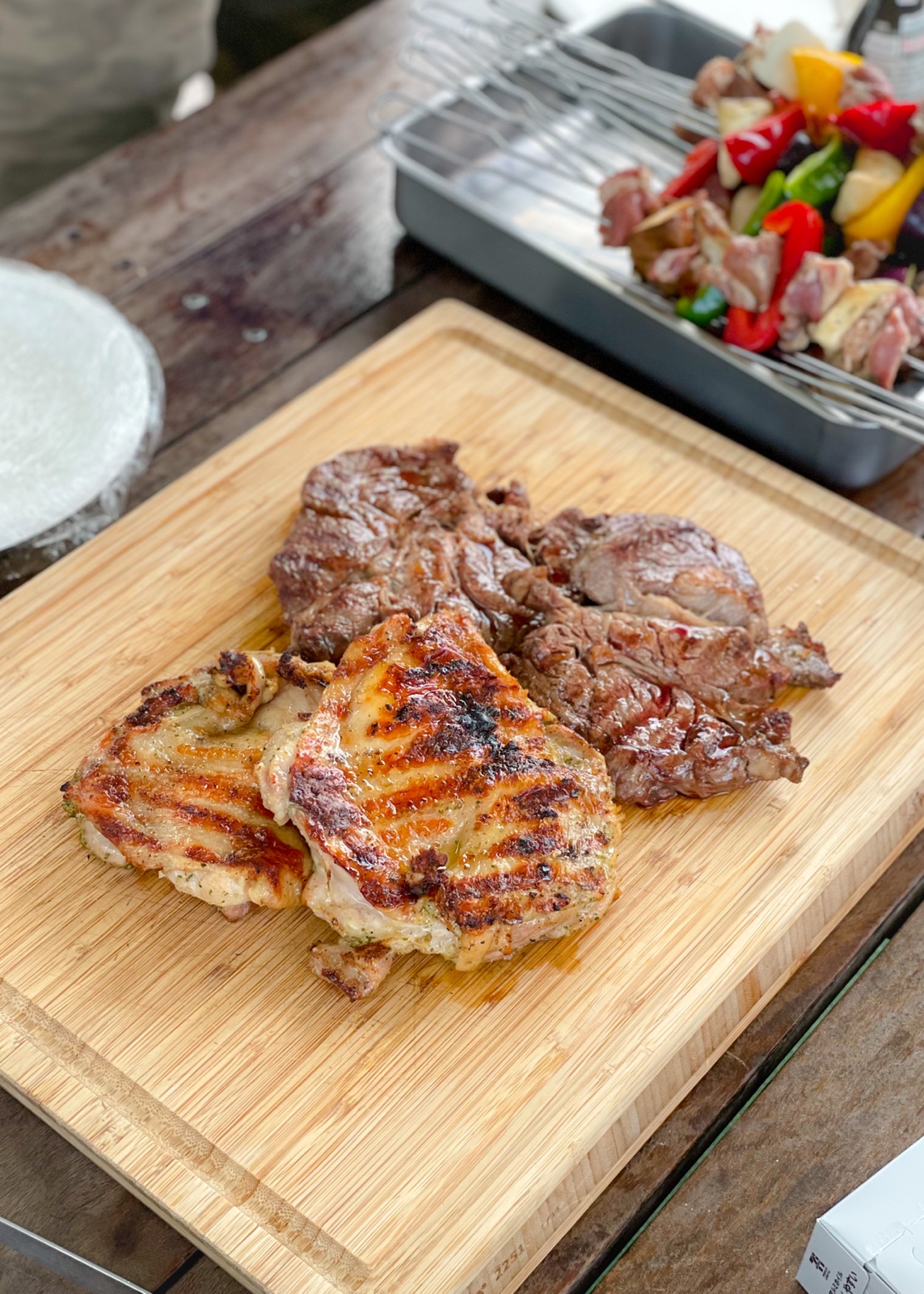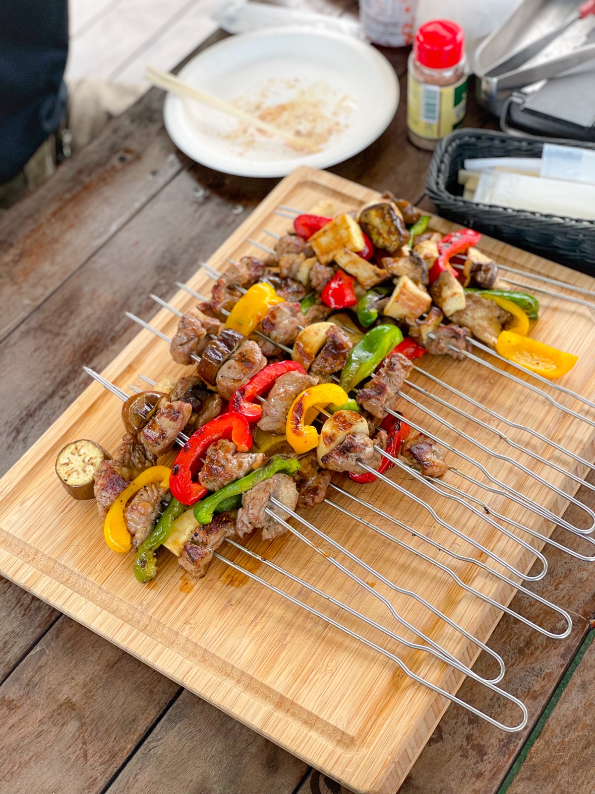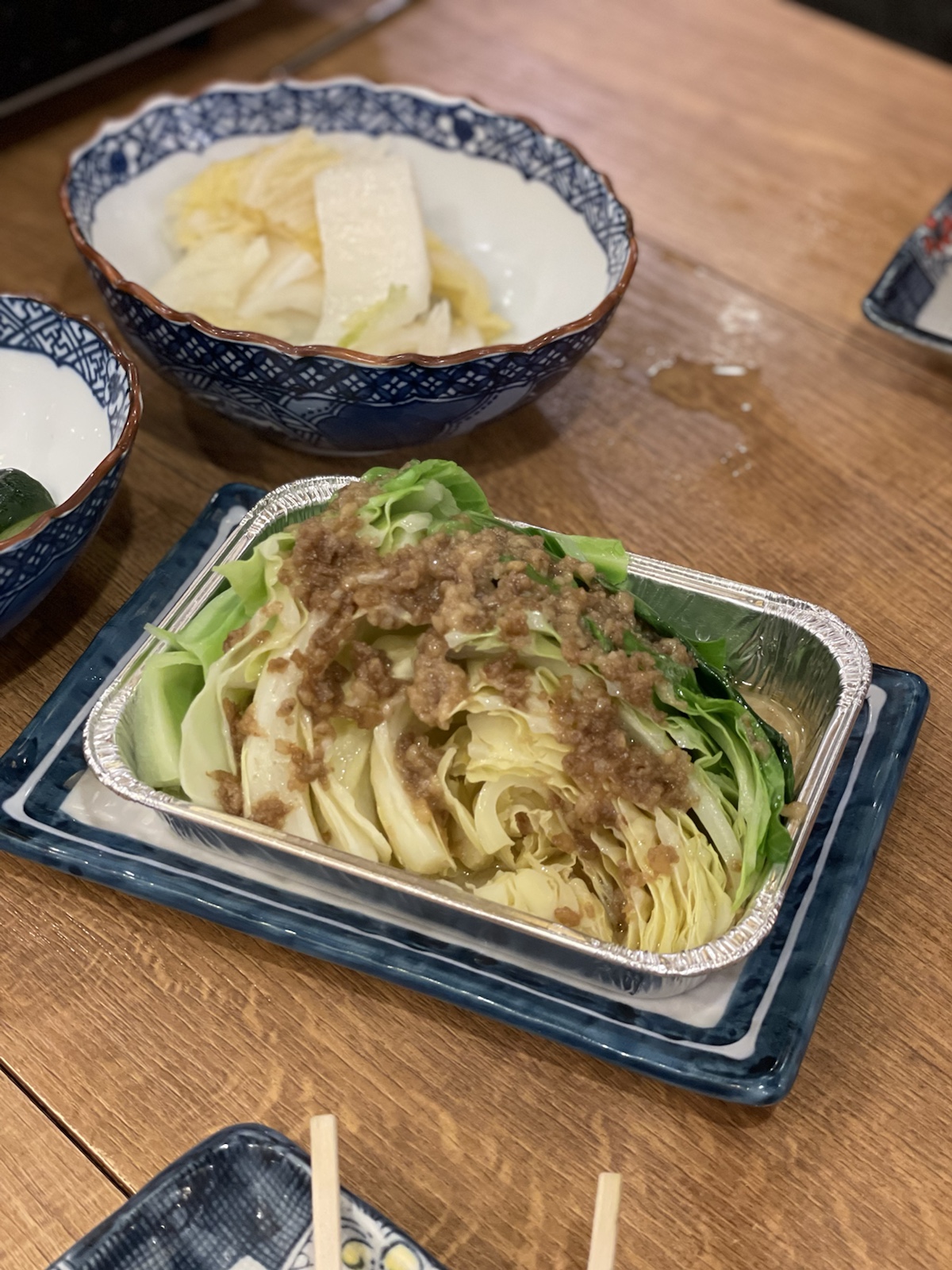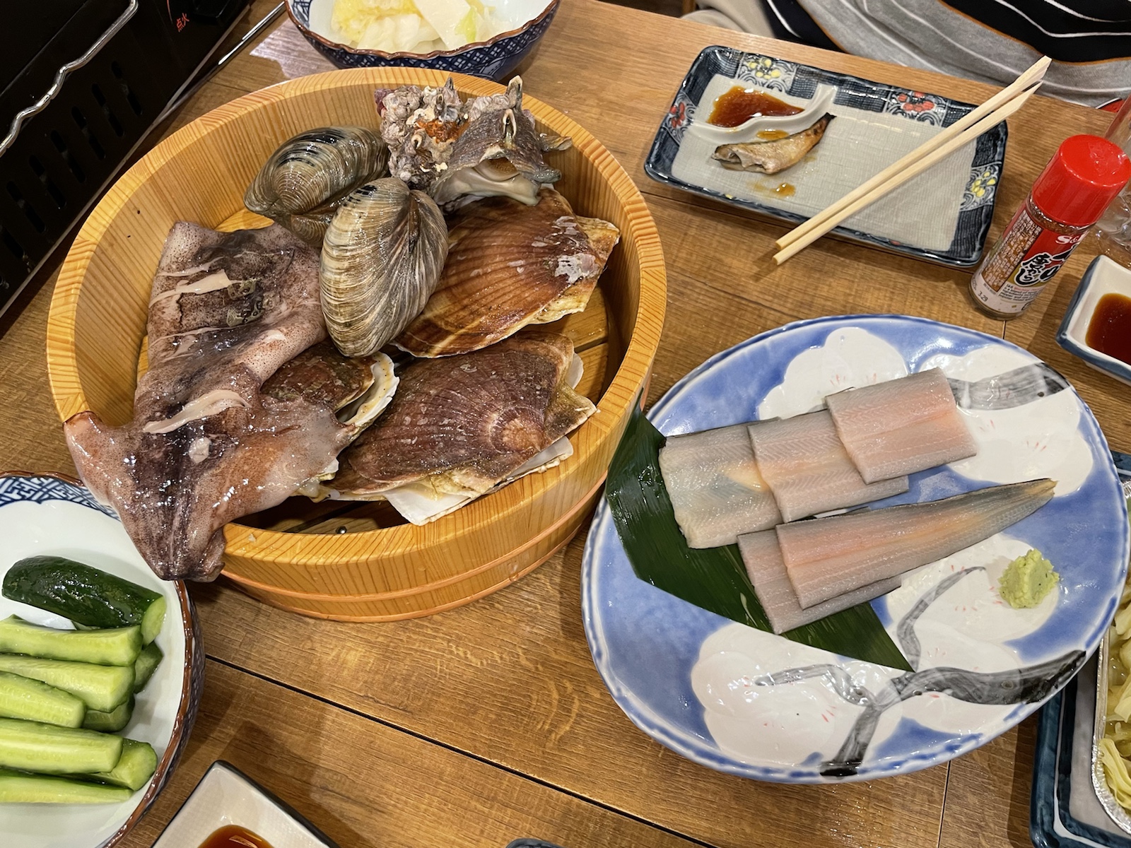 17:00 貝焼き(ホンビノス、さざえ、いか、穴子)、鮭ハラス焼き、鯖塩焼き、キュウリ浅漬け、白菜漬け、アンチョビキャベツ、ハイボール2杯 ※食事は2人でシェア、ホタテは相手が食べてます(外食:磯丸水産)