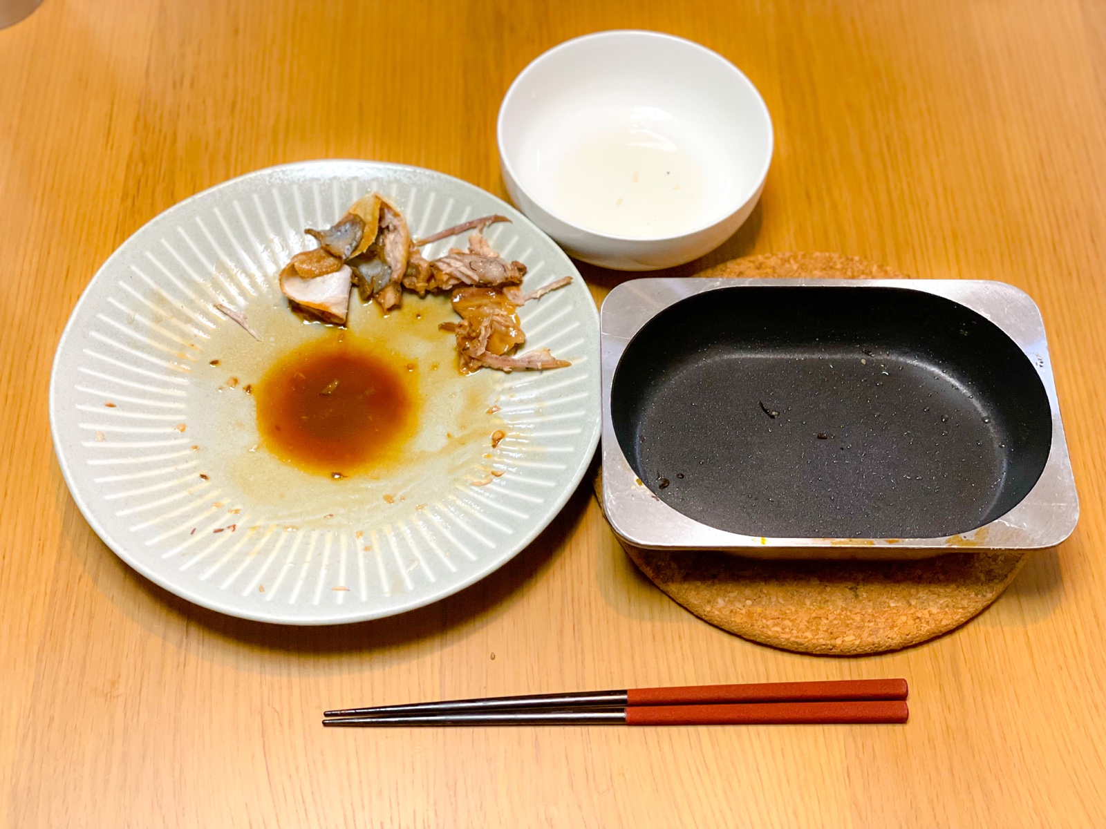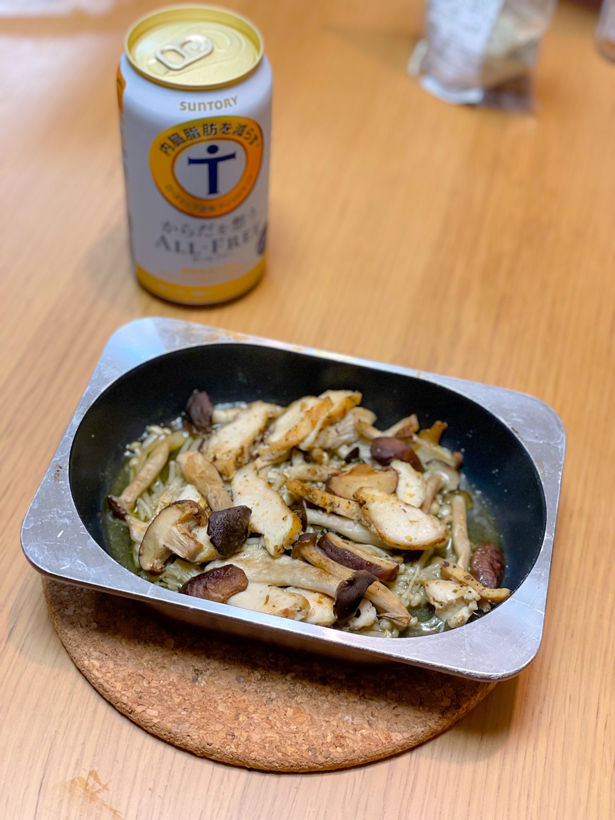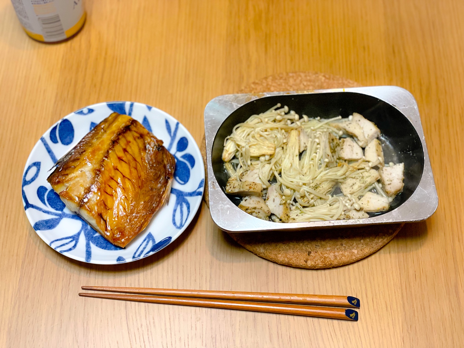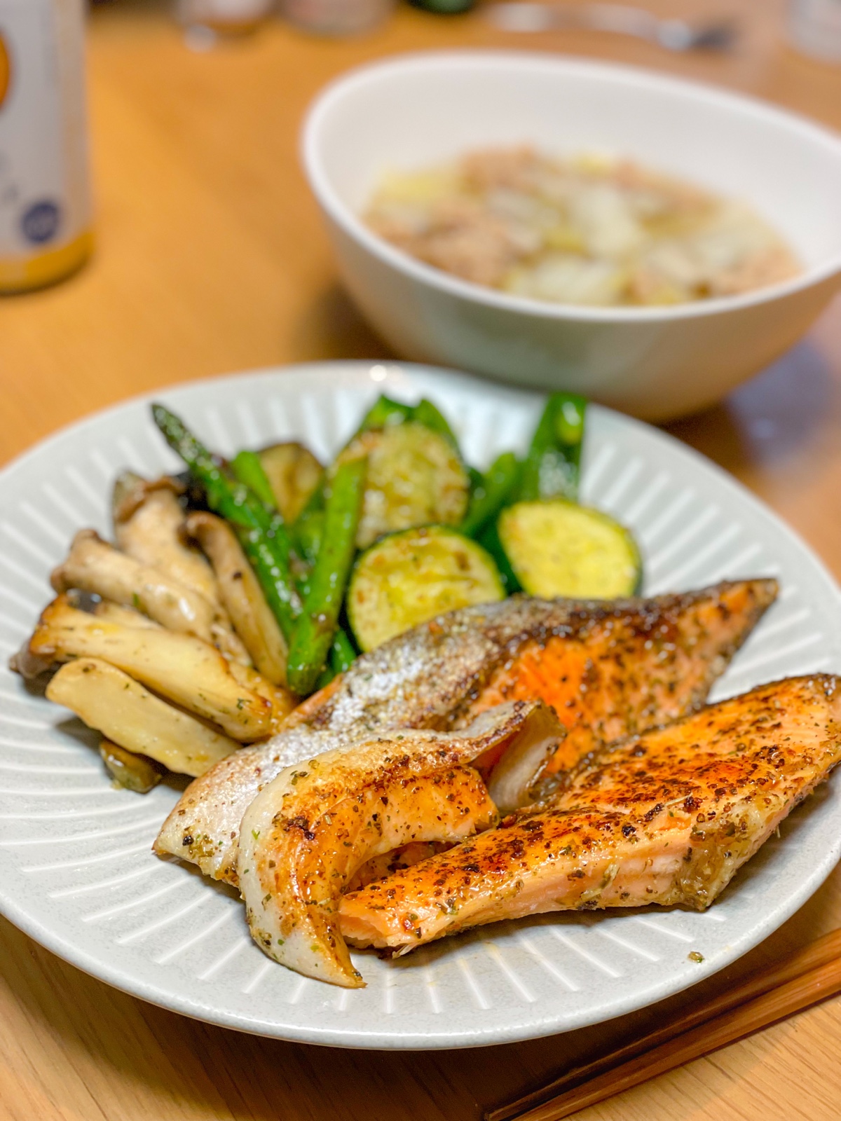 【夜】昼の残りの豆乳スープと焼き鯖、キノコとサラダチキンのオーブン焼き