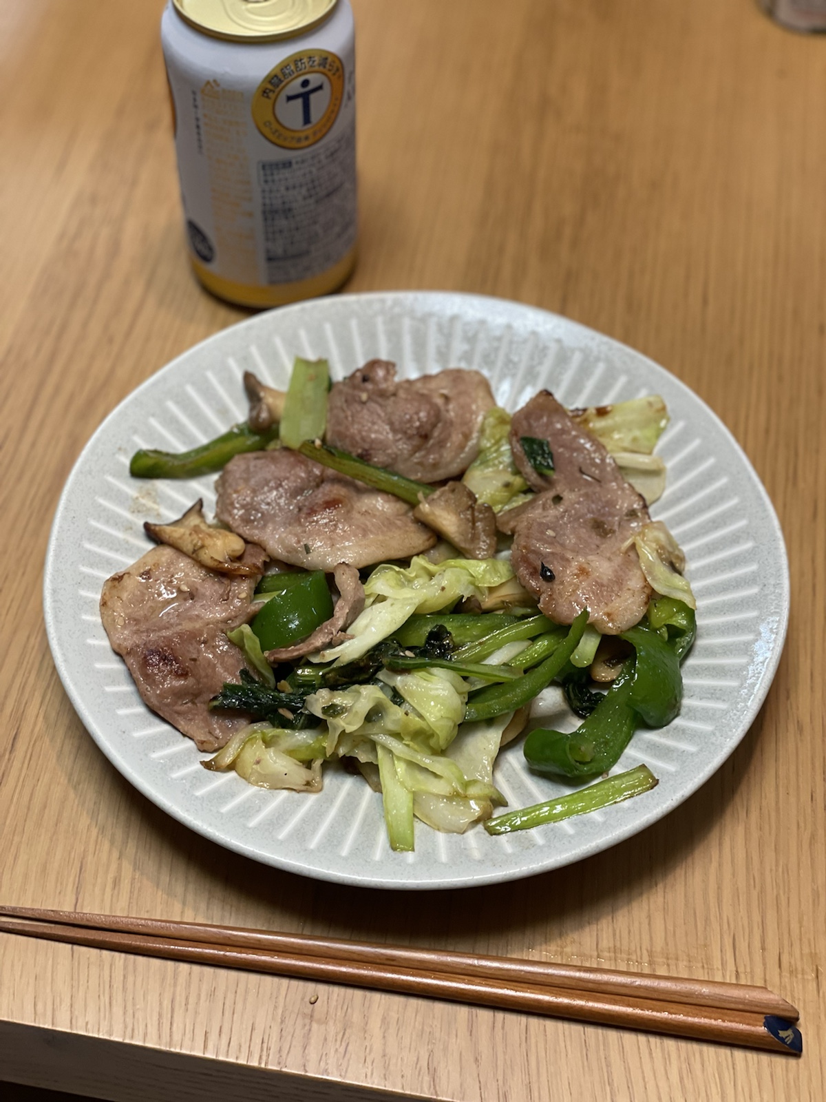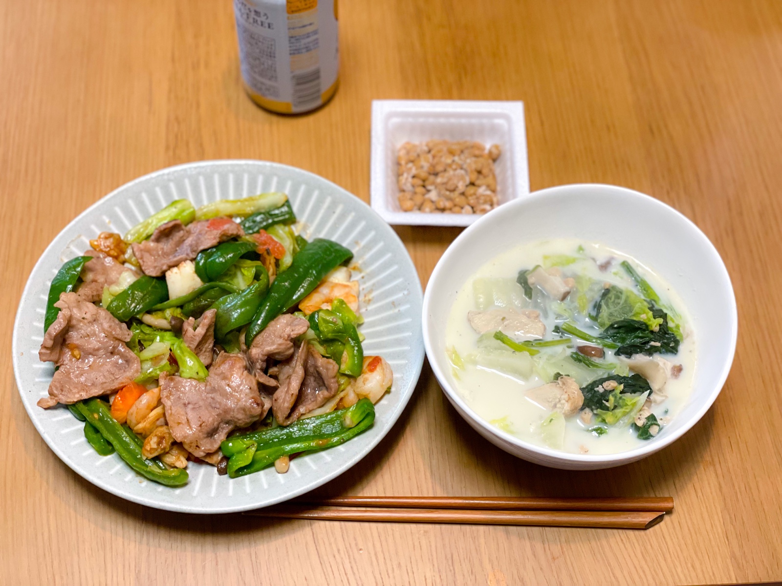 11:30 肉野菜炒め(豚肩ロース、キャベツ、ピーマン、しめじ、えりんぎ、トマト)、豆乳スープ(白菜、サラダチキン、ほうれんそう、しいたけ、えび、あさり、いか)、納豆
