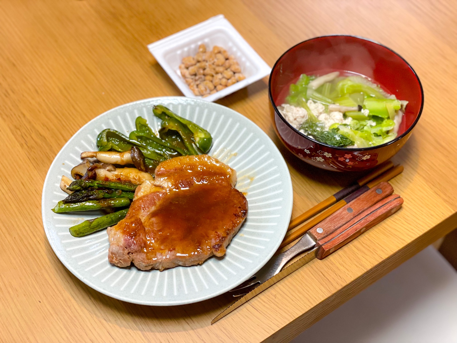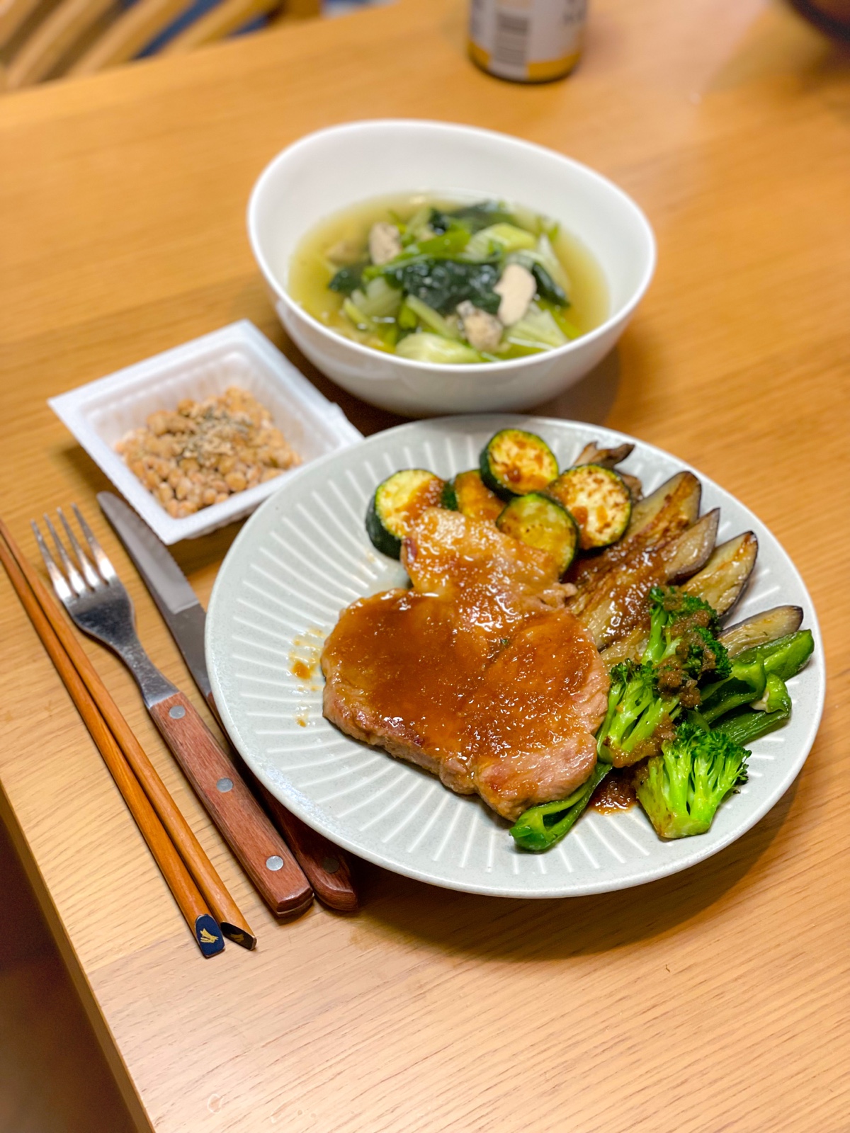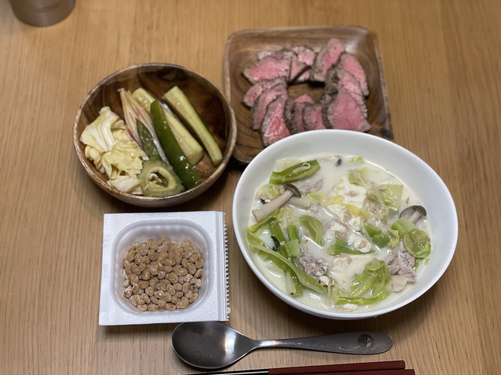 【昼】ローストビーフ、ブロッコリーとキャベツの豆乳スープ、ピクルス、納豆