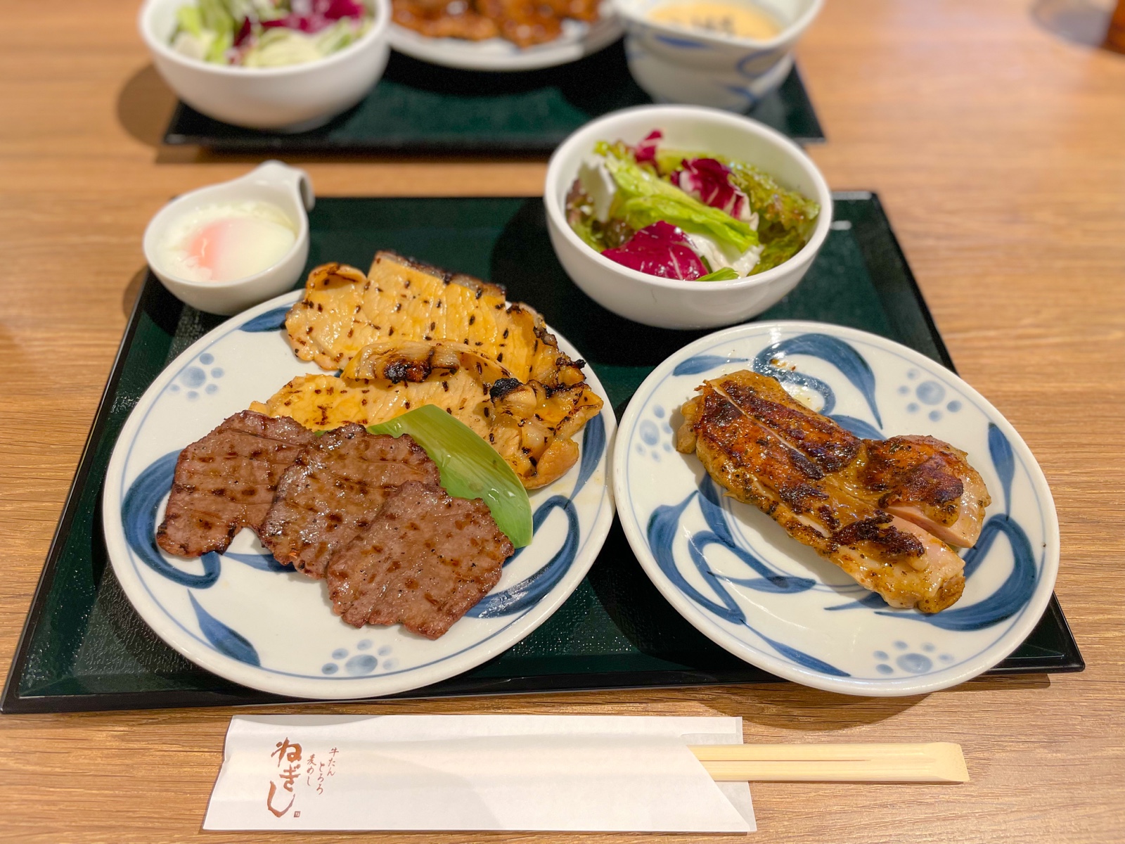 11:00 豚みそ焼き、牛タン、鶏ももスパイシー焼き、サラダ、温玉(外食:ねぎし)