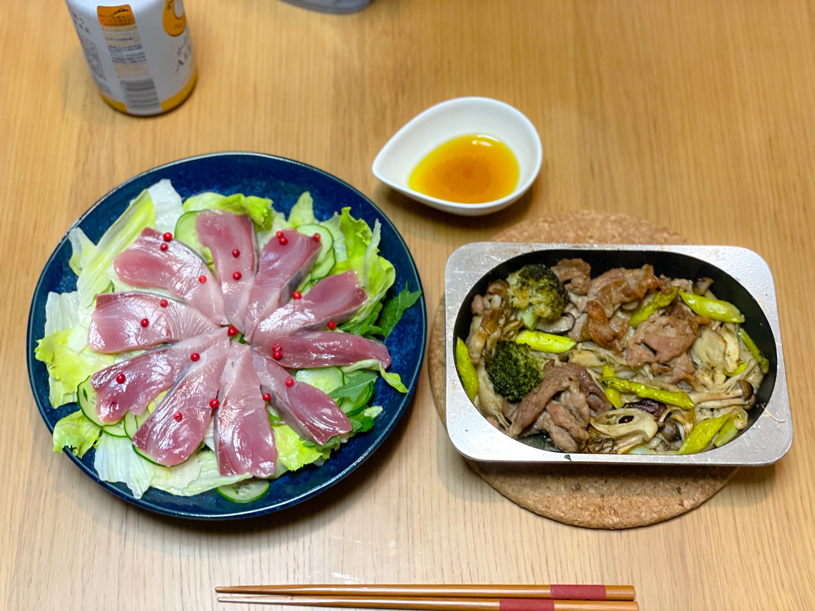 12:00 ブリのカルパッチョサラダ、豚肉ときのこ・アスパラ・ブロッコリーのグリル