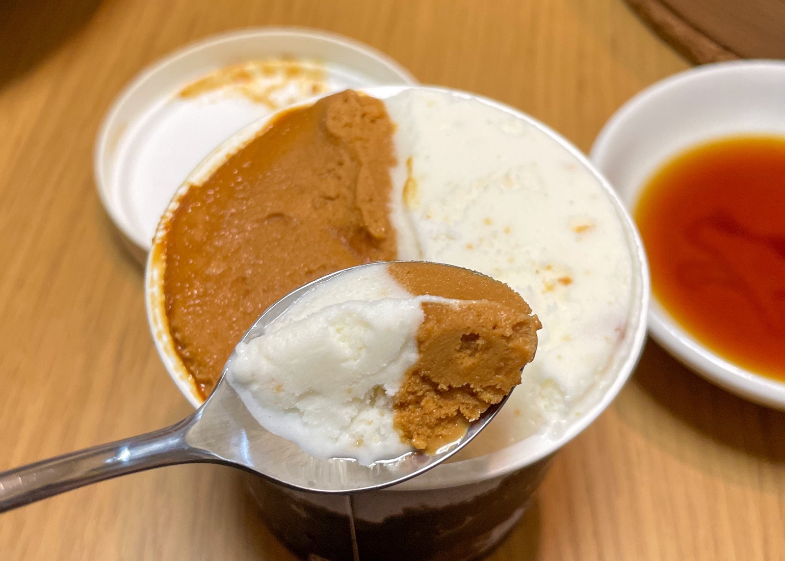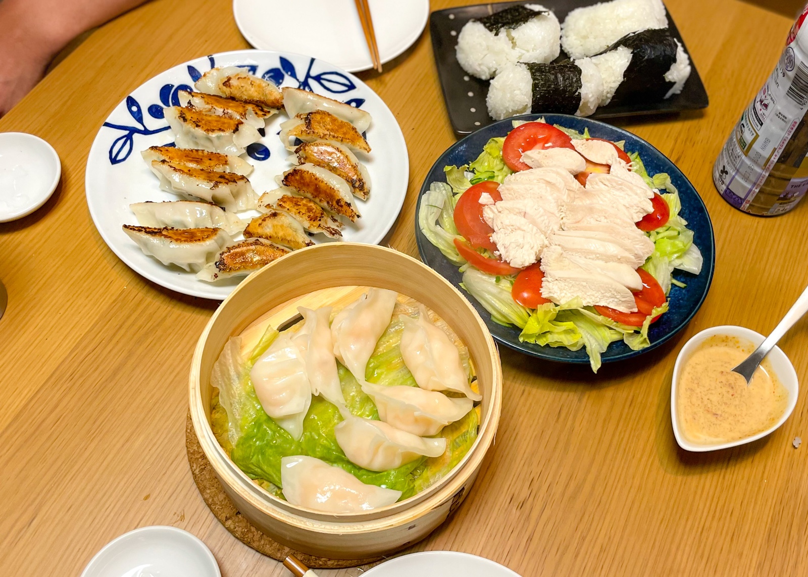 19:00 餃子、エビ蒸し餃子、棒々鶏、おにぎり、シチリアソルトとキャラメルのジェラート