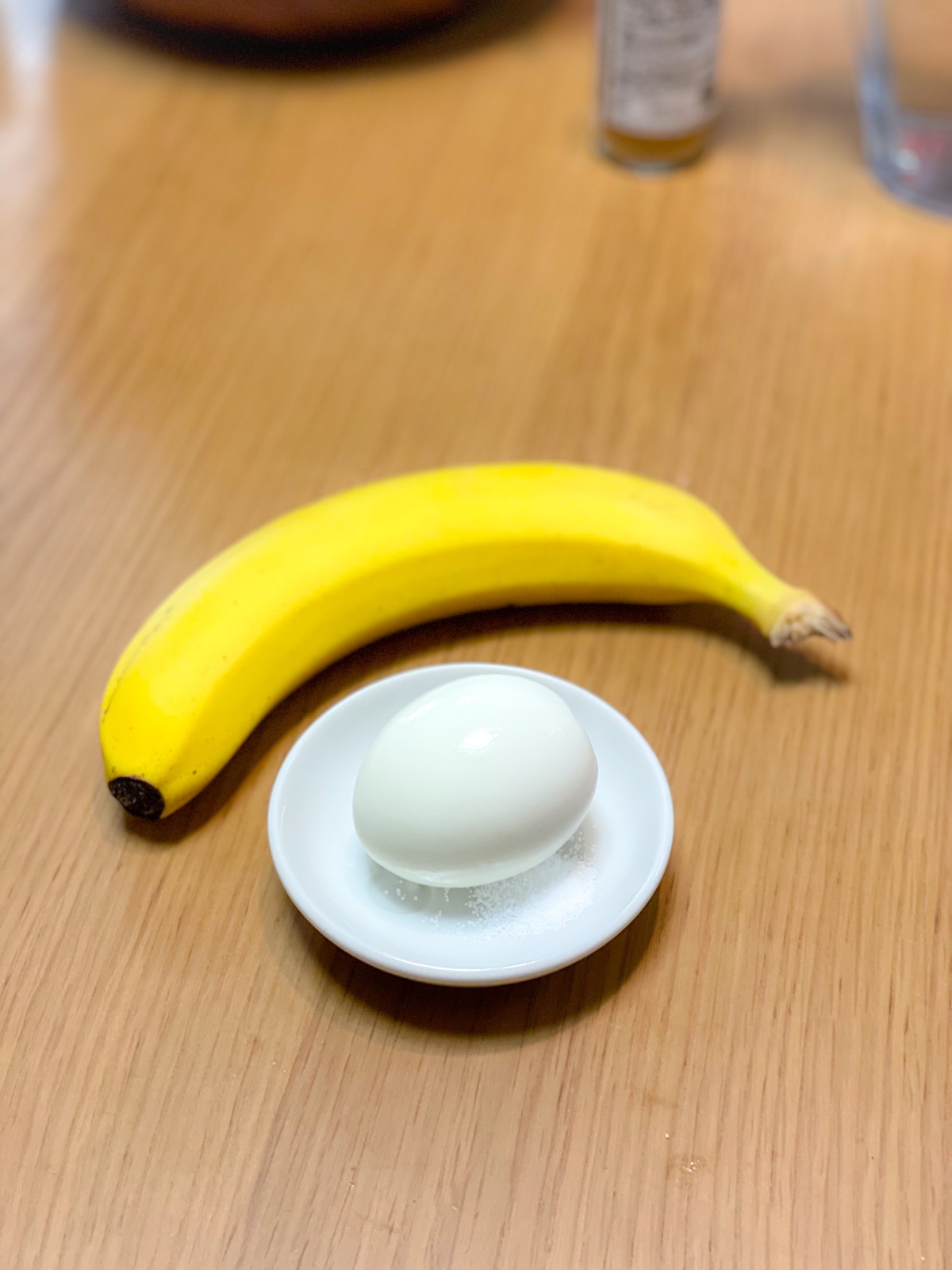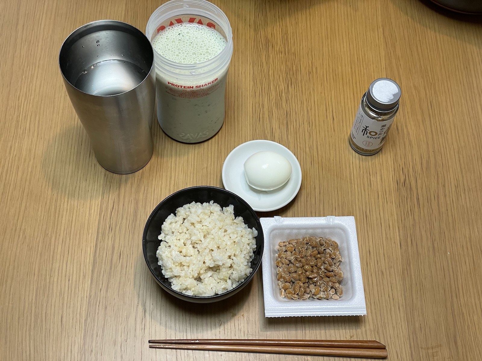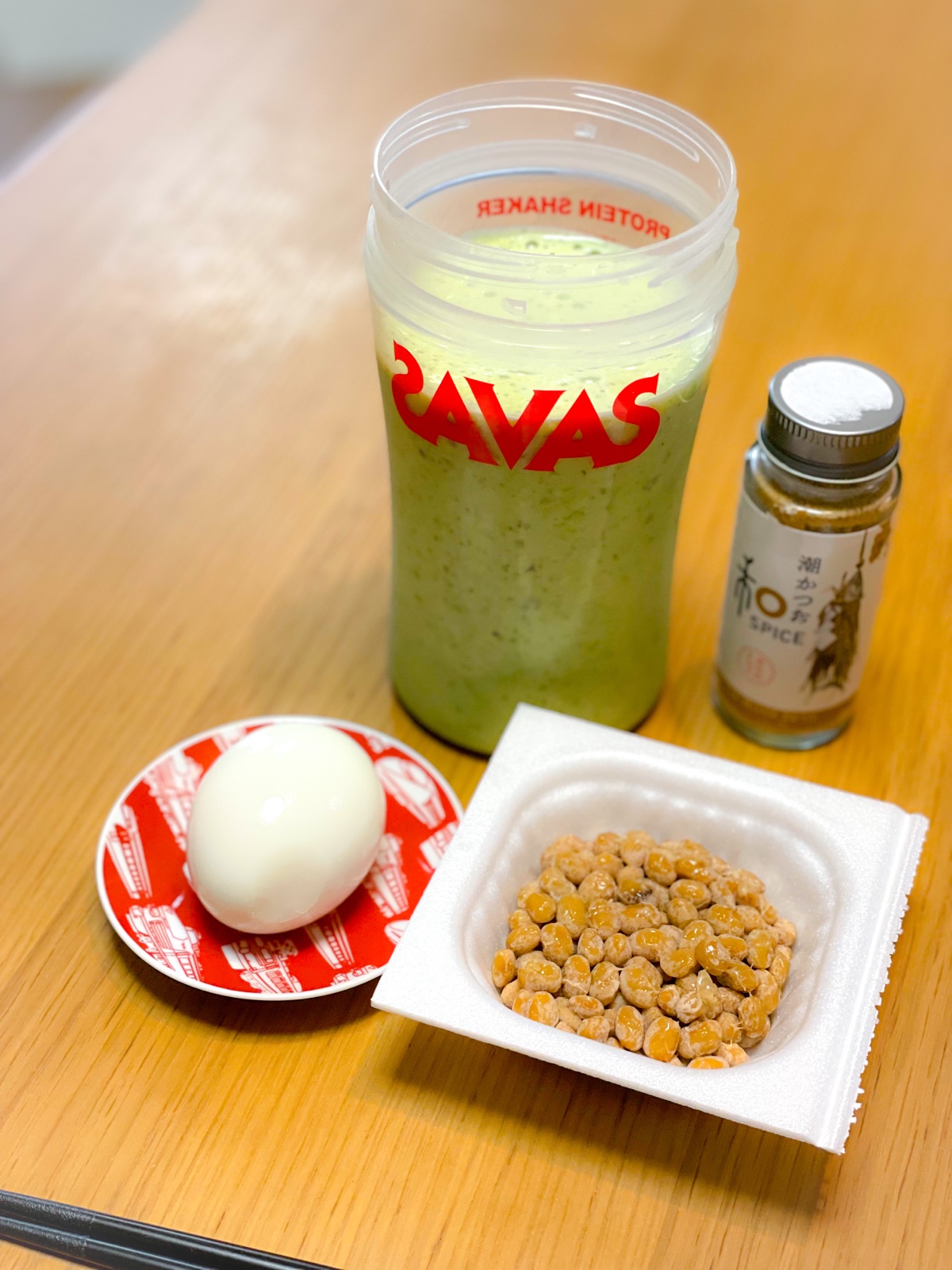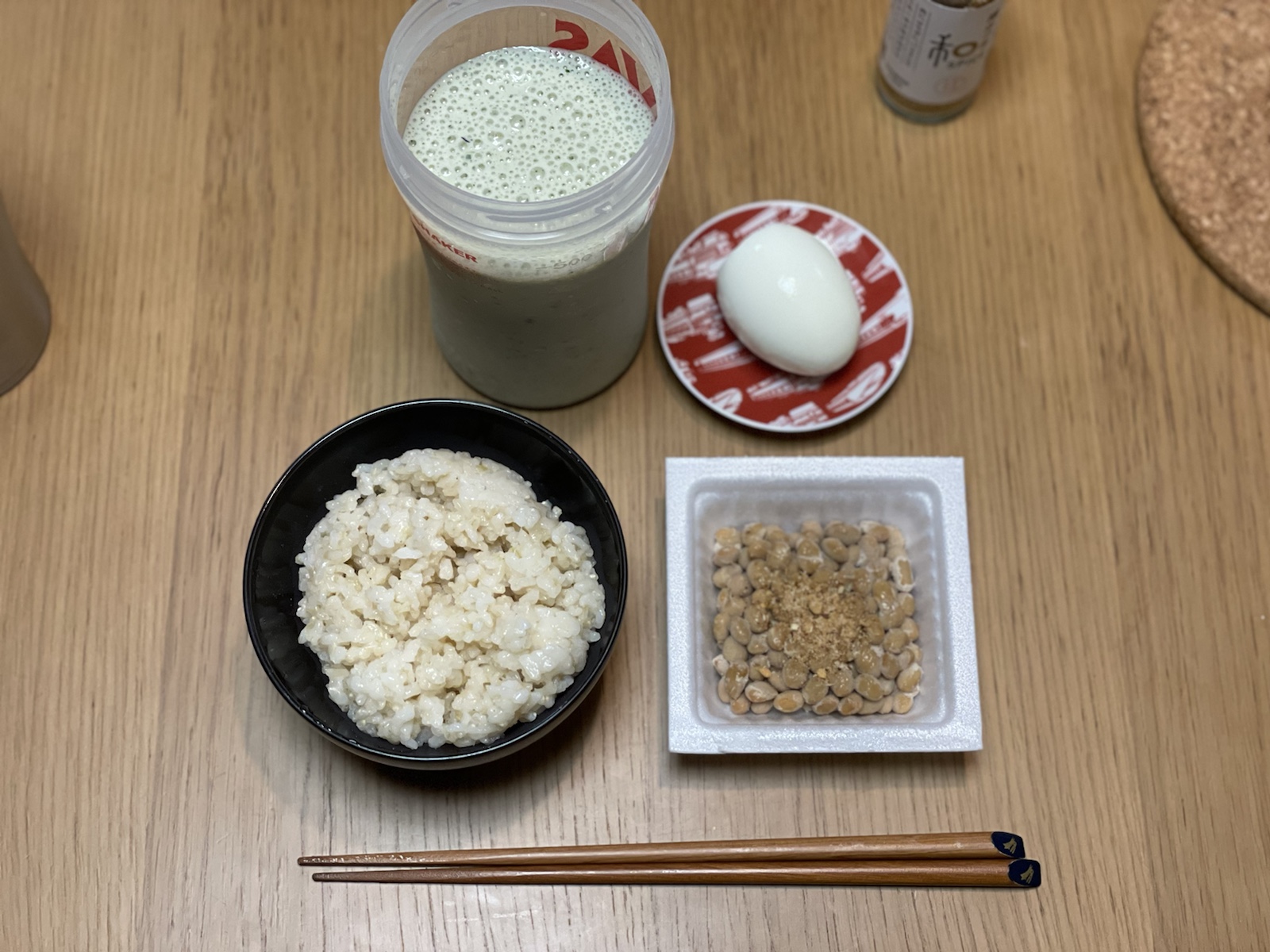 7:00 豆乳プロテインスムージー、玄米ごはん、納豆、ゆで卵