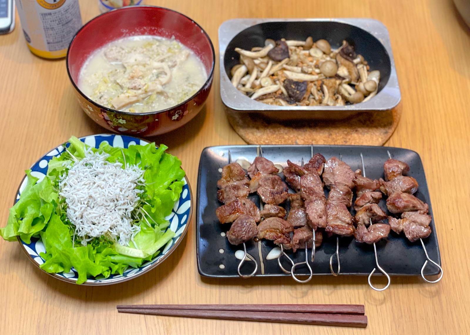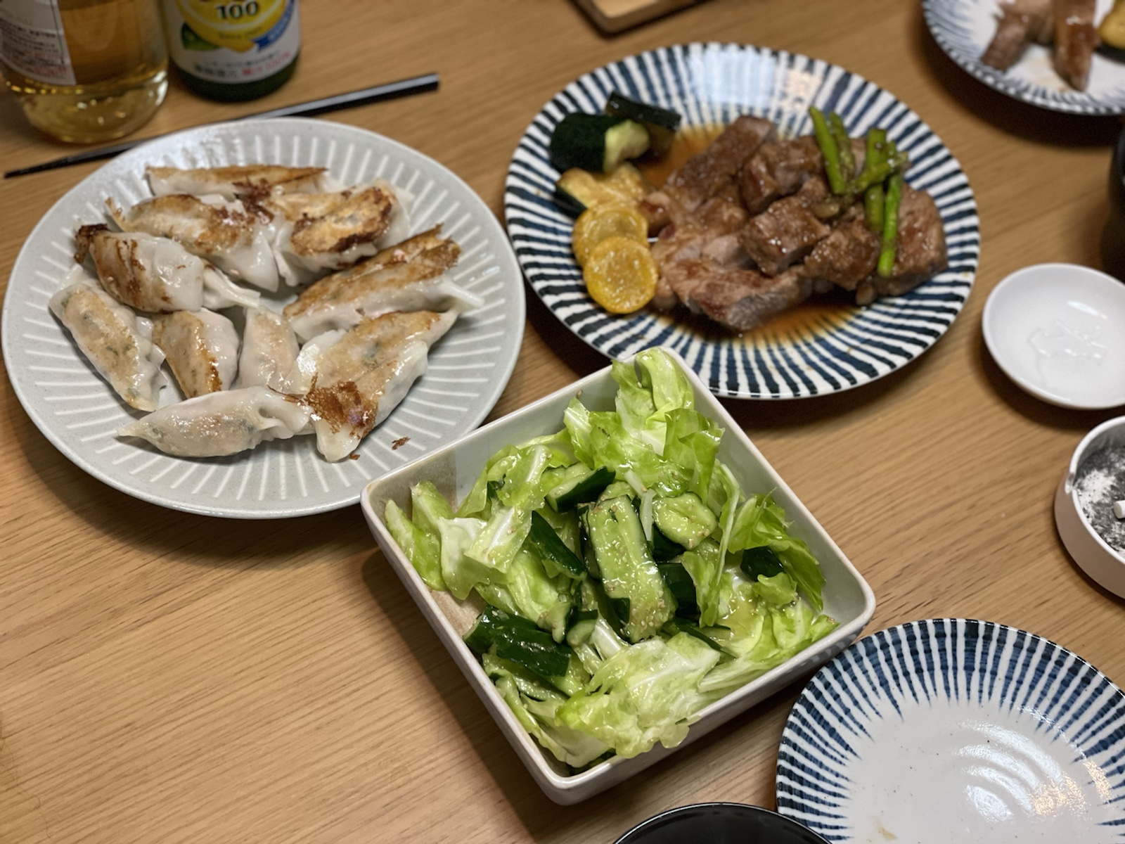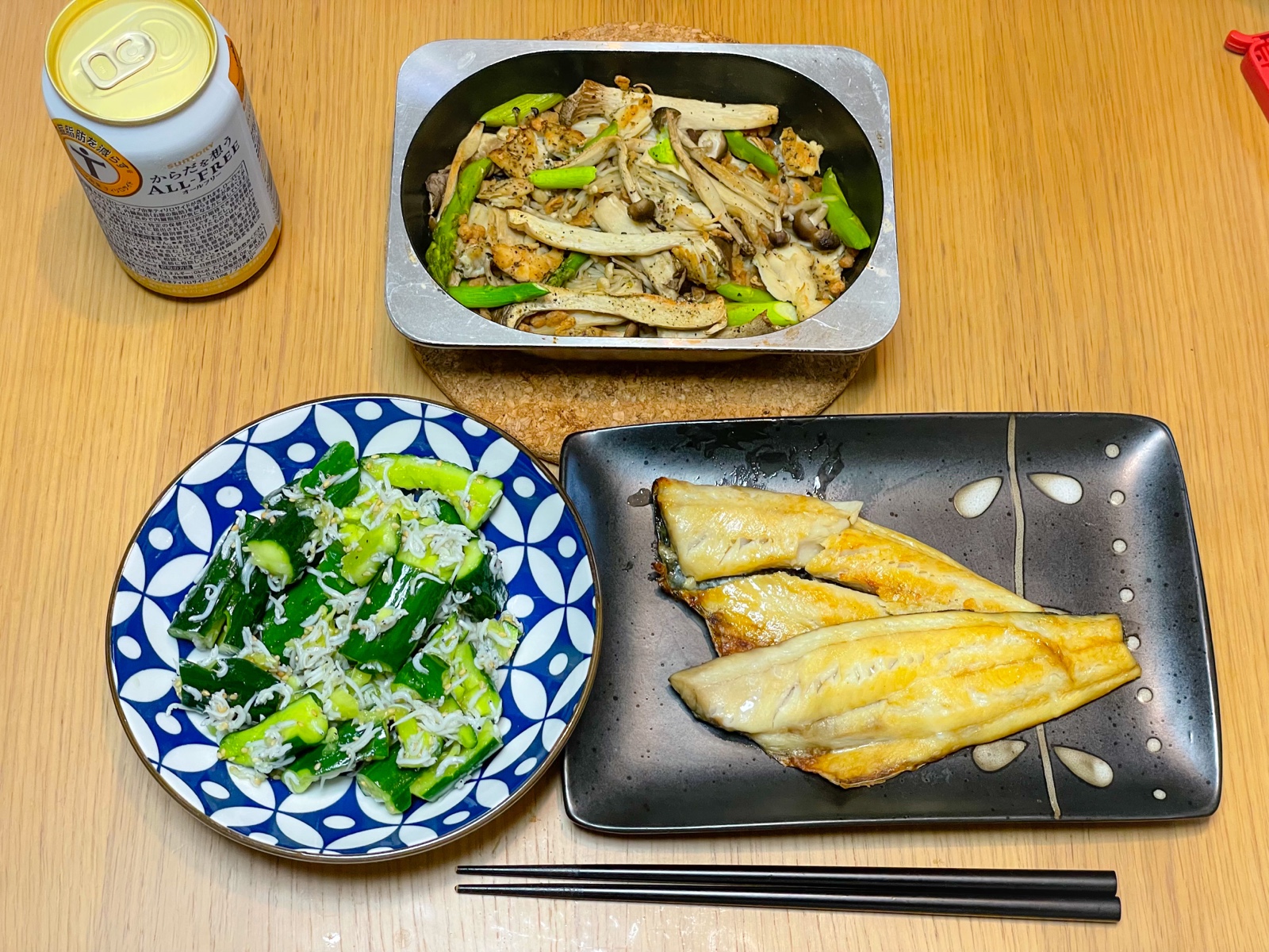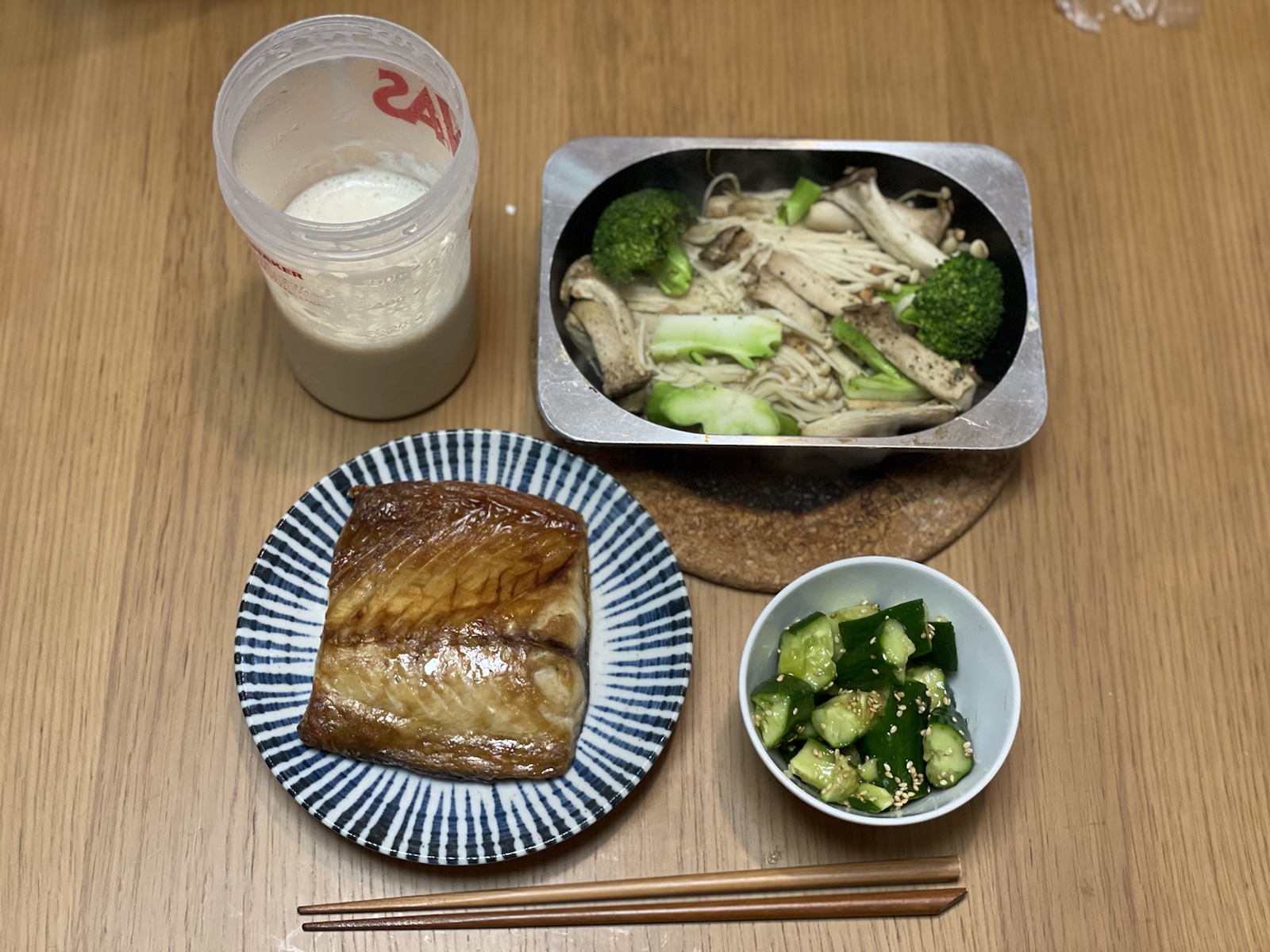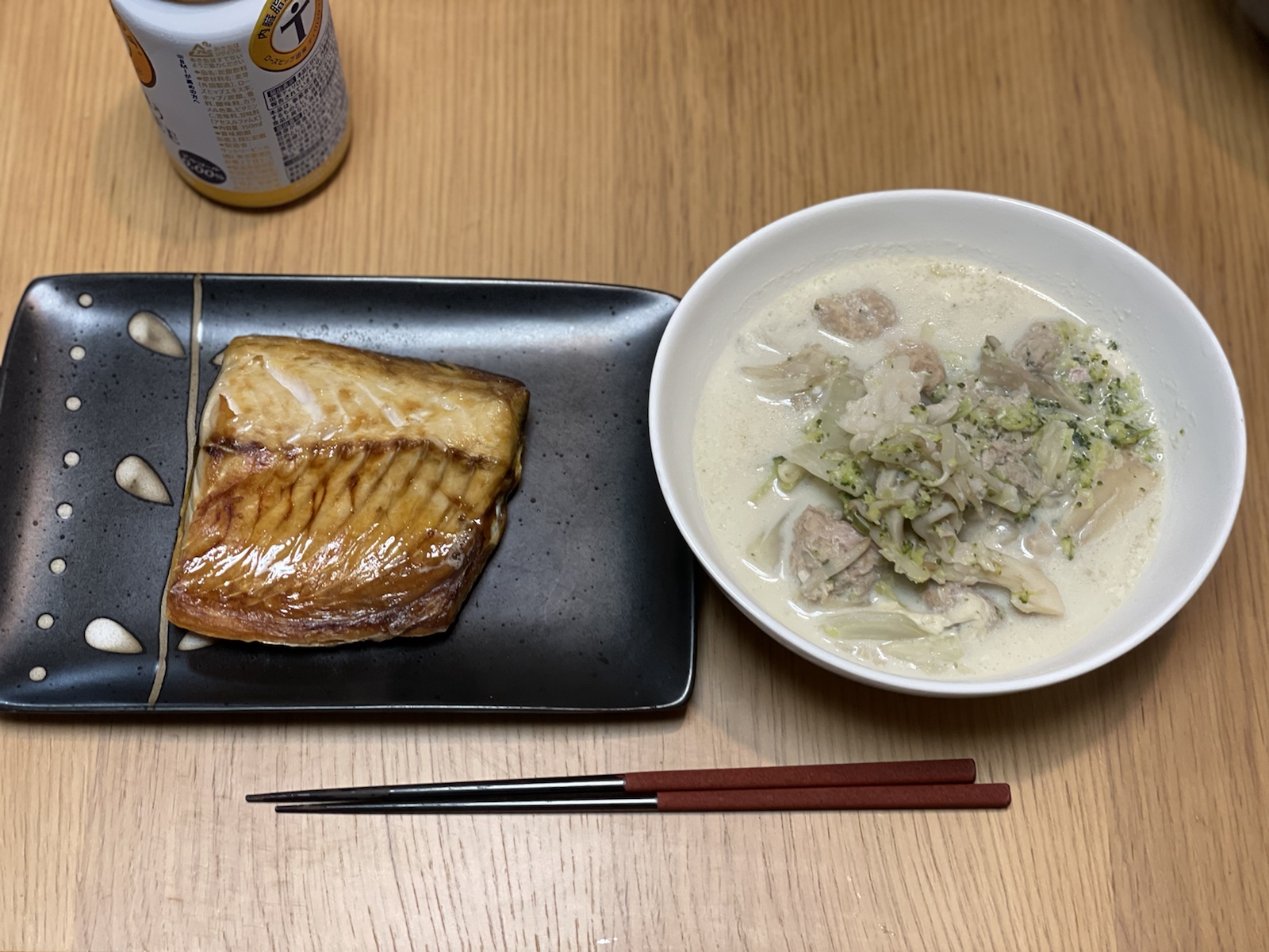 20:00 鯖塩焼き、海老の蒸し餃子、白菜ときのこの豆乳スープ
