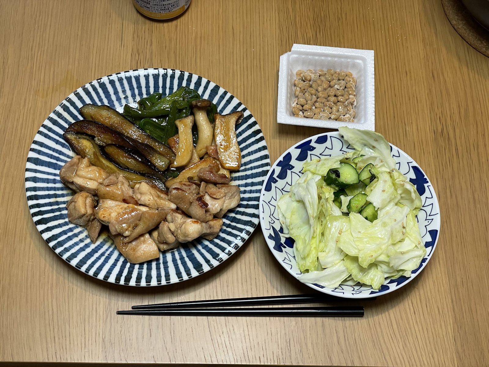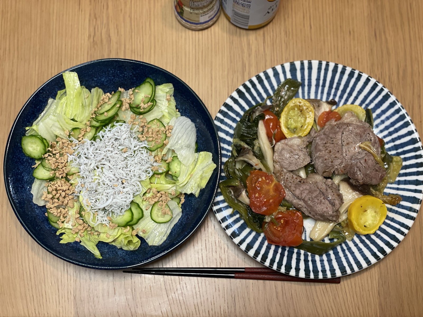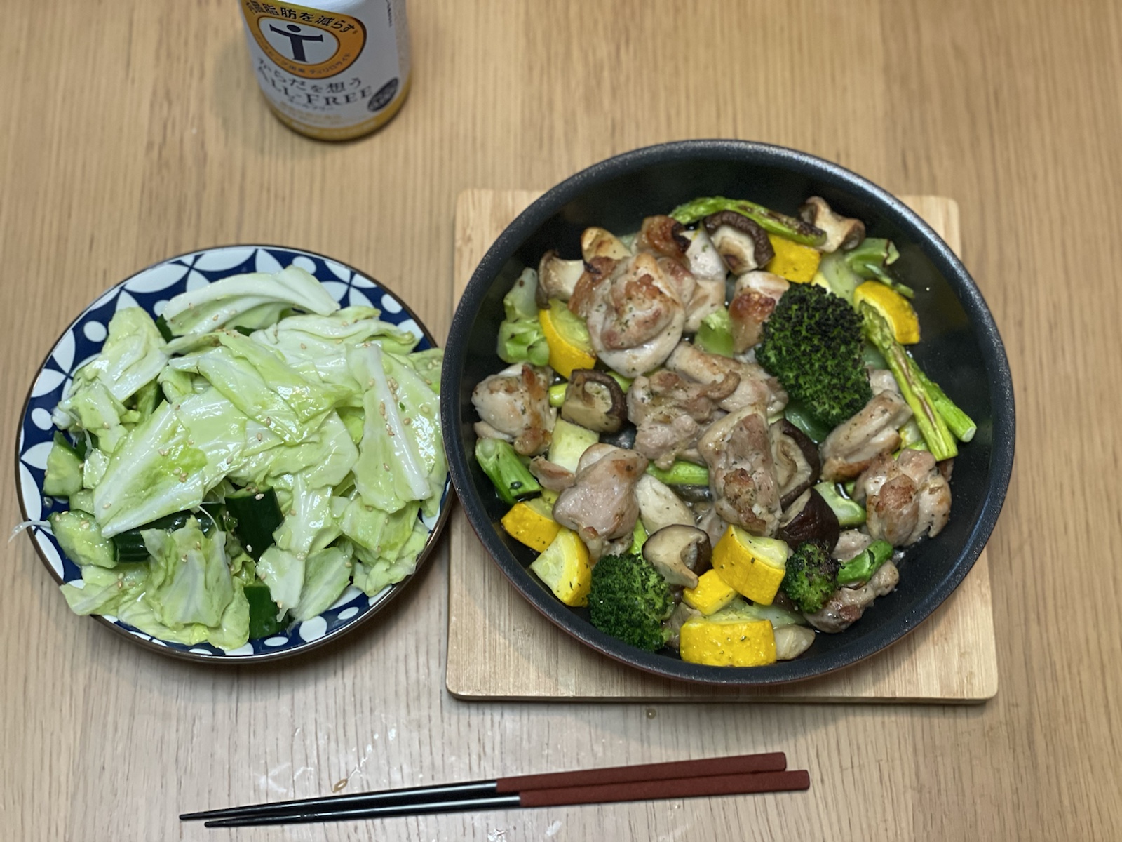 12:30 鶏と野菜の照り焼き、キャベツときゅうりのしらすゴマダレ和え