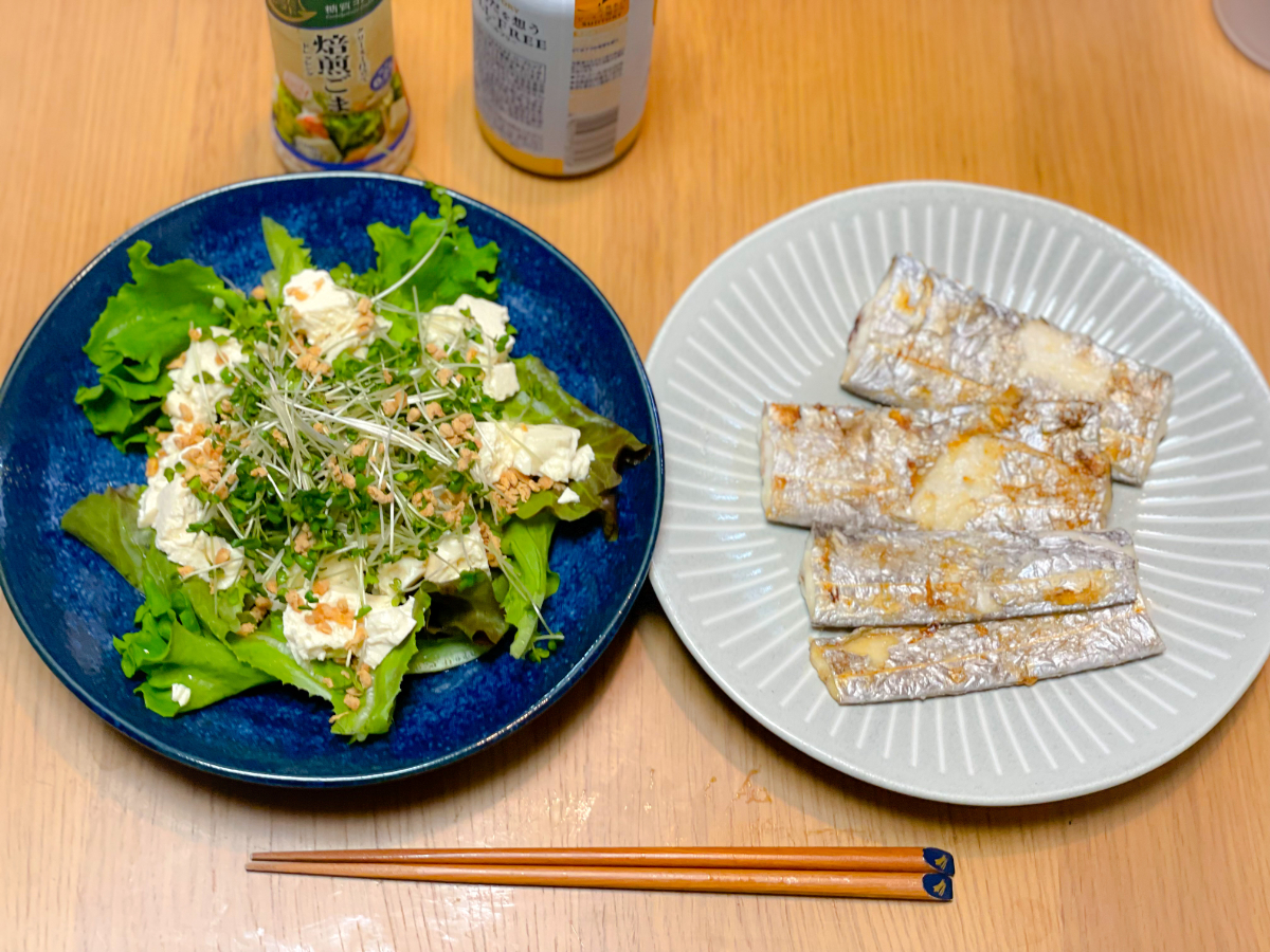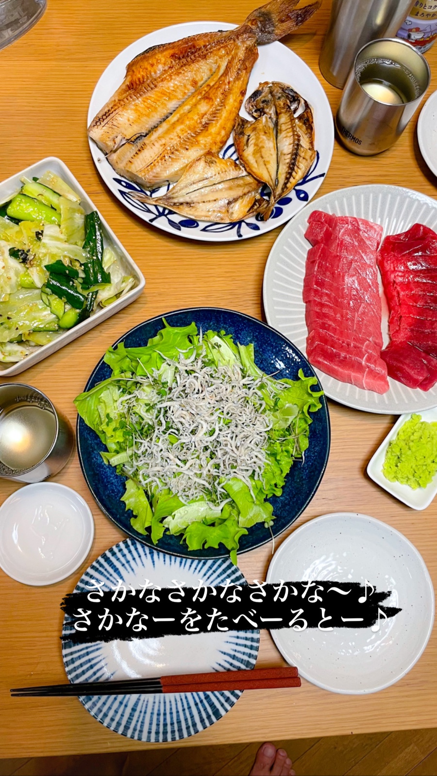 20:00 ほっけ干物、アジ干物、マグロ赤身・中トロ、きゅうりとキャベツのごまだれ和え、じゃことブロッコリースプラウトのサラダ、日本酒1合、ハイボール3杯
