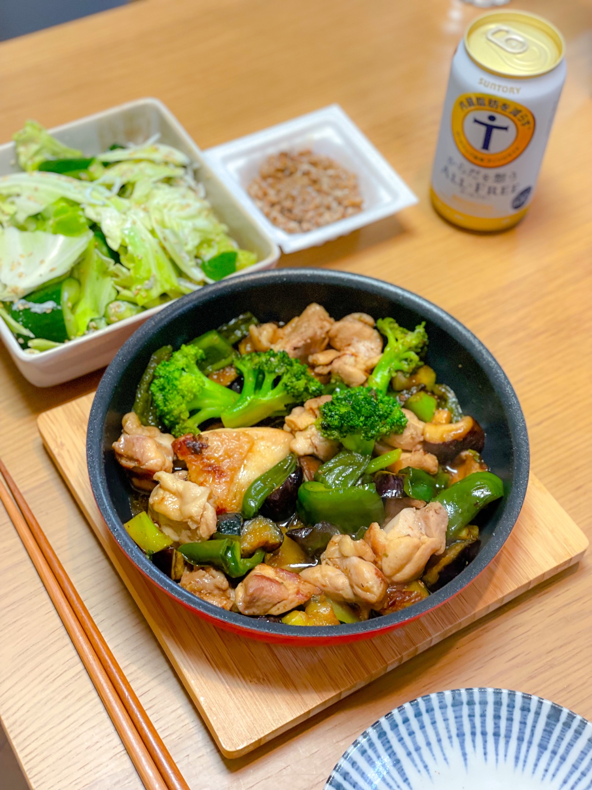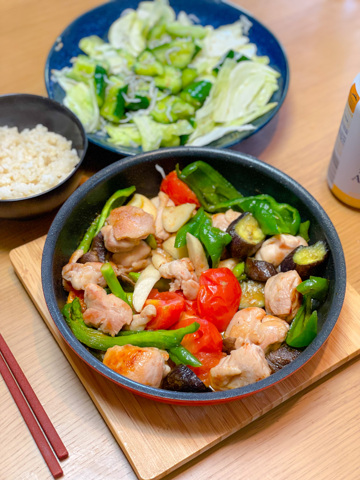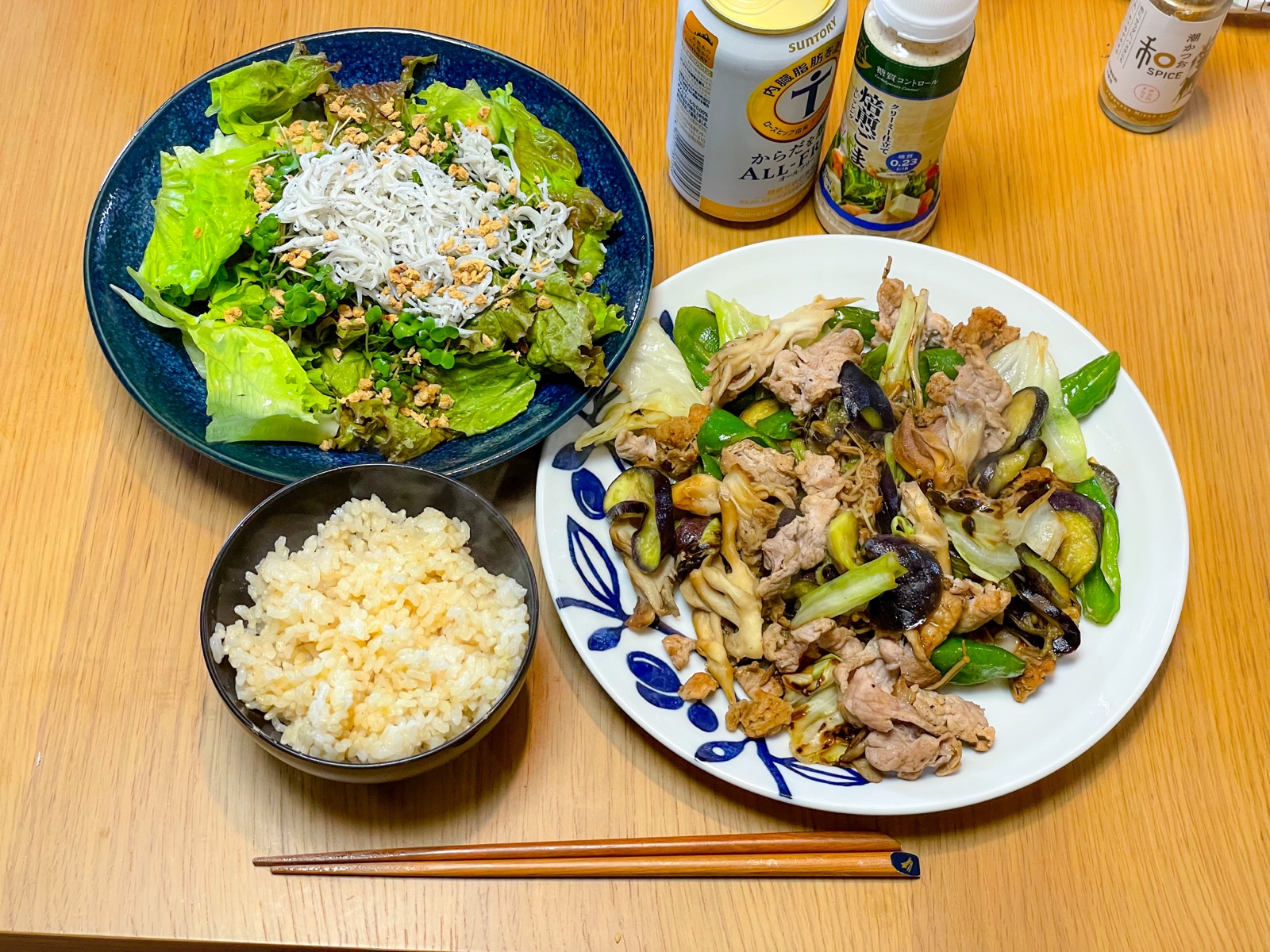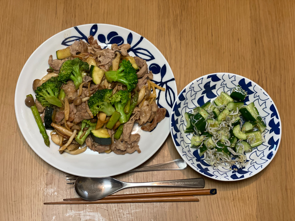 11:30 豚こまとキャベツと夏野菜のノンオイル炒め、しらすとブロッコリースプラウトのサラダ、玄米ご飯
