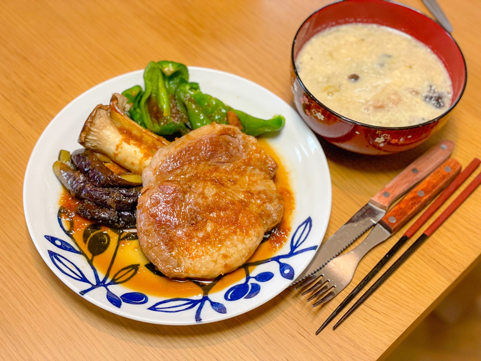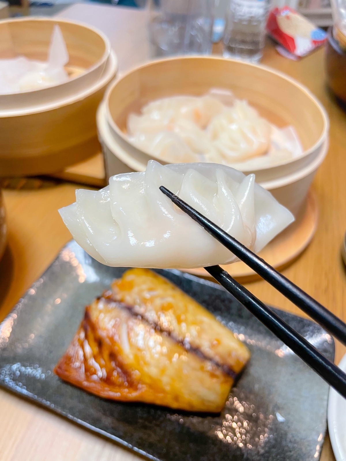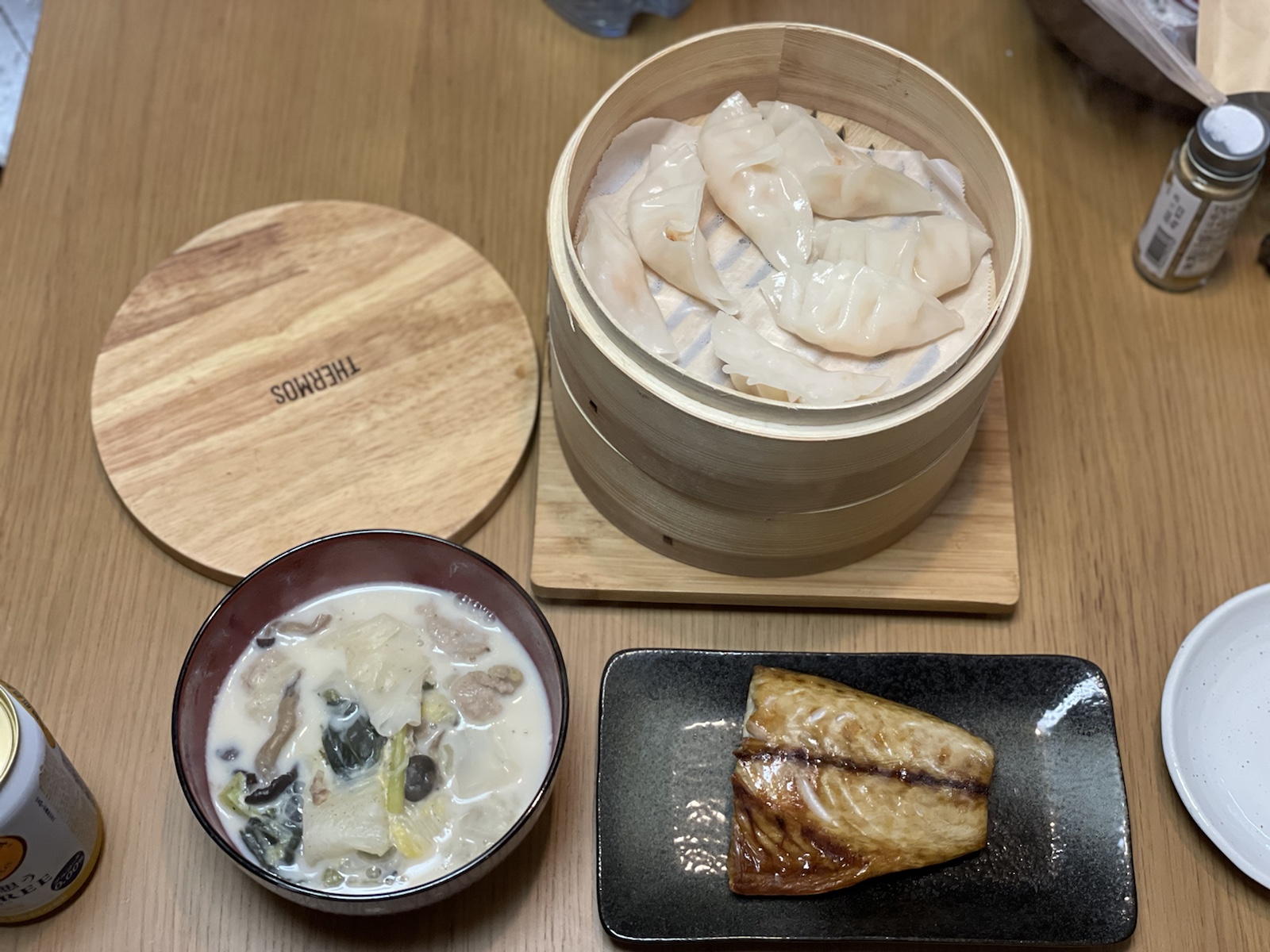 20:00 鯖塩焼き、海老の蒸し餃子、白菜ときのこの豆乳スープ