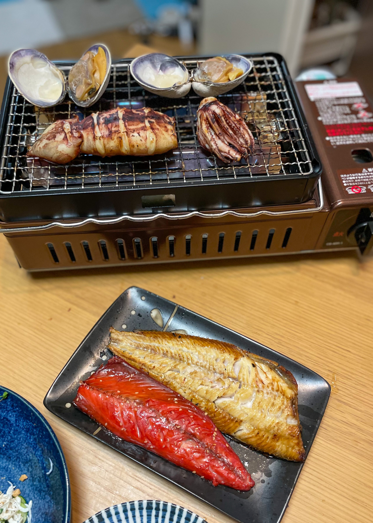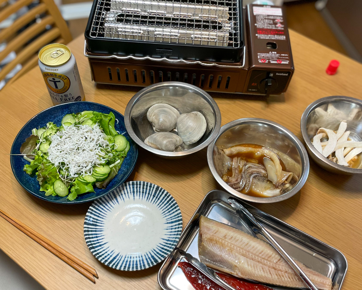 20:00 磯丸水産ごっこ(ホンビノス、スルメイカ2杯、縞ほっけ1尾、鯖みりん干し1尾)、しらすとブロッコリースプラウトときゅうりのサラダ