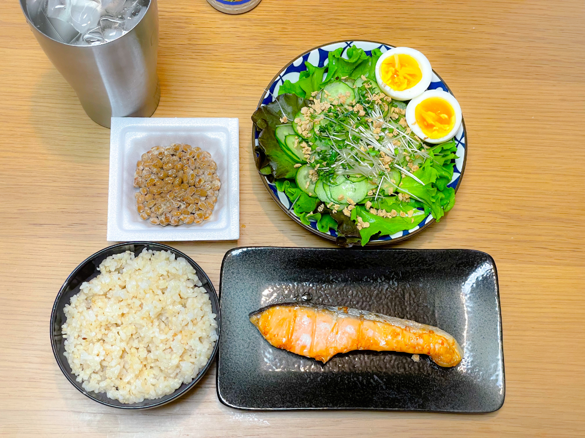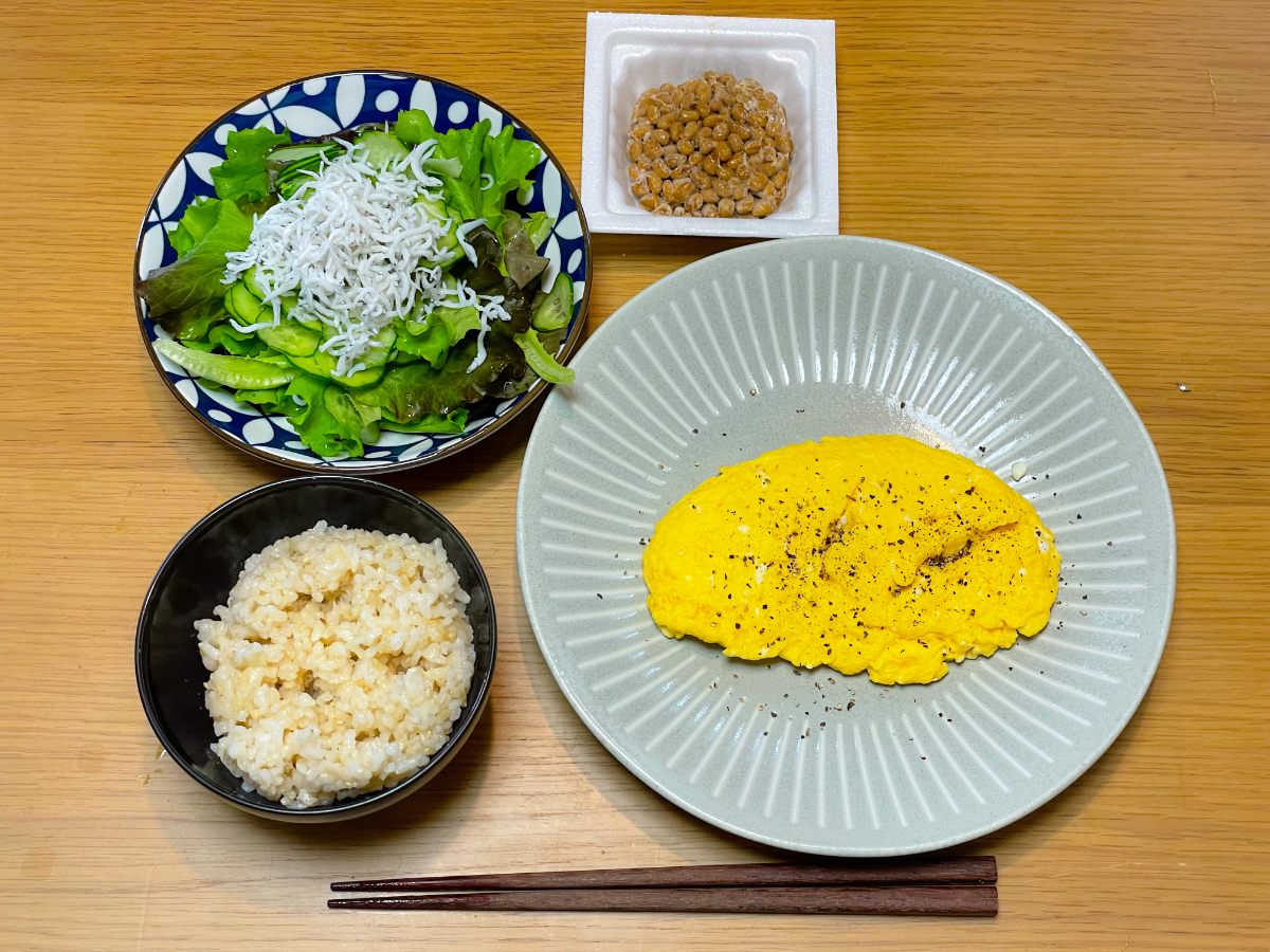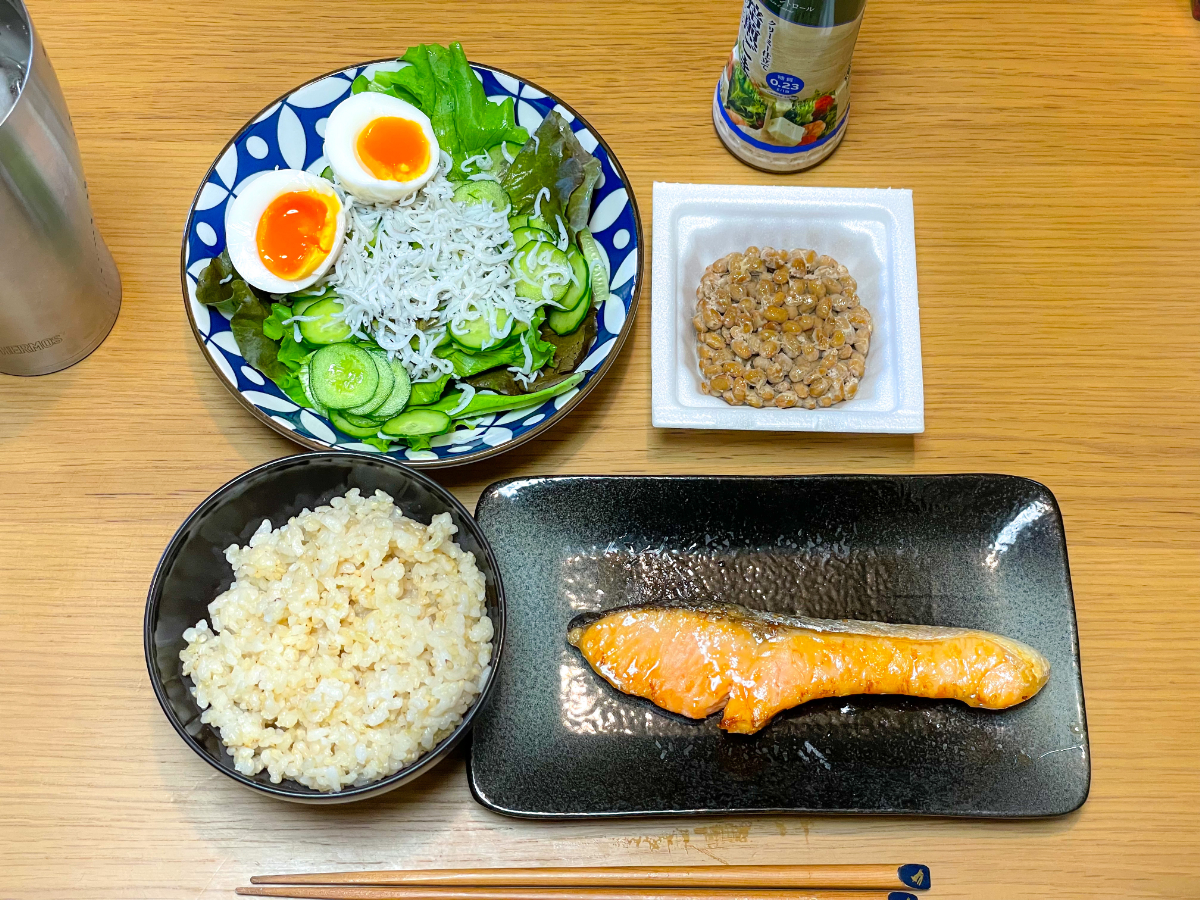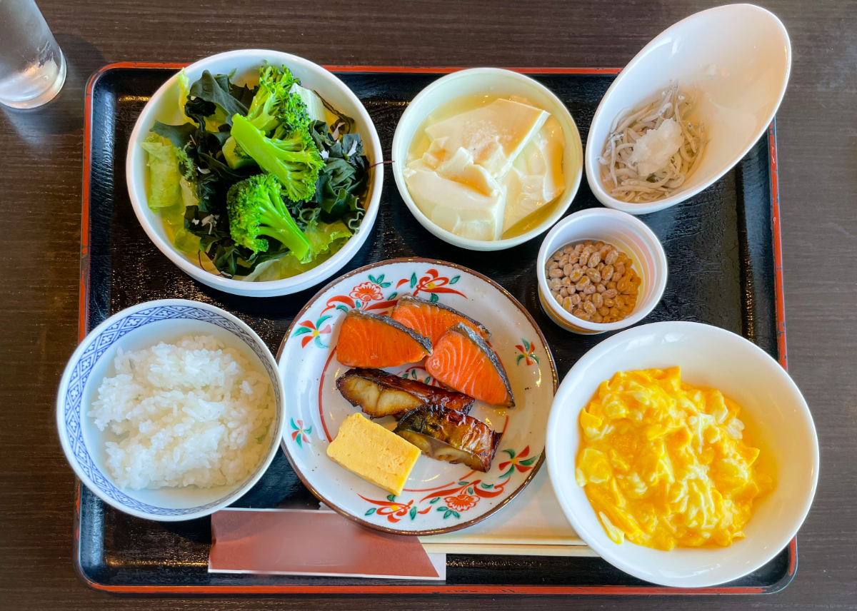 7:00 朝食バイキング(ご飯、スクランブルエッグ、ブロッコリーサラダ、鮭、鯖、卵焼き、豆腐、納豆、しらす)