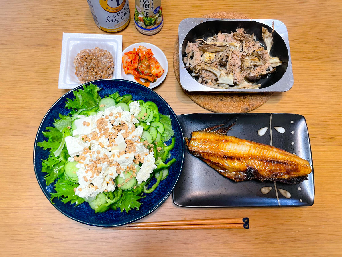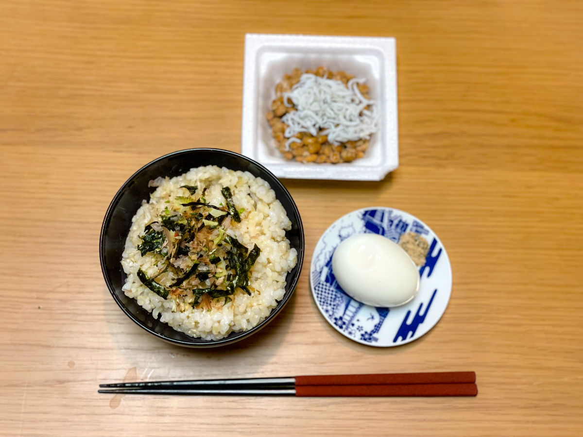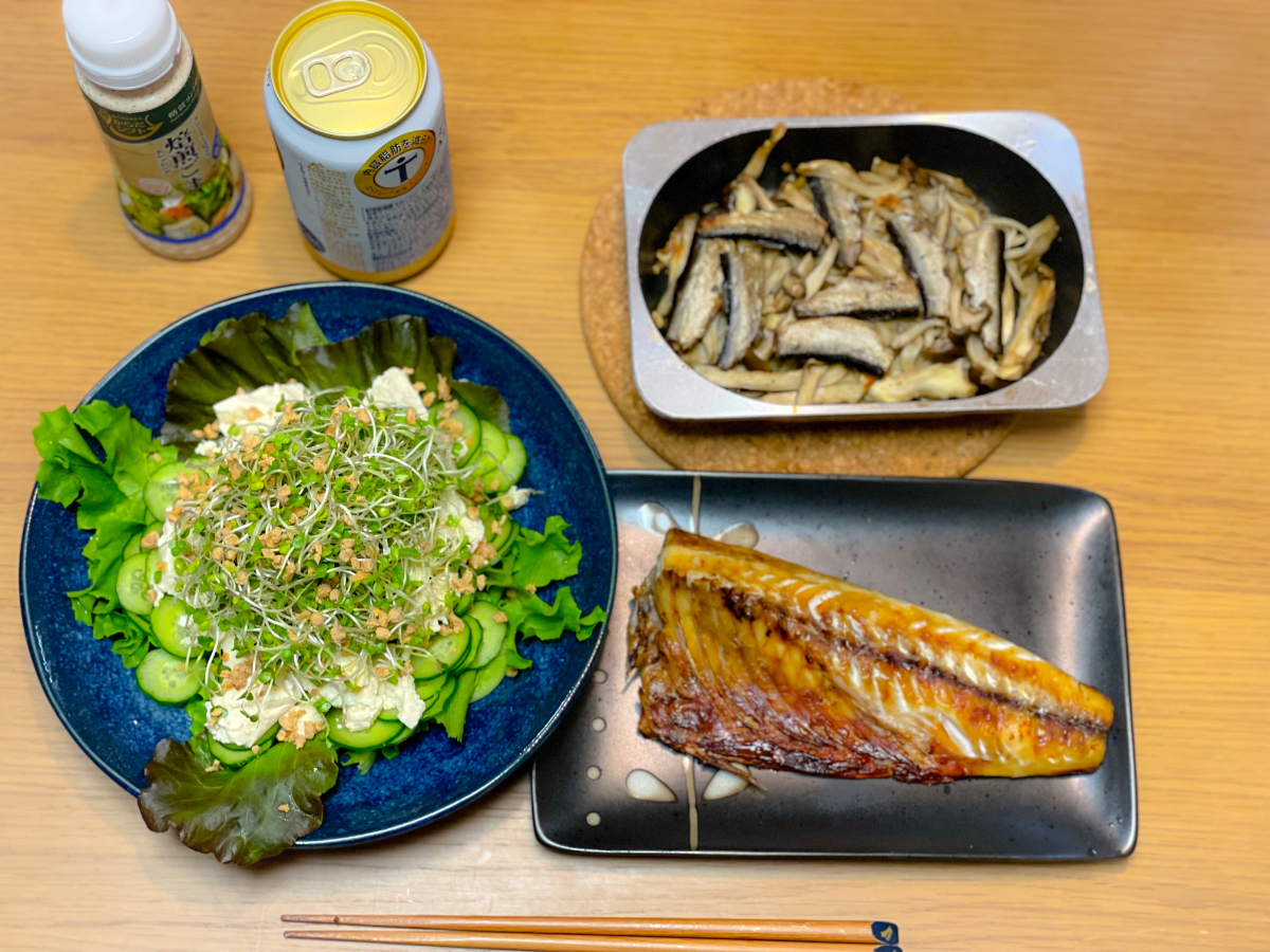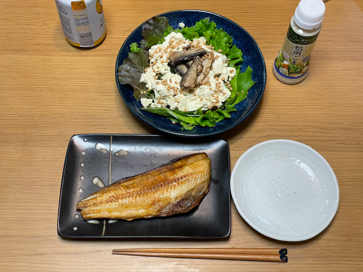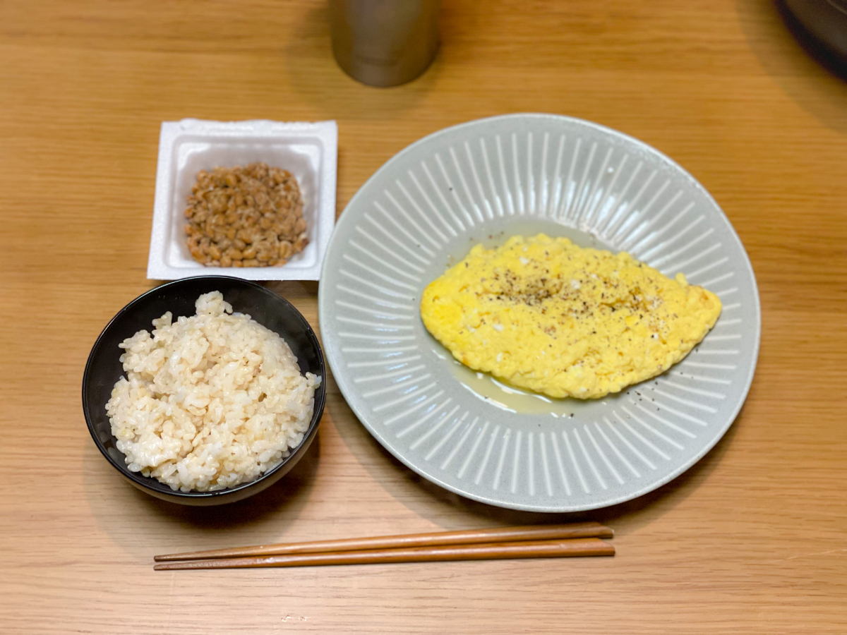 7:00 朝食バイキング(ご飯、スクランブルエッグ、ブロッコリーサラダ、鮭、鯖、卵焼き、豆腐、納豆、しらす)
