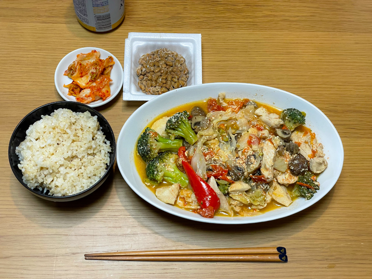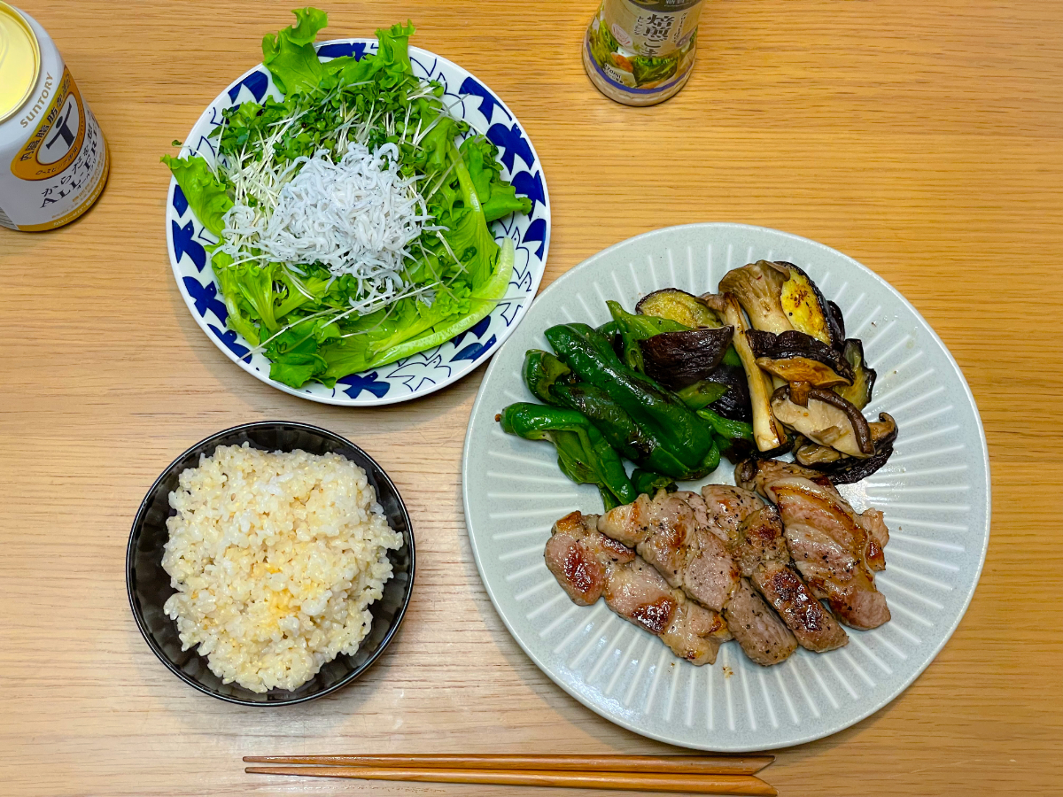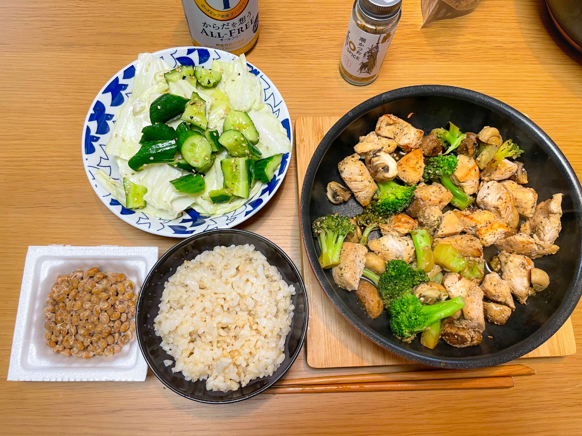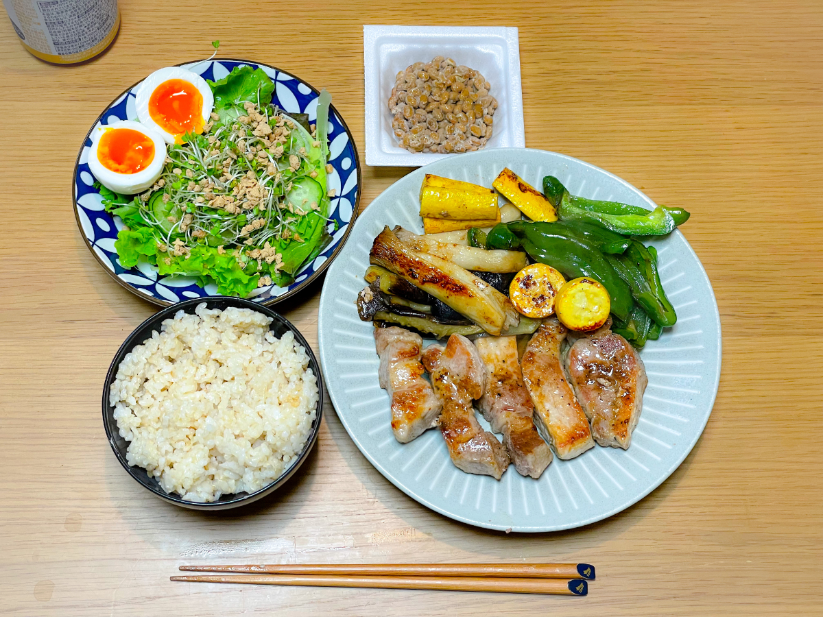 7:00 朝食バイキング(ご飯、スクランブルエッグ、ブロッコリーサラダ、鮭、鯖、卵焼き、豆腐、納豆、しらす)