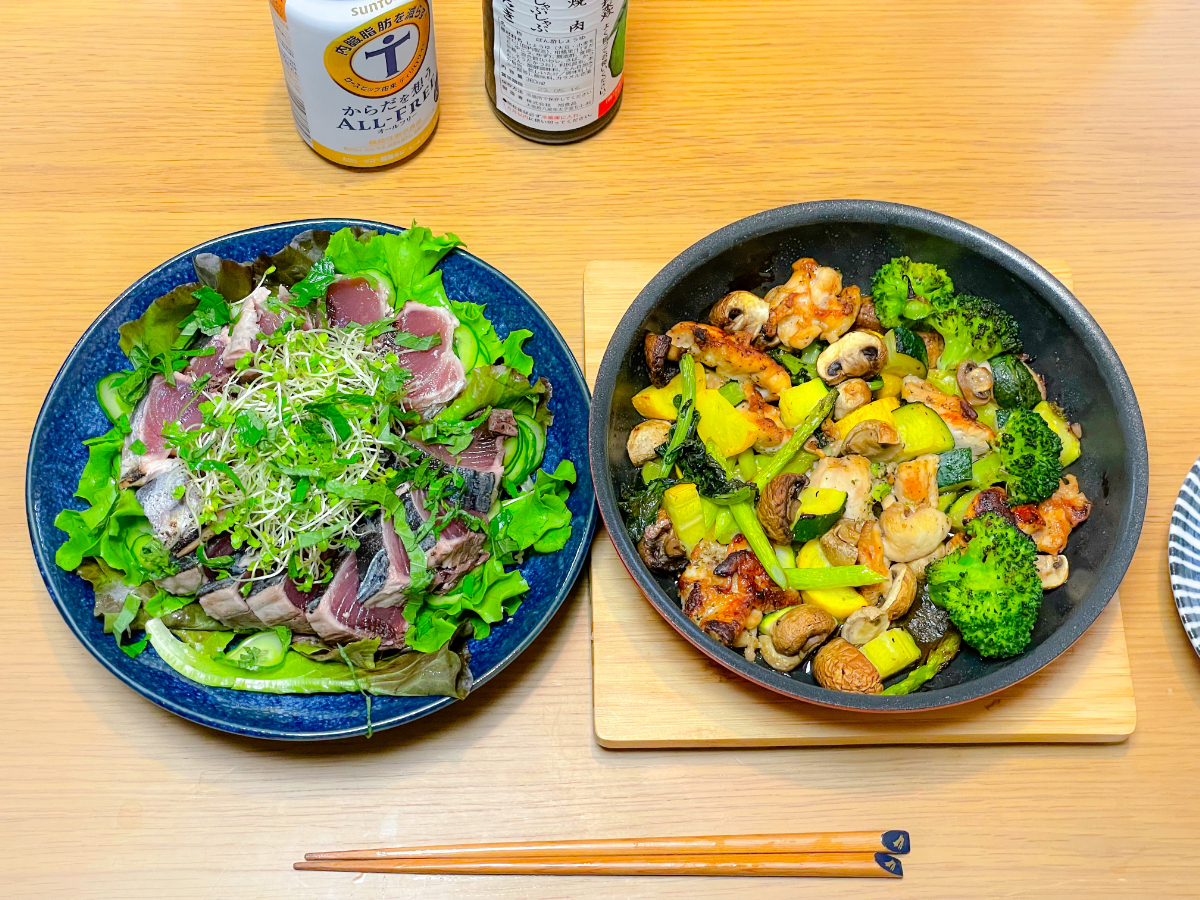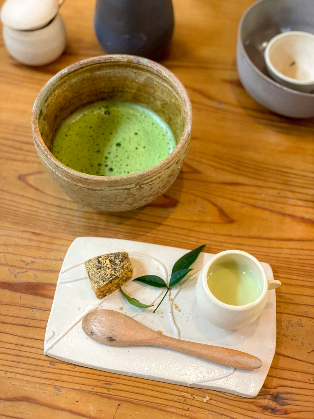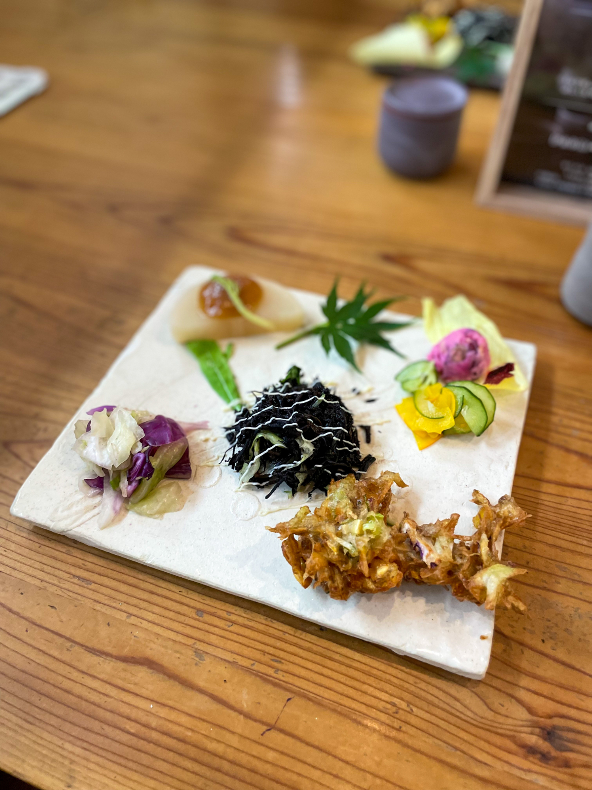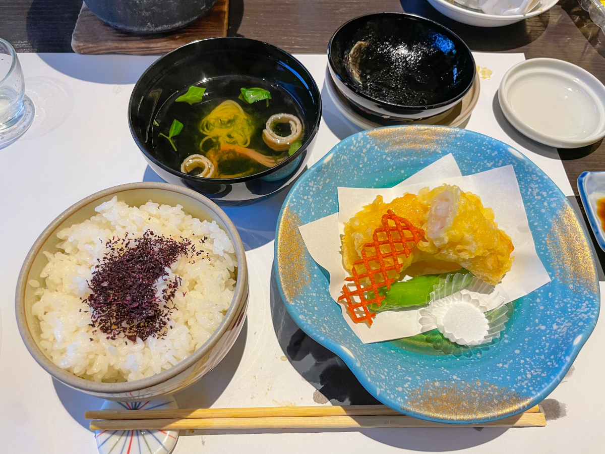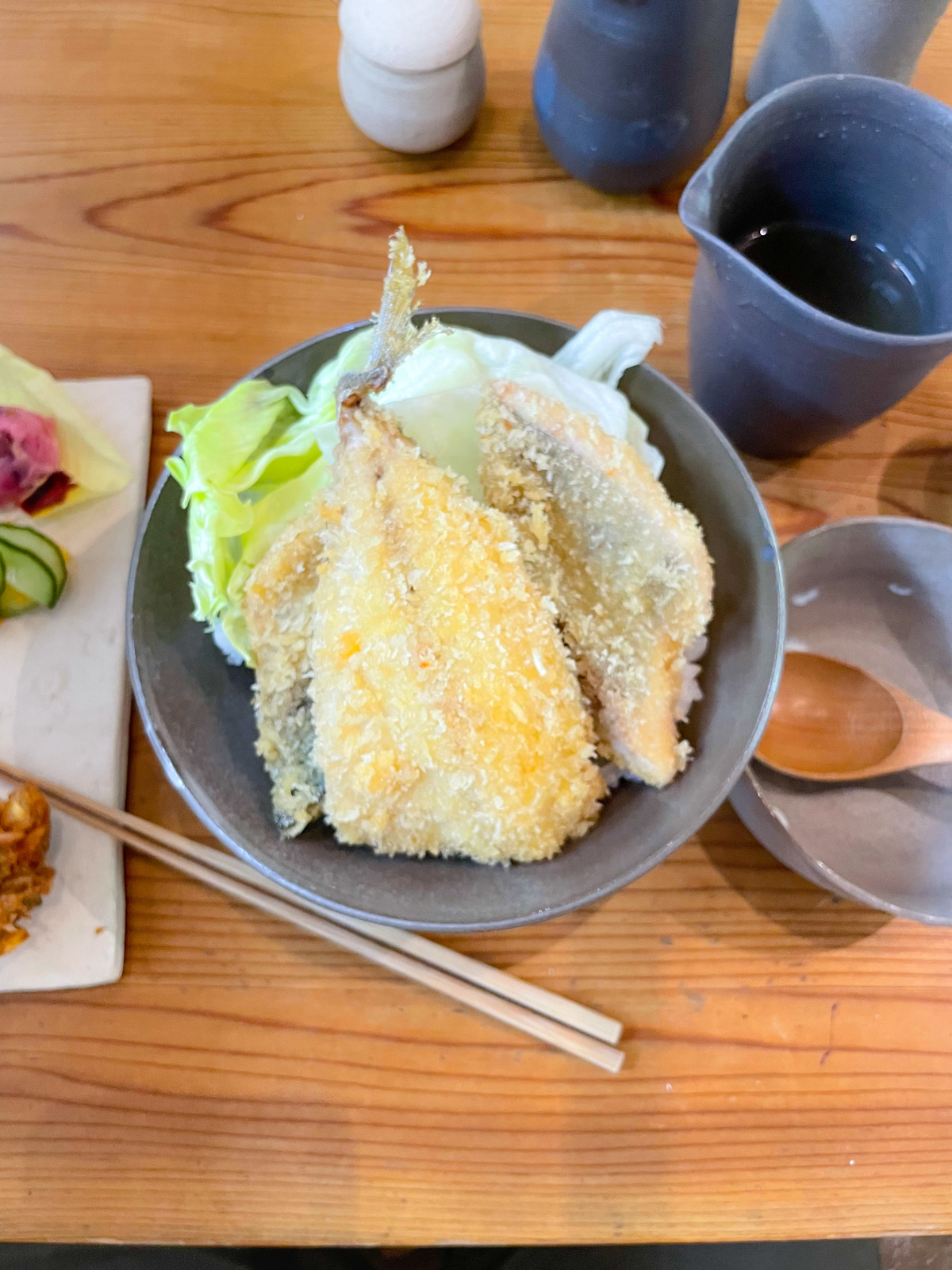11:00 地魚フライ丼(アジ、ハマチ、あと失念)、前菜プレート(野菜)、抹茶と黒糖わらびもち、抹茶プリン