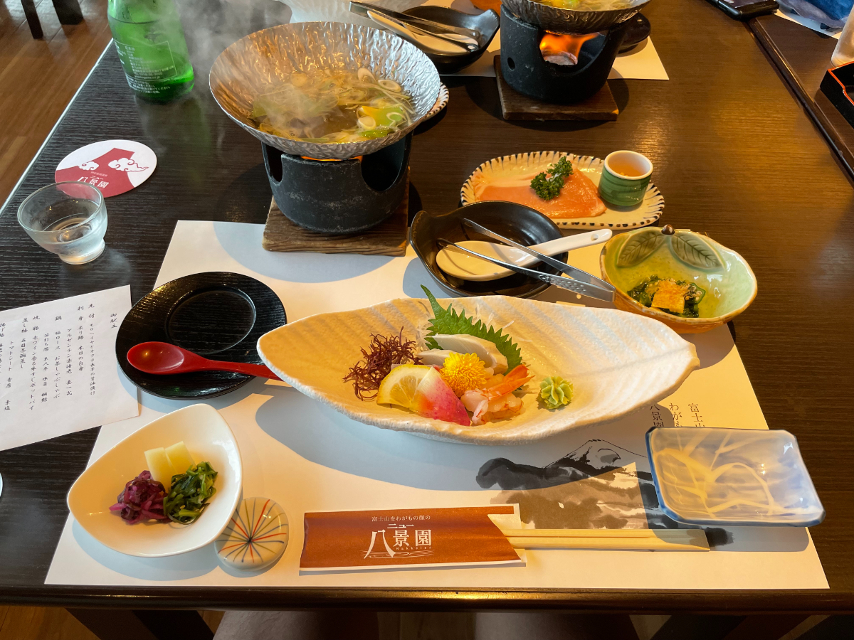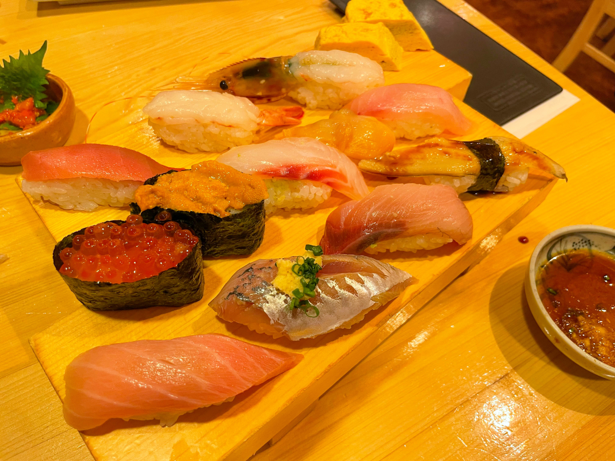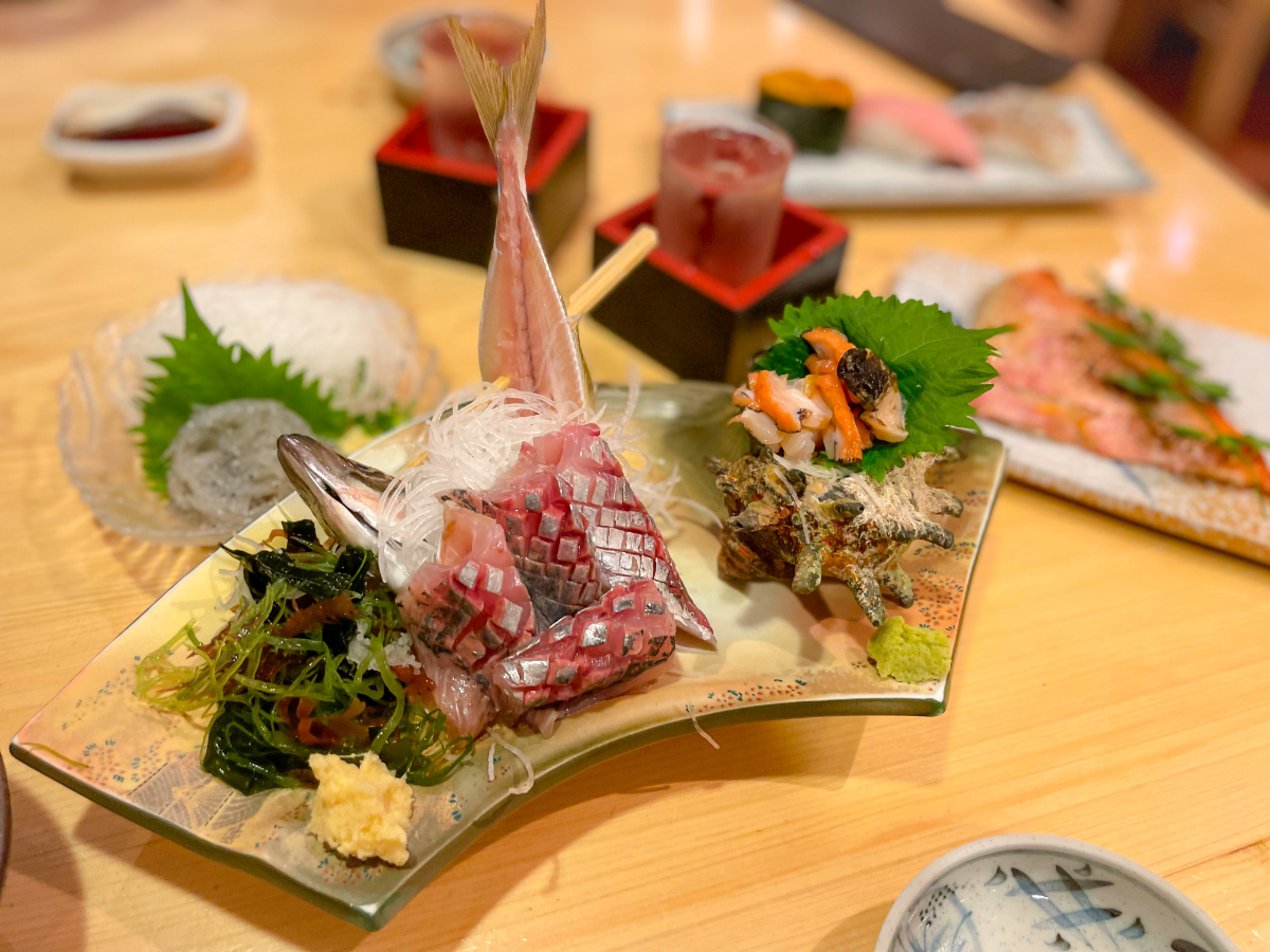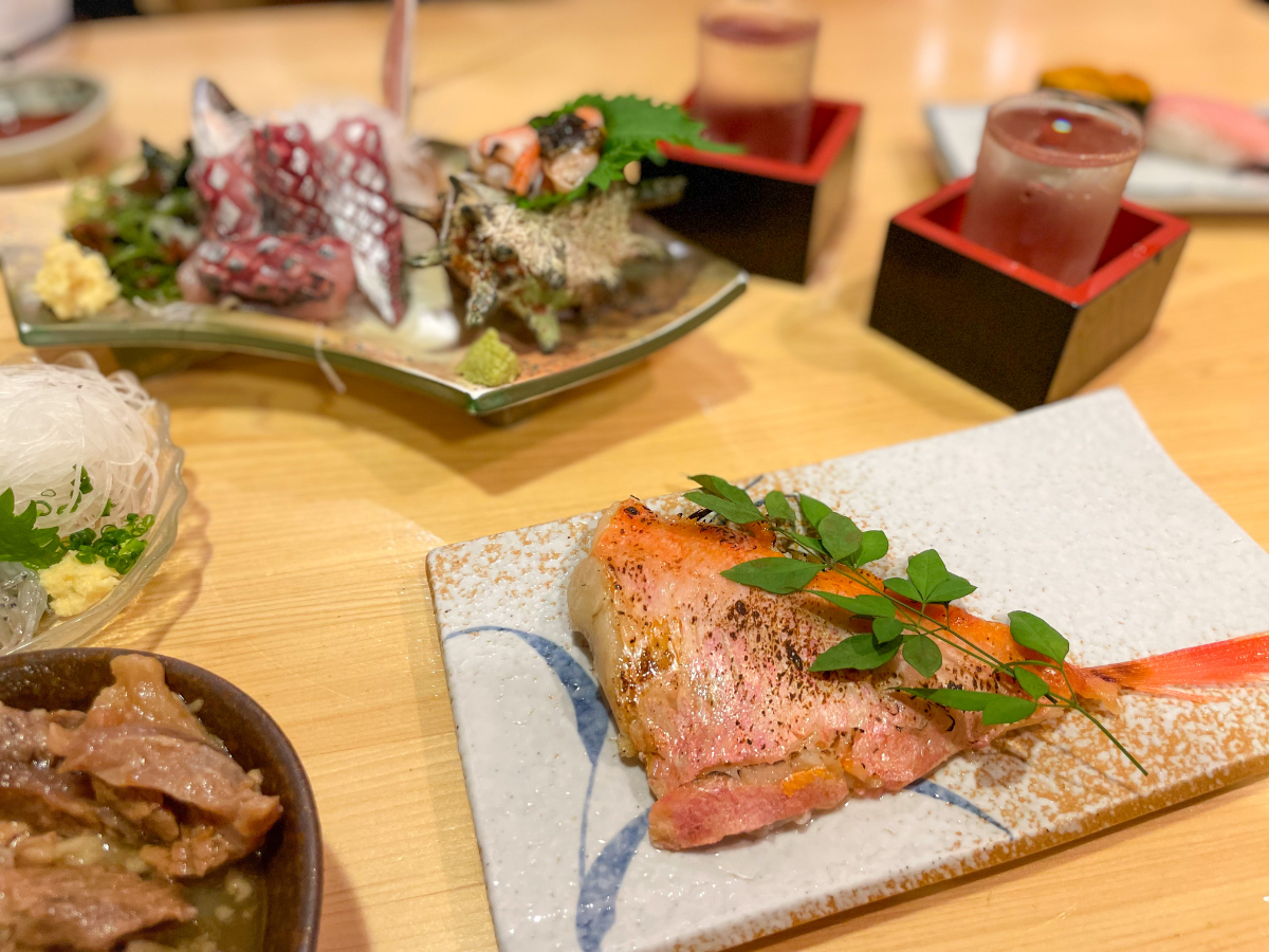 17:00 日本酒4合、刺身(アジ、さざえ)、生しらす、牛すじ煮込み、金目鯛の西京焼き、寿司12貫