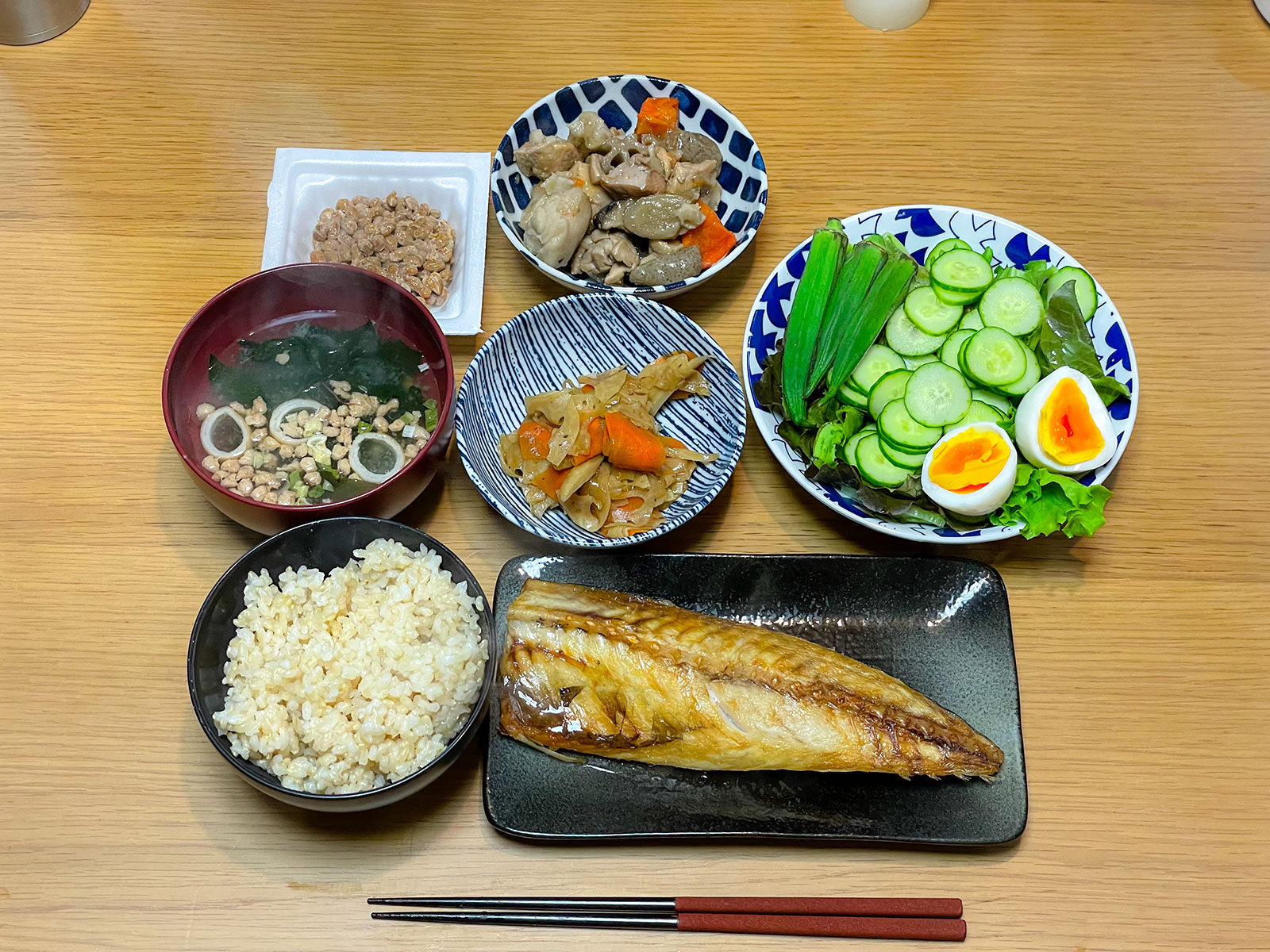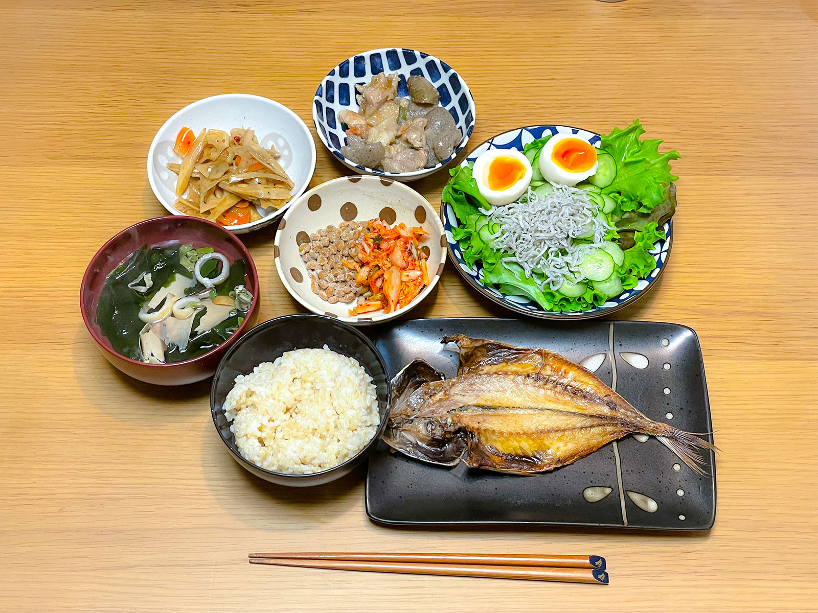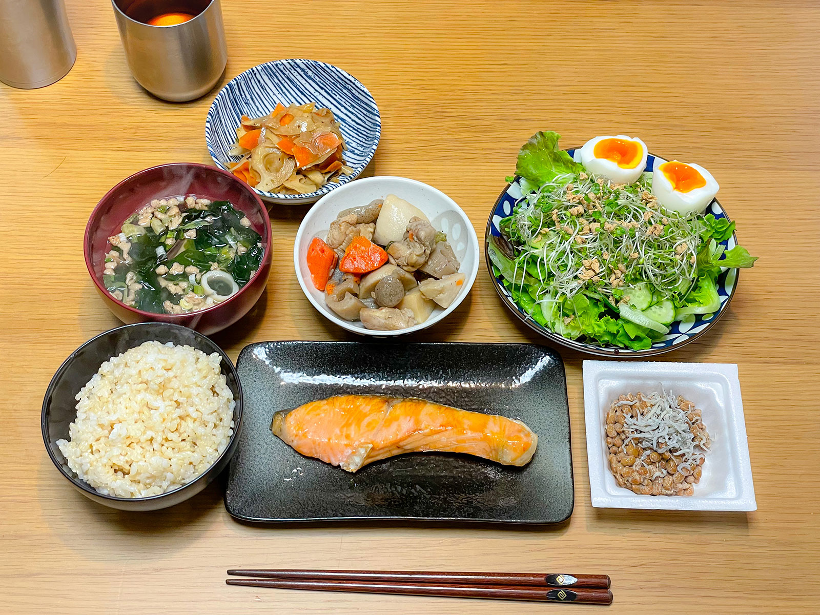 7:00 いつものスムージー、焼き鮭、しらすサラダ、ゆで卵、味噌汁、納豆、玄米ご飯