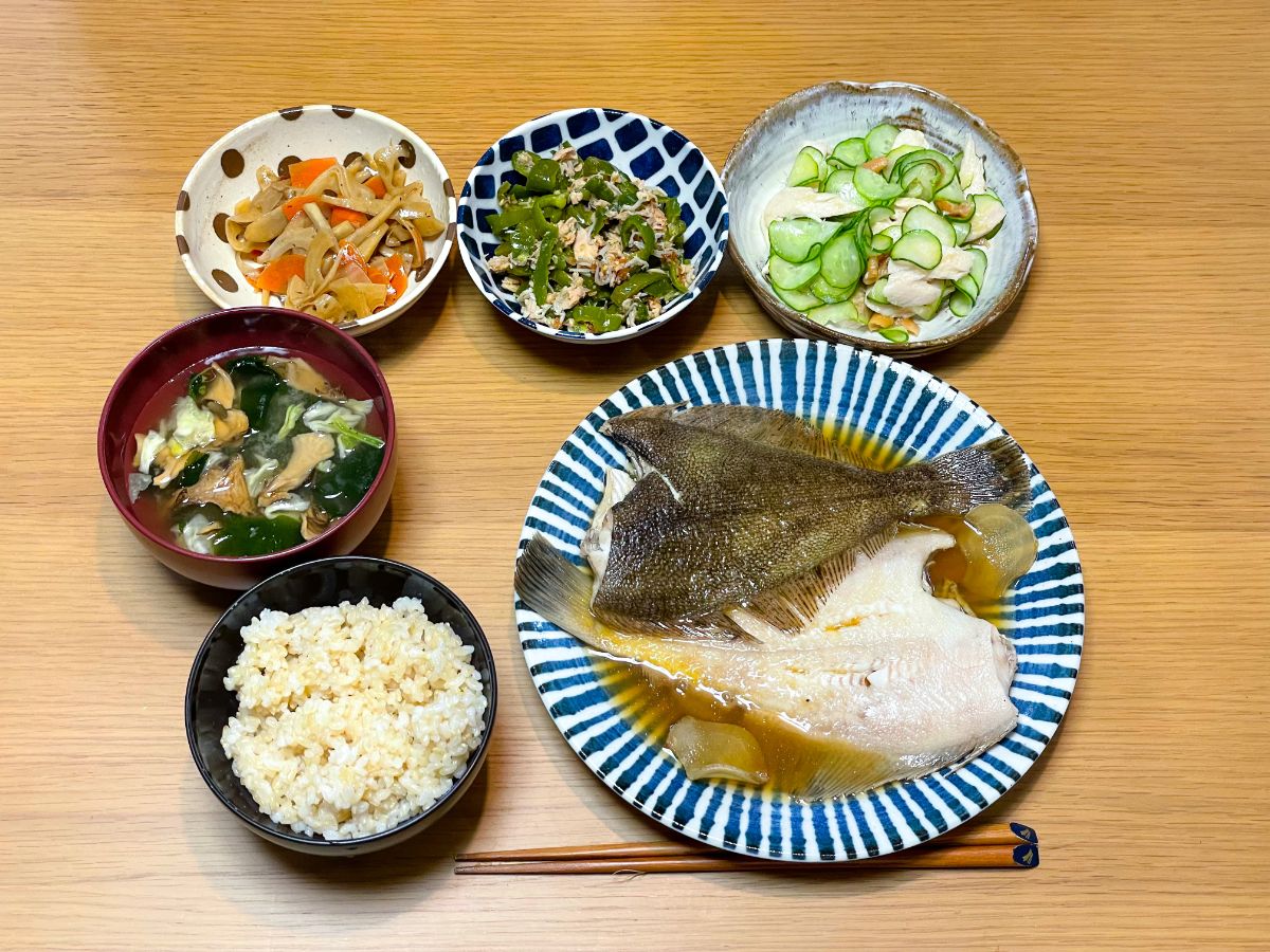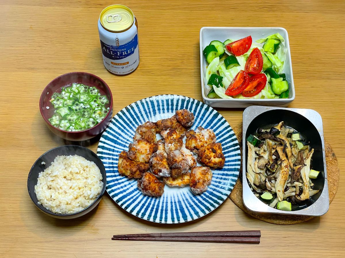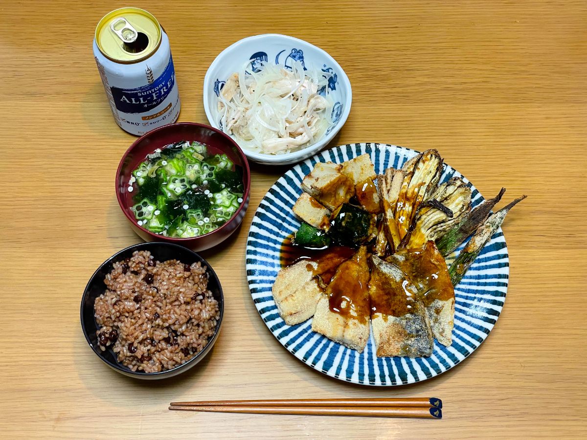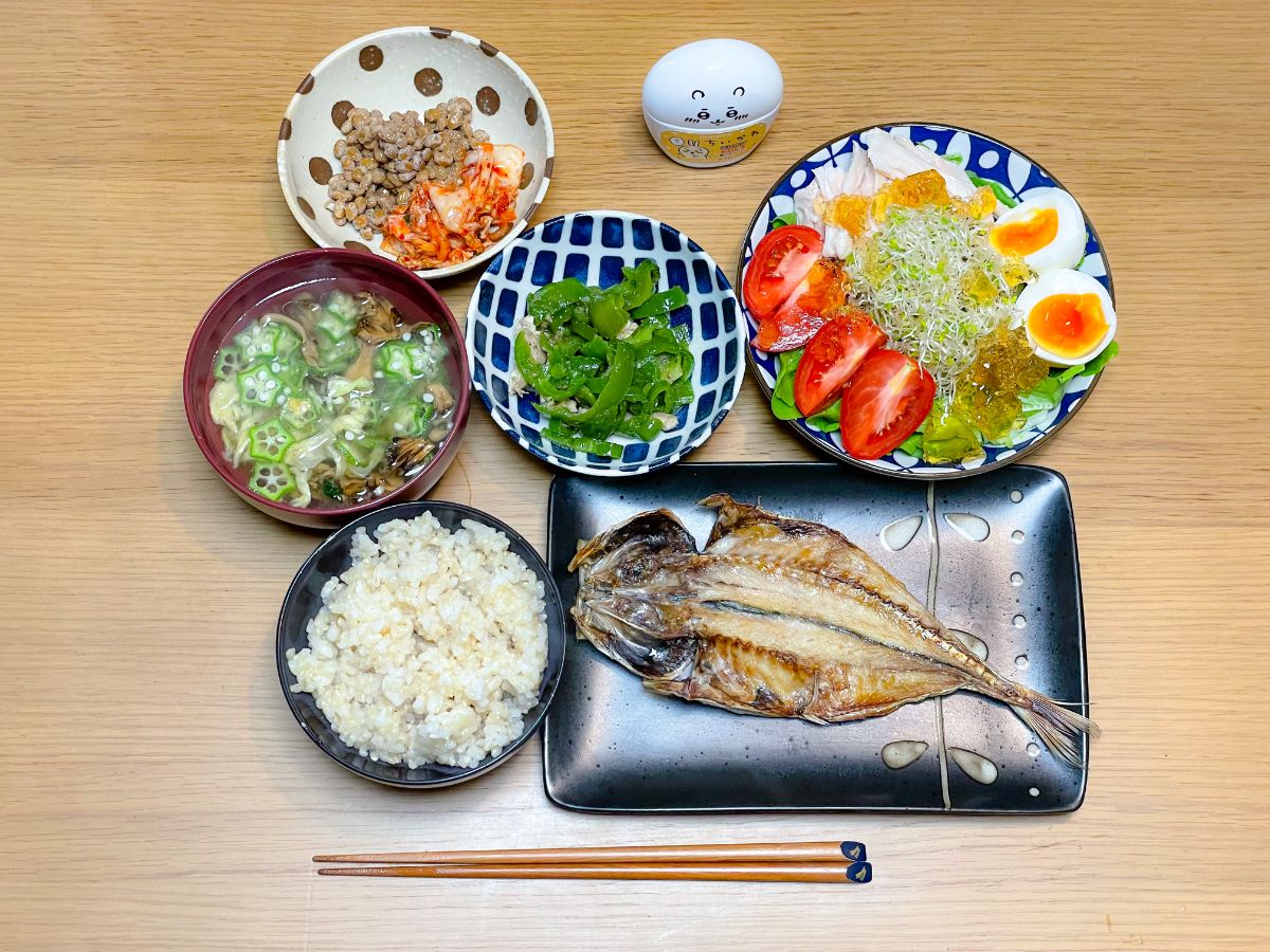 12:00 鯵干物、サラダチキンとオクラの梅干し和え、きゅうりとトマトのリンゴ酢和え、ピーマンしらす炒め、きのこの素焼き、オクラの味噌汁、玄米&酵素玄米ごはん