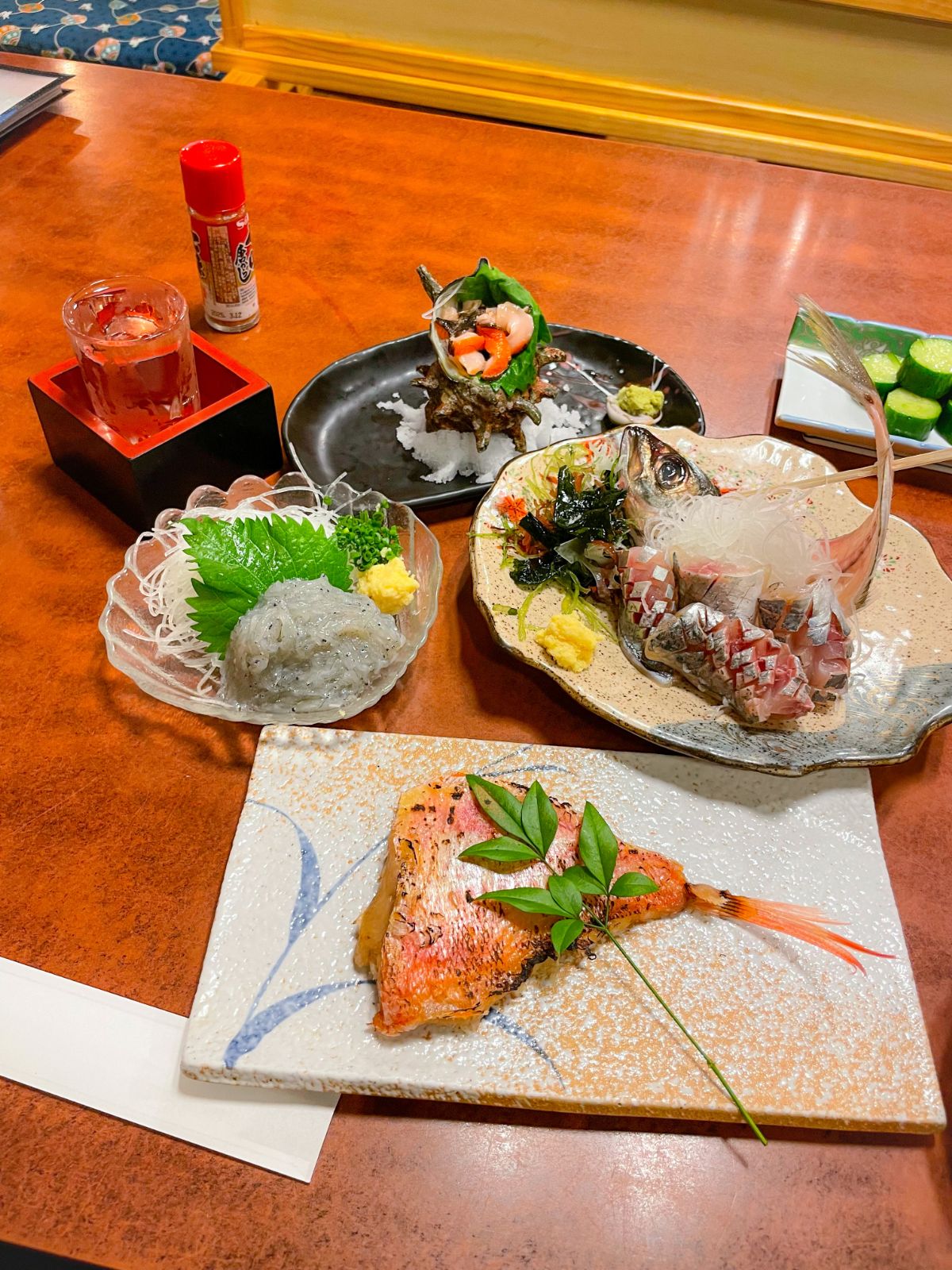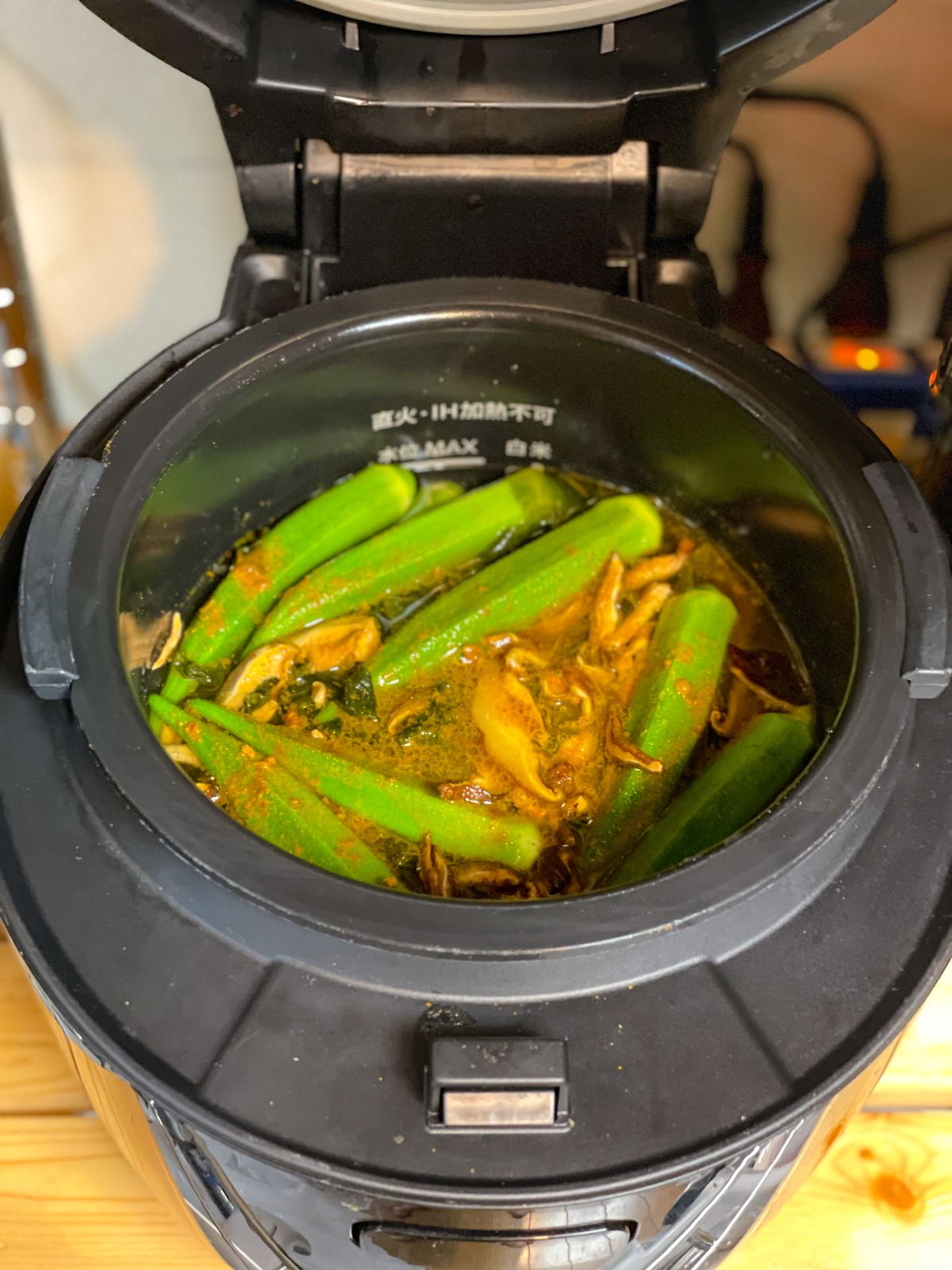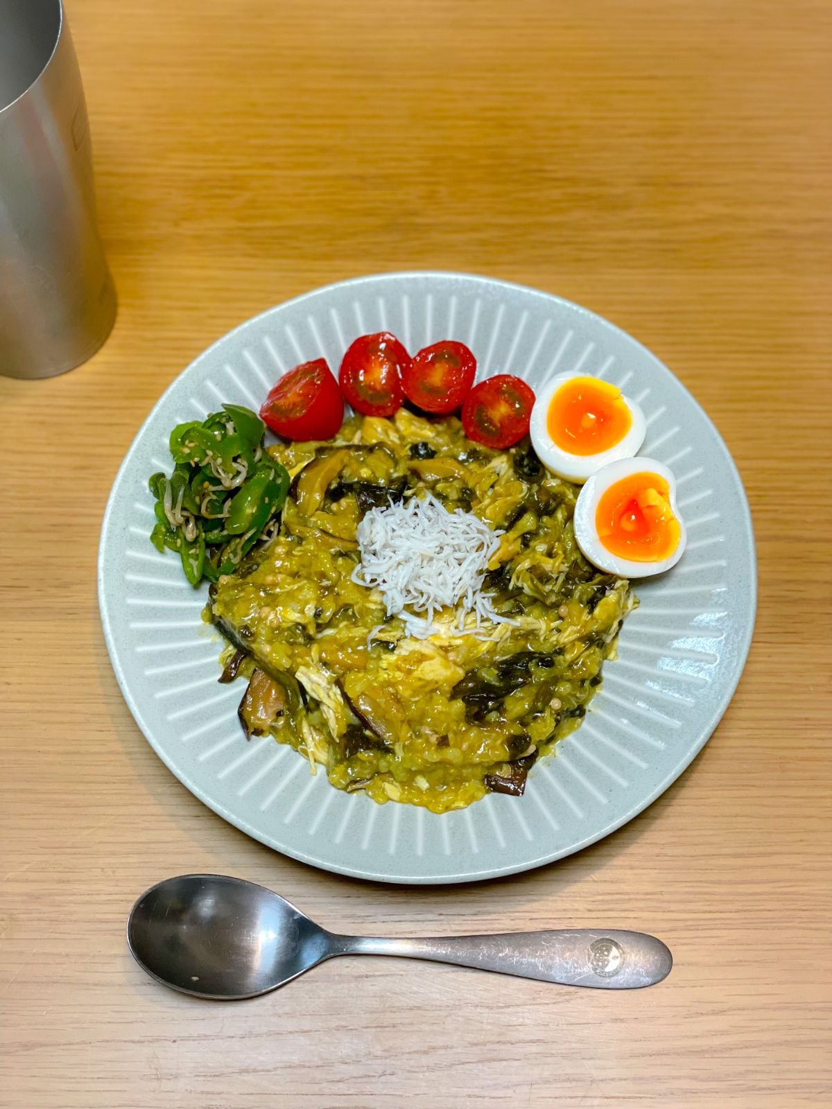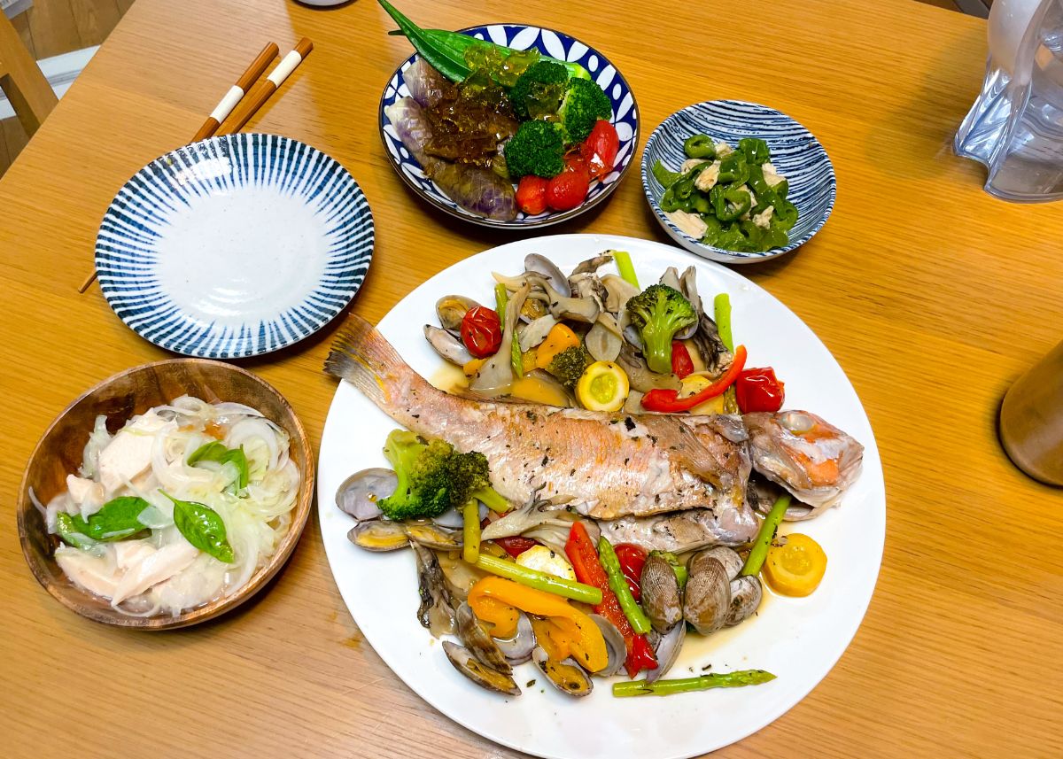 12:00 鯵干物、サラダチキンとオクラの梅干し和え、きゅうりとトマトのリンゴ酢和え、ピーマンしらす炒め、きのこの素焼き、オクラの味噌汁、玄米&酵素玄米ごはん
