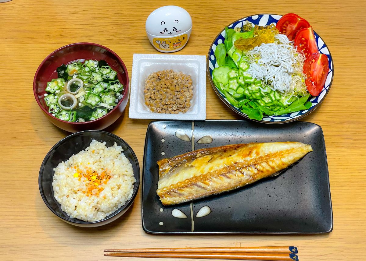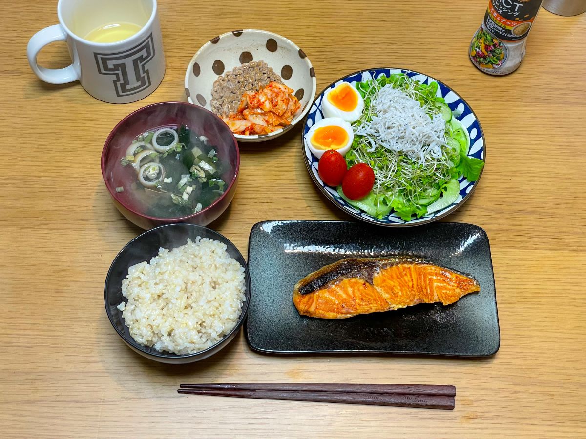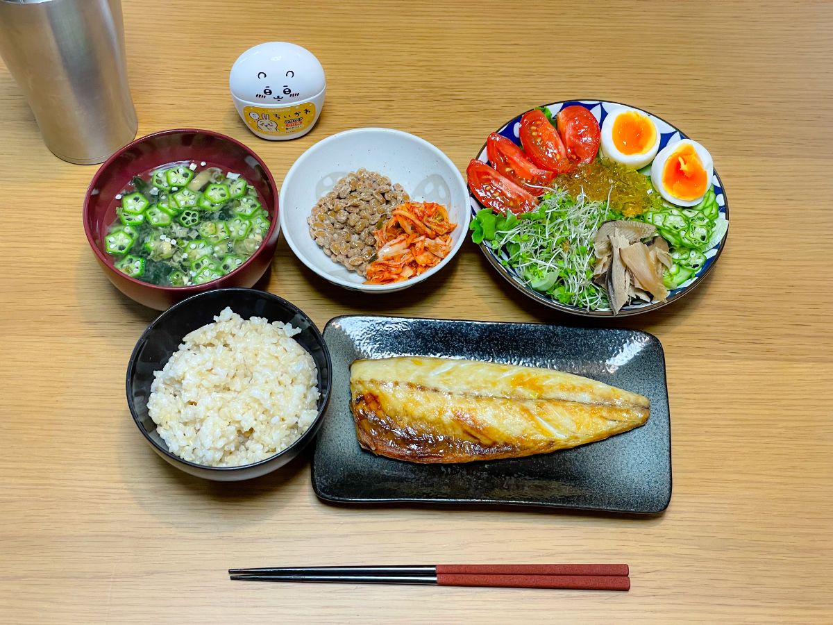 9:00 鯖塩焼き、トマトとオクラとブロッコリースプラウトのサラダ、ゆで卵、納豆キムチ、オクラの味噌汁、玄米ご飯