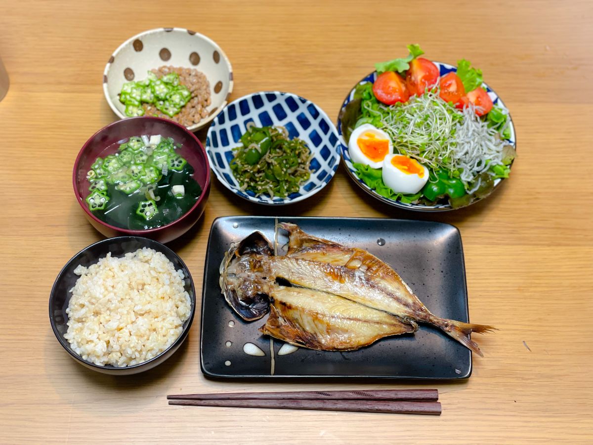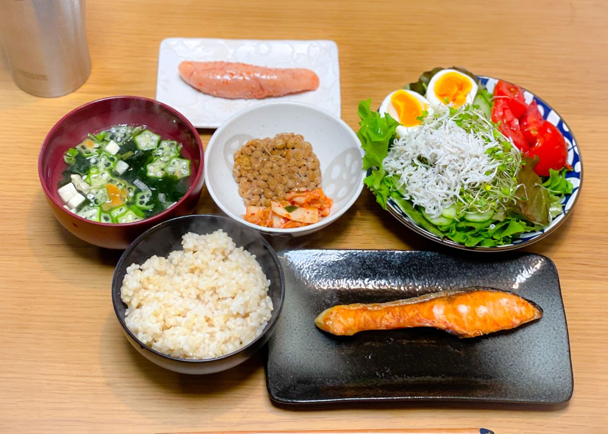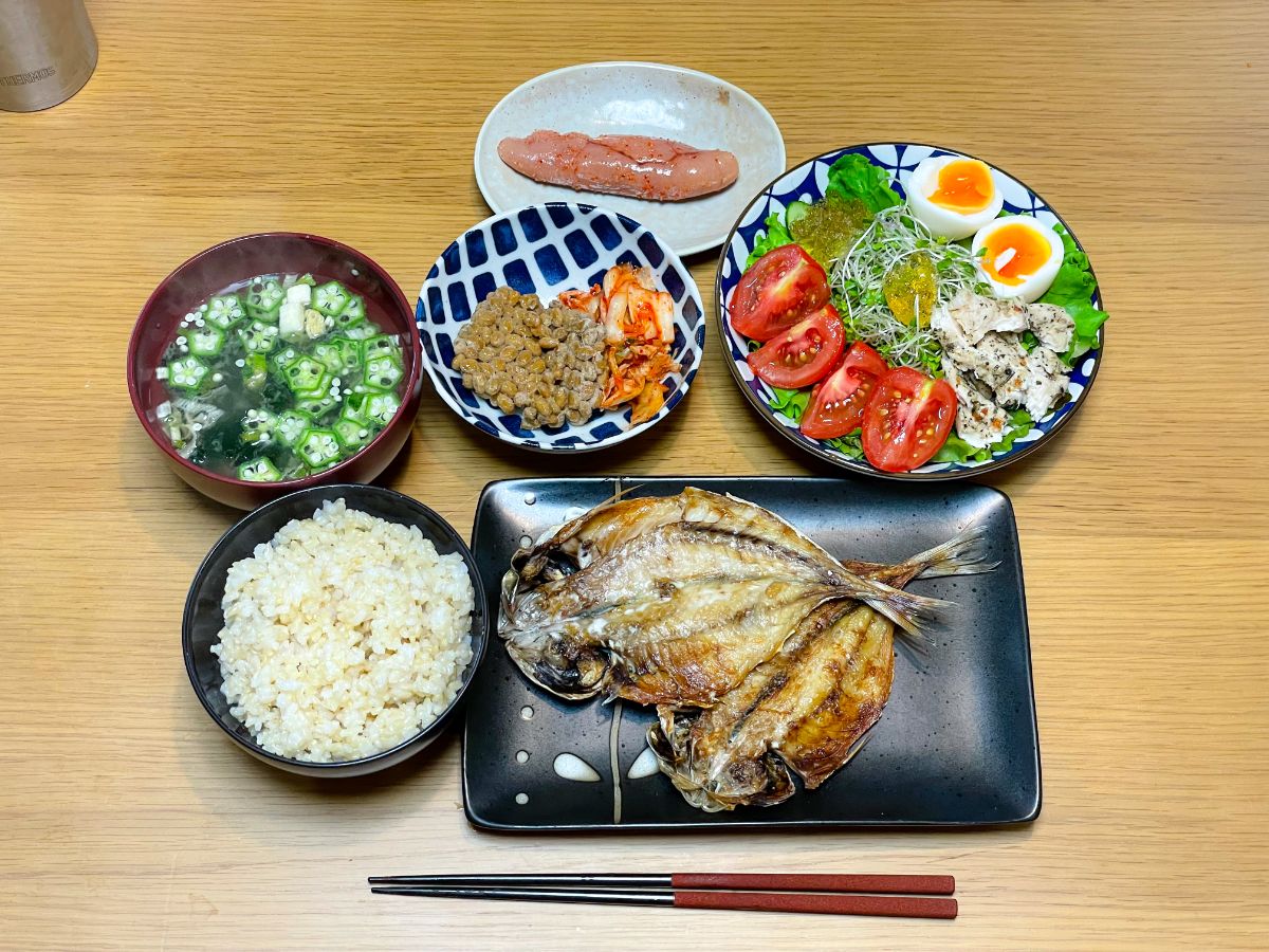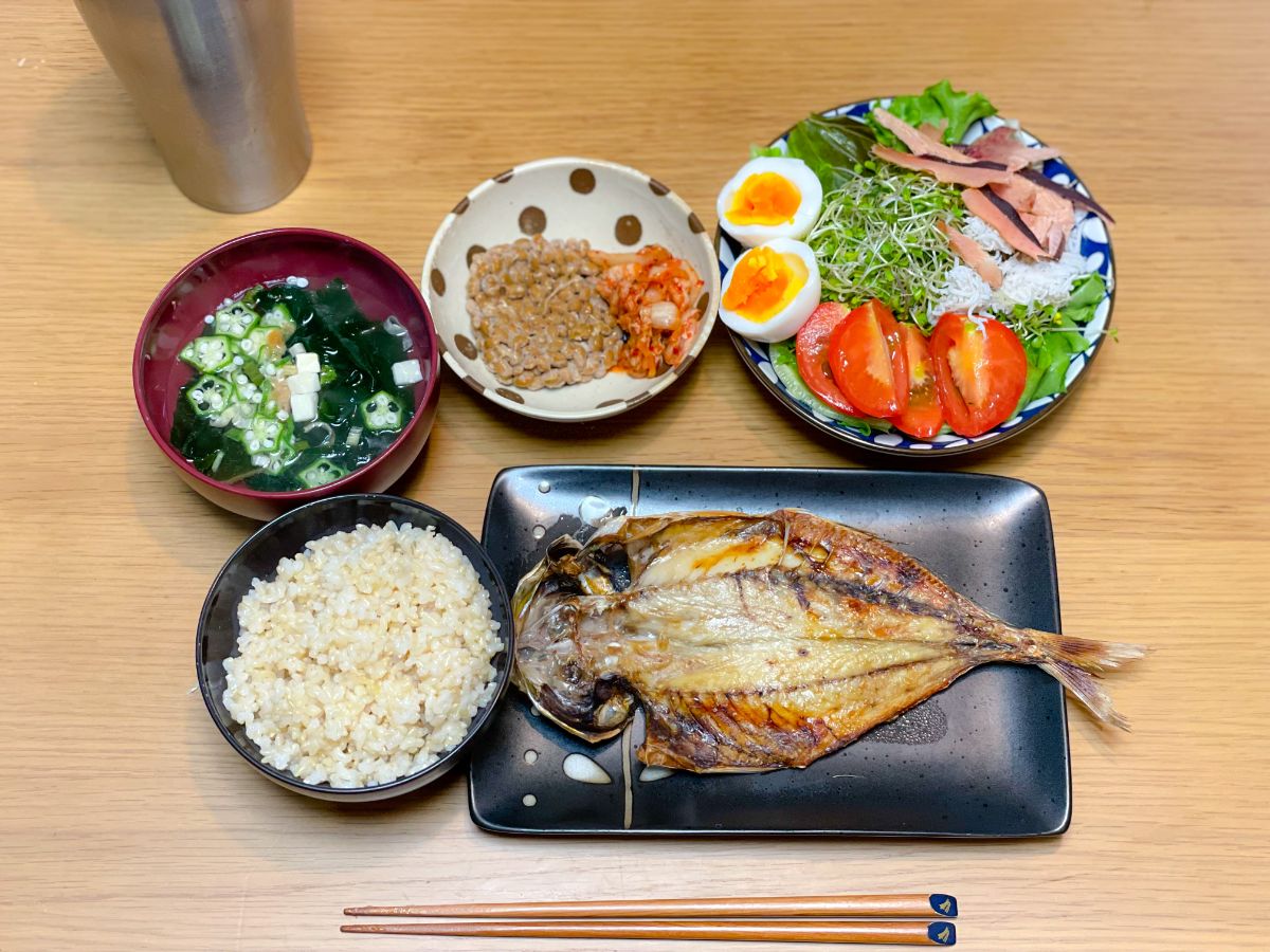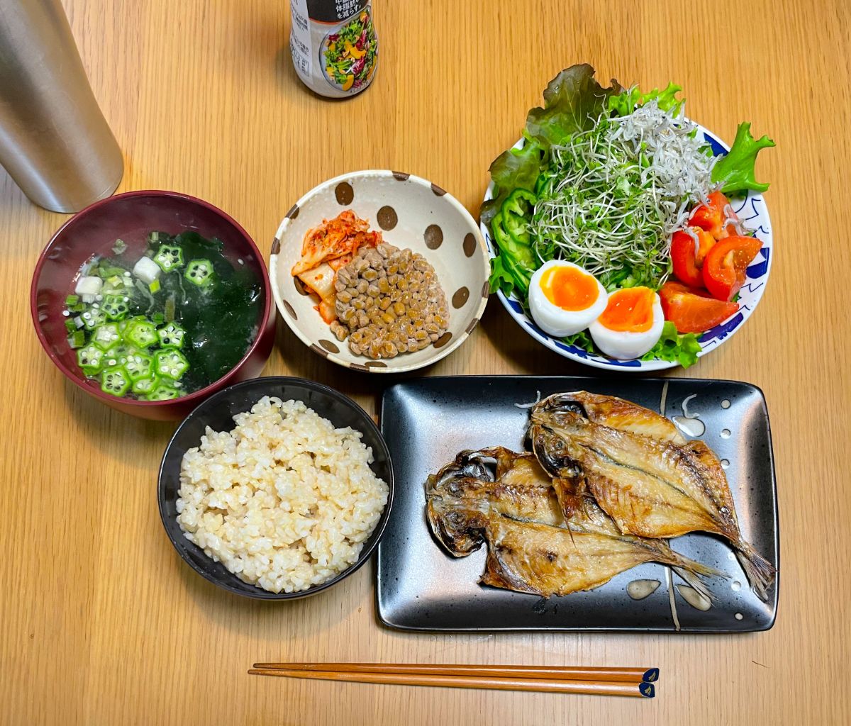 8:30 アジの開き、しらすとトマトのサラダ、ゆで卵、納豆キムチ、わかめとオクラの味噌汁、玄米ご飯