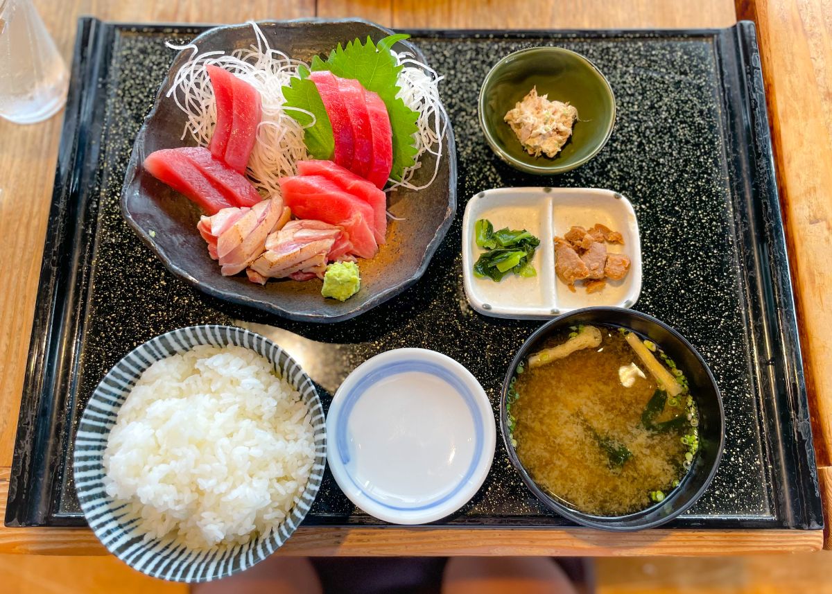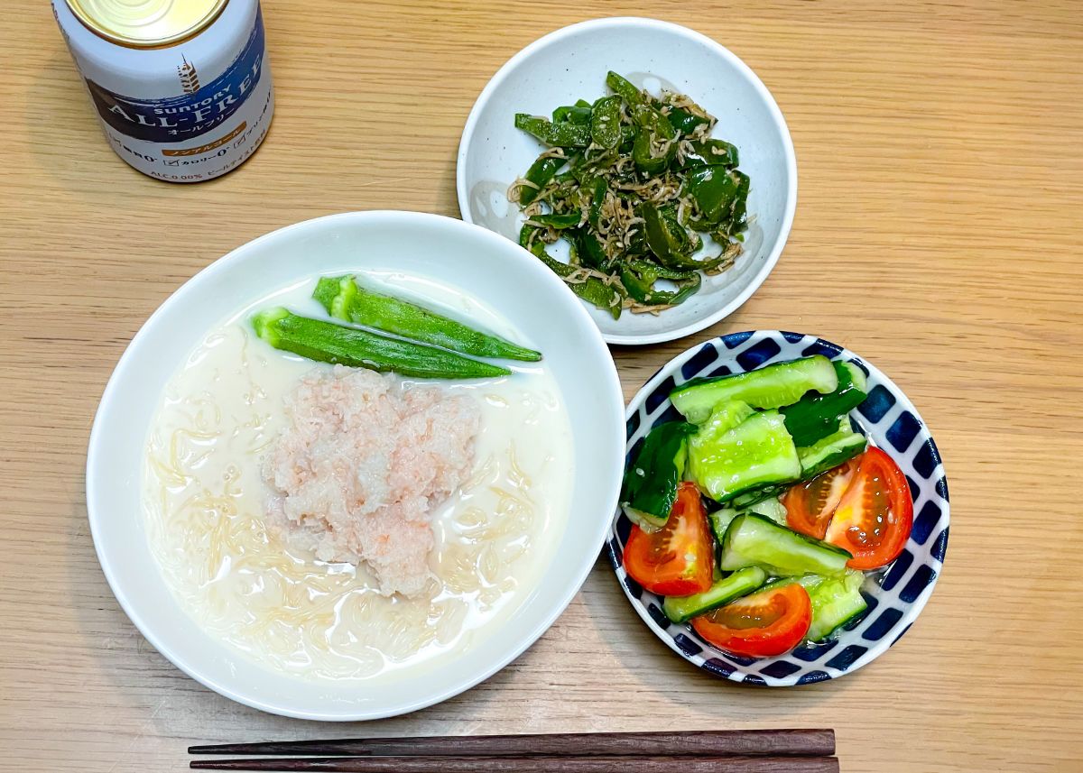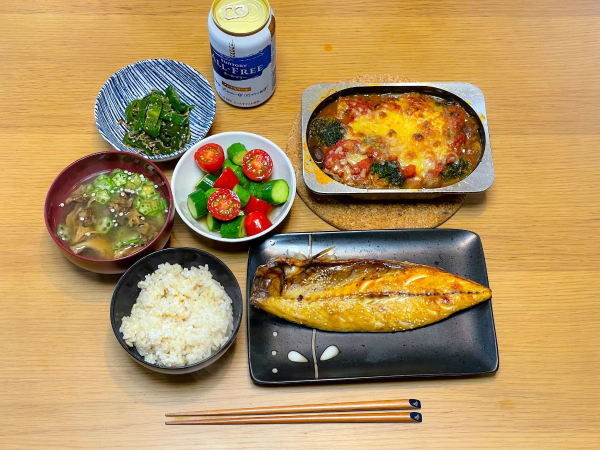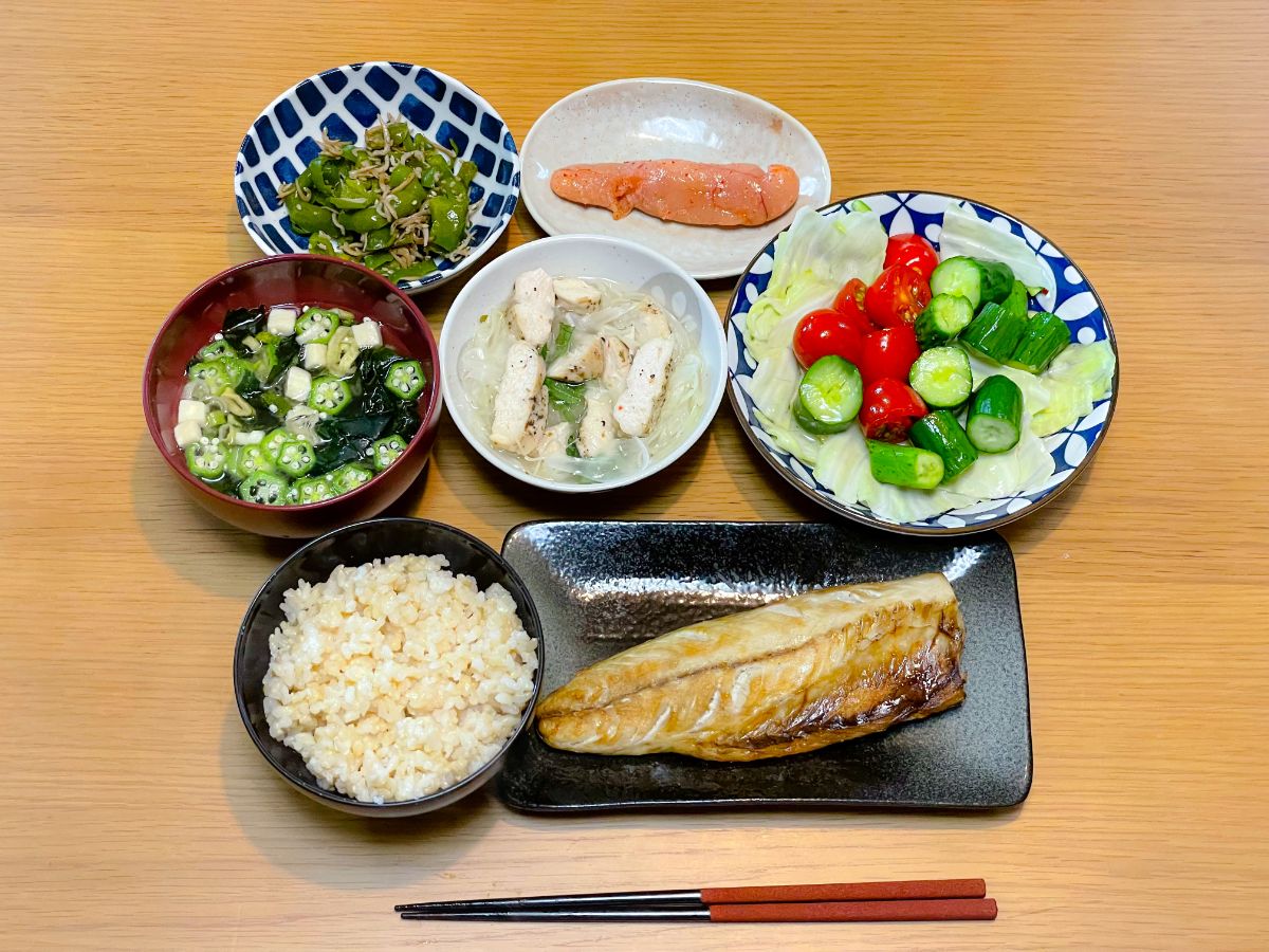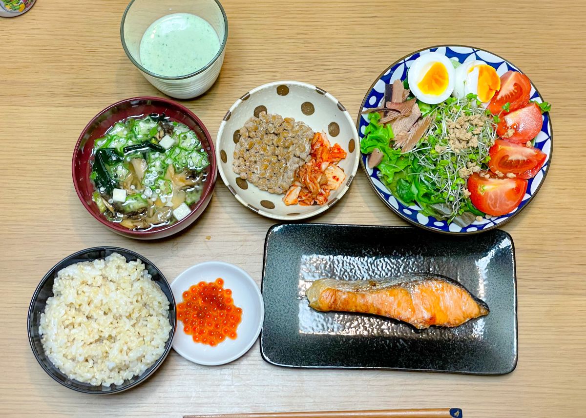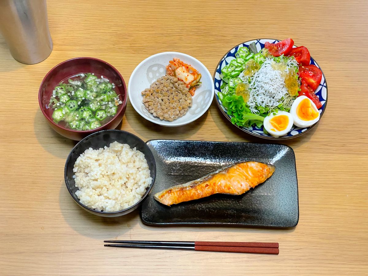 8:30 アジの開き、しらすとトマトのサラダ、ゆで卵、納豆キムチ、わかめとオクラの味噌汁、玄米ご飯