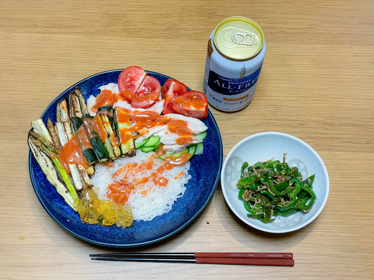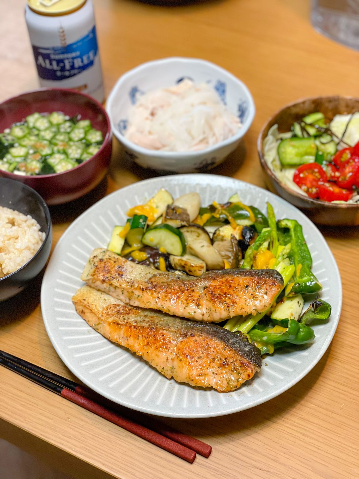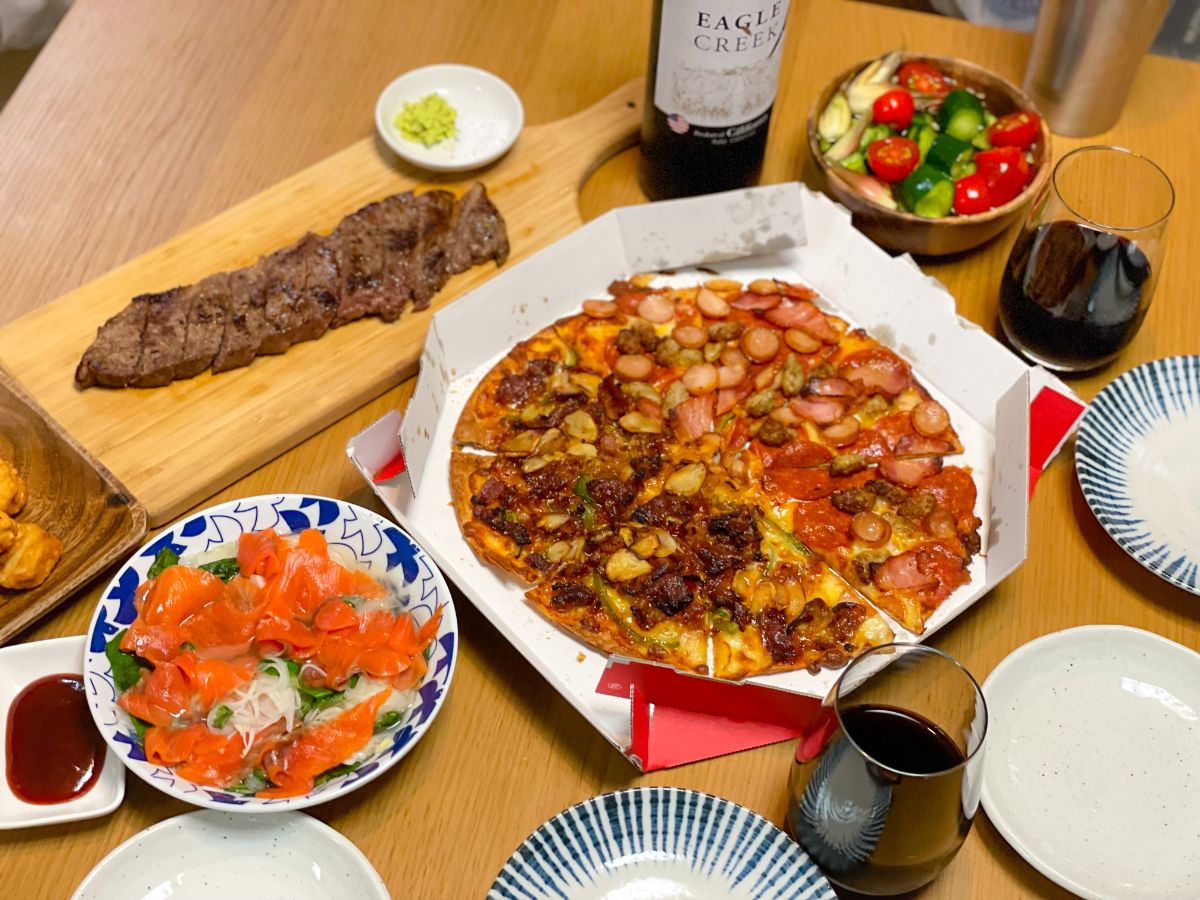 20:00 ピザ、玉ねぎとサーモンマリネ、ステーキ(わさび+塩)、きゅうりととまととみょうがの浅漬、赤ワイン、ハイボール2杯 ※画像は2人分