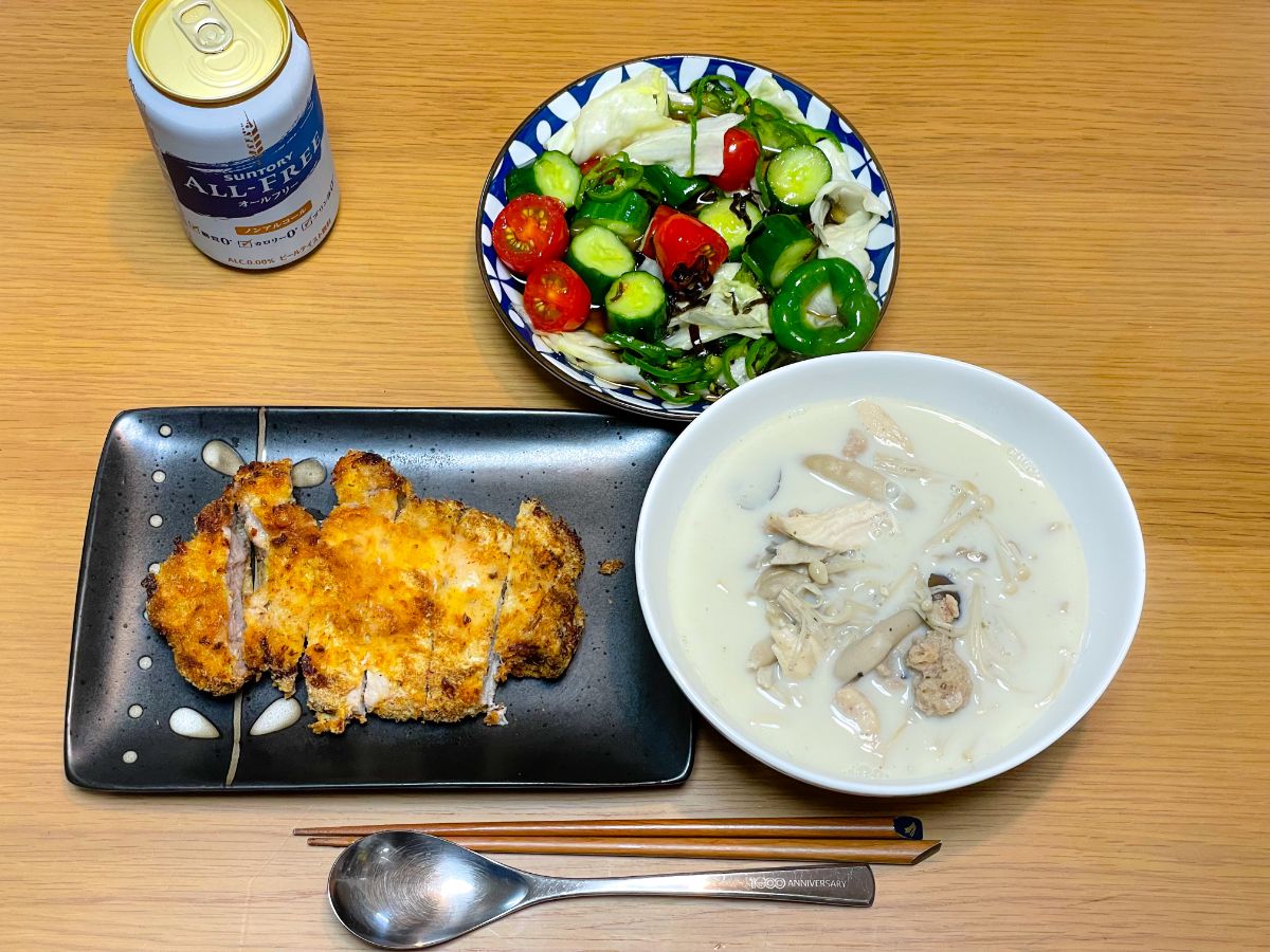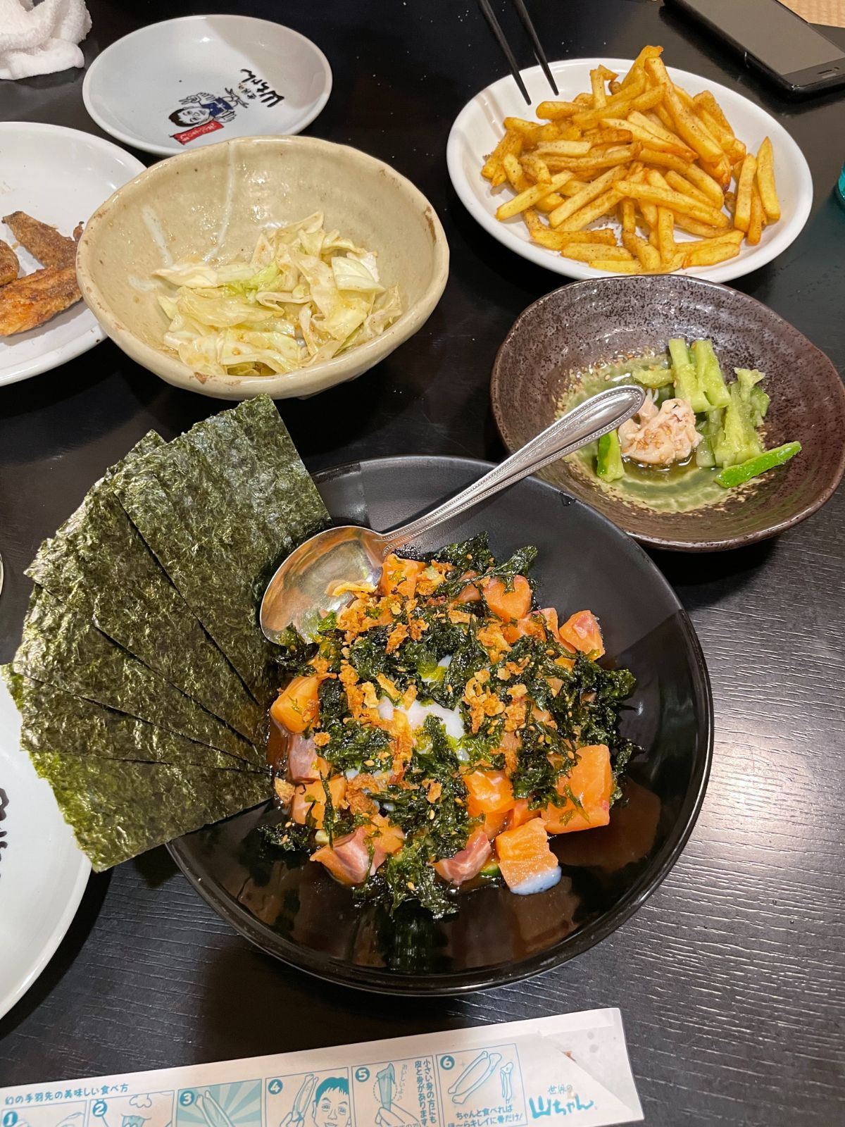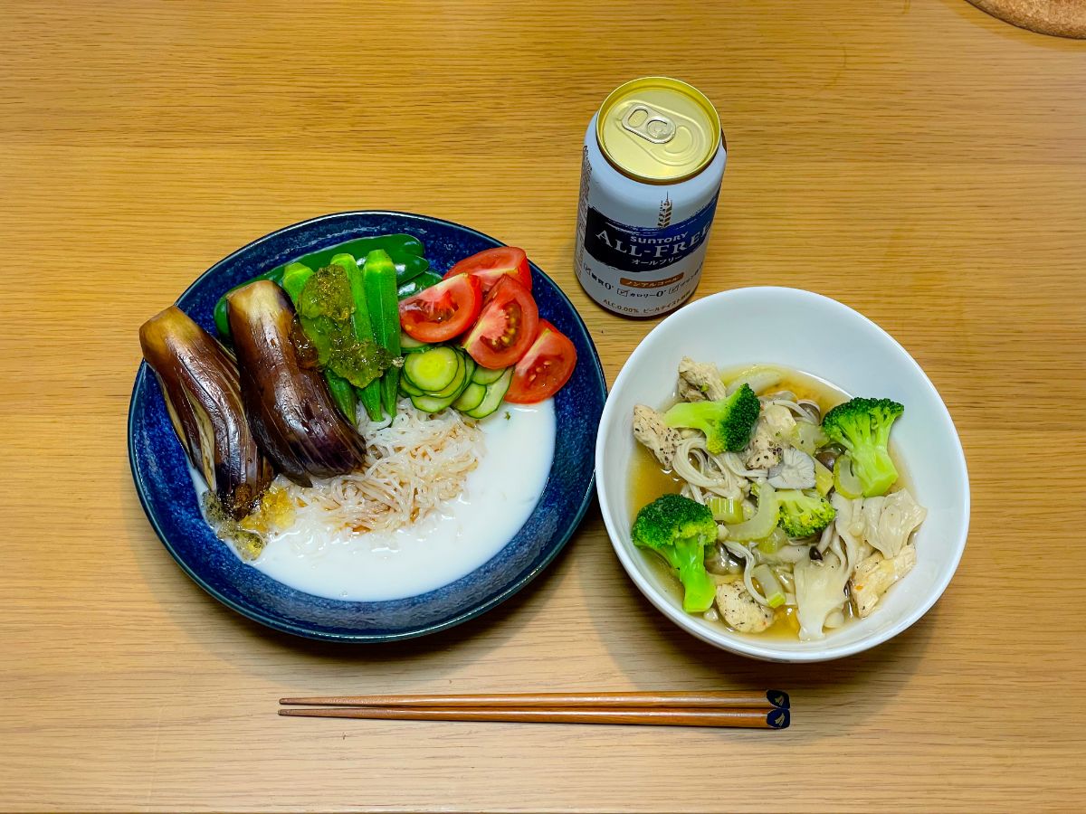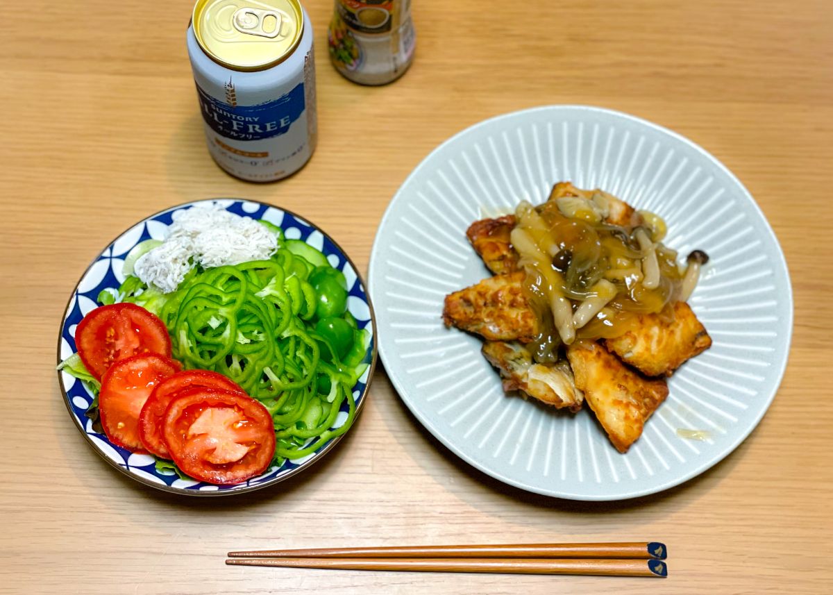 20:00 ピザ、玉ねぎとサーモンマリネ、ステーキ(わさび+塩)、きゅうりととまととみょうがの浅漬、赤ワイン、ハイボール2杯 ※画像は2人分