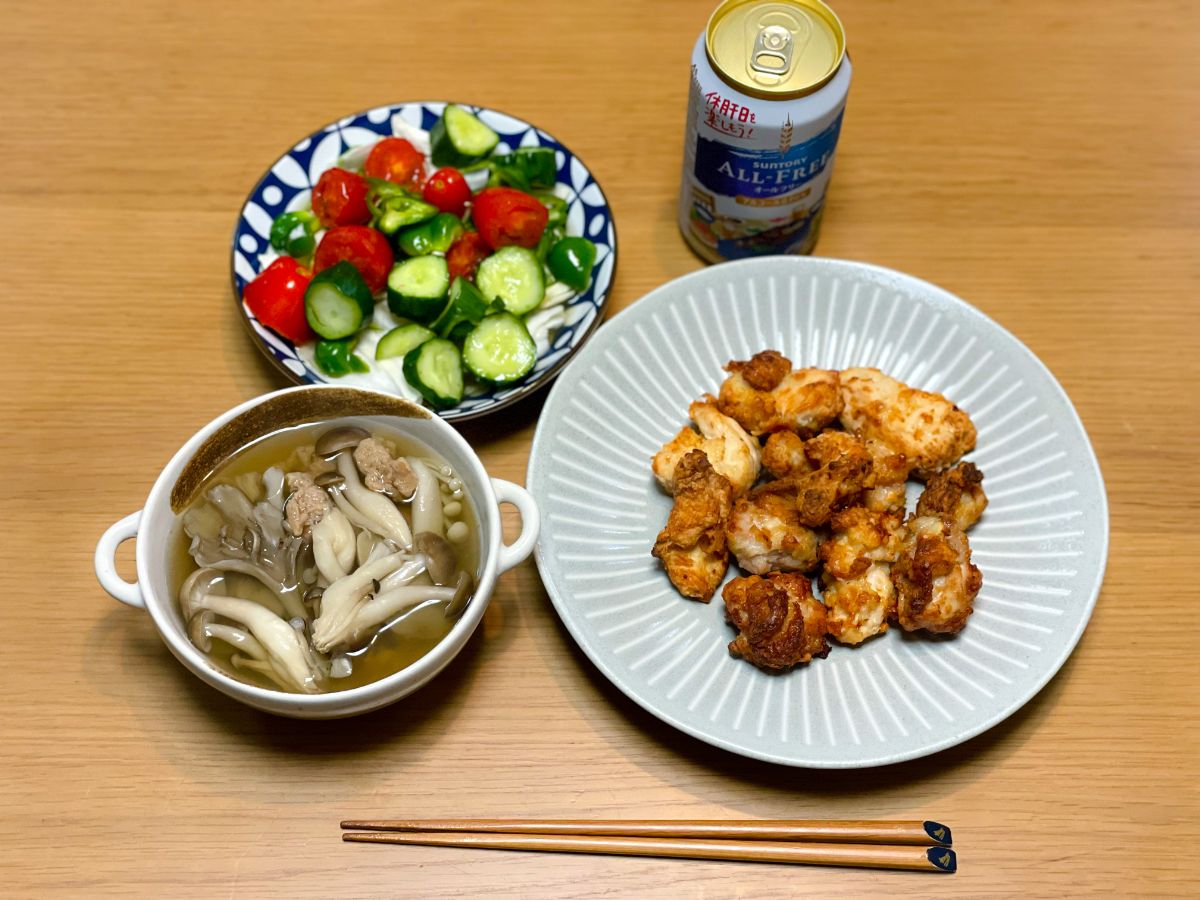 19:30 ノンフライ唐揚げ、ピクルス(キャベツ、トマト、きゅうり、ピーマン)、きのこスープ