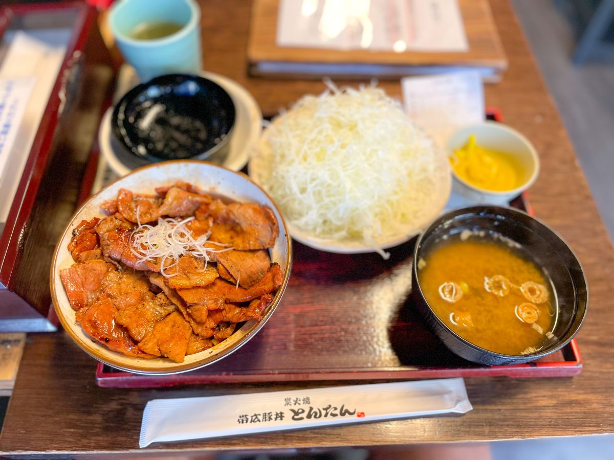 12:30 豚丼(豚赤身肉ご飯小)、キャベツ、味噌汁