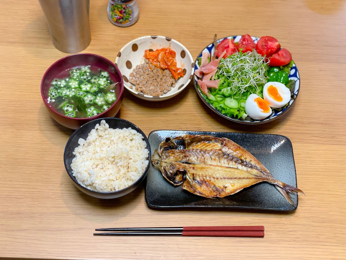 8:00 いつものスムージー、アジの開き、いつものサラダ、ゆで卵、納豆キムチ、わかめとオクラの味噌汁、玄米ご飯